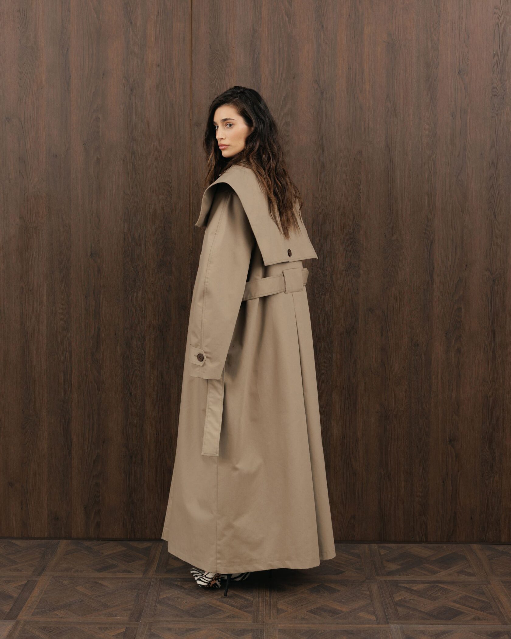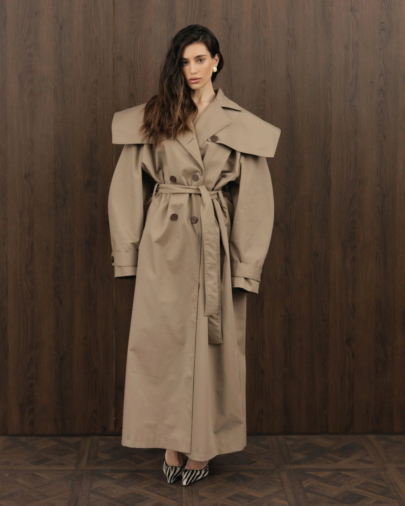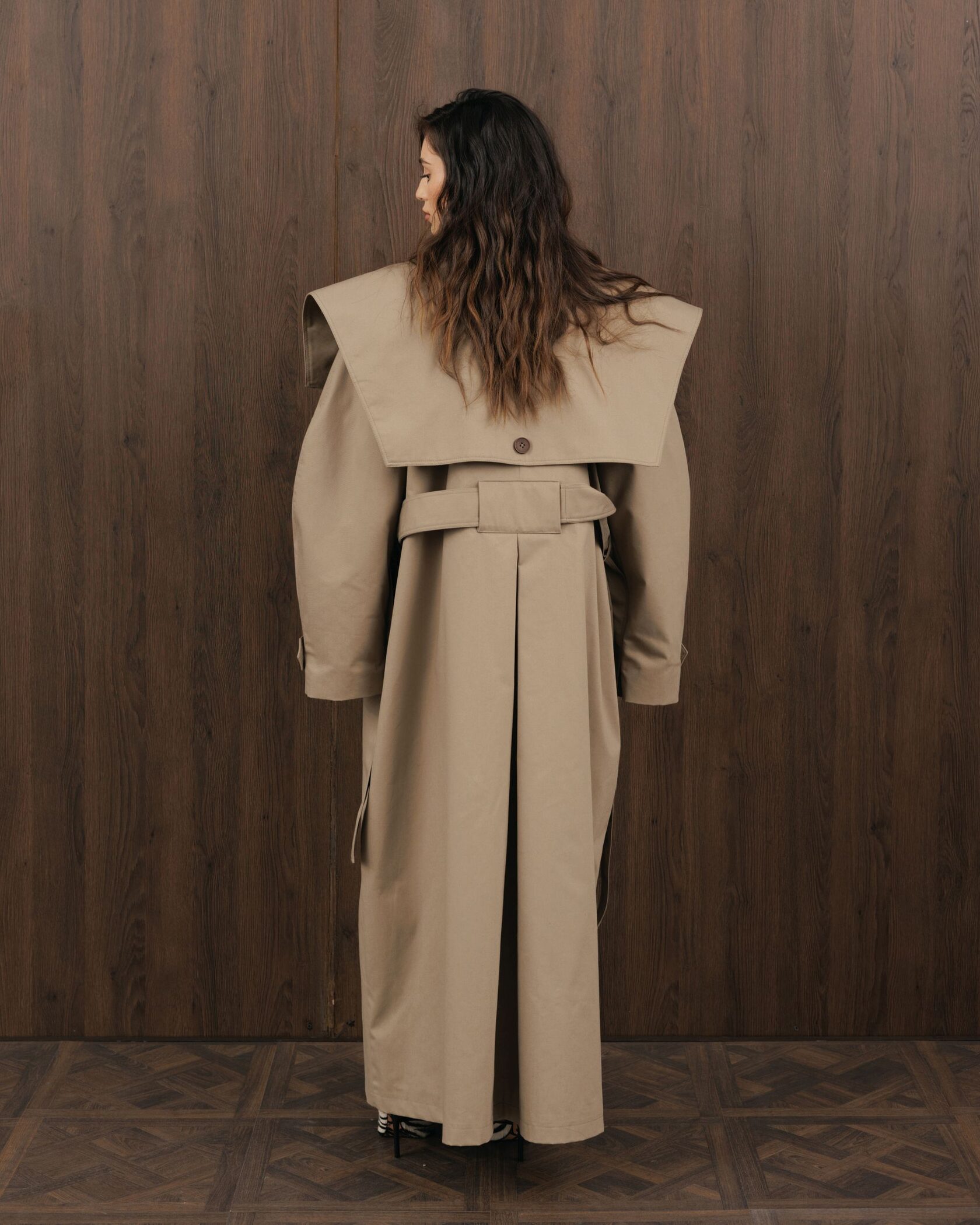 Тренч в элегантном бежевом оттенке — выразительная классика с акцентом на детали. Удлинённый силуэт, широкий воротник и объёмные рукава создают эффектный, архитектурный образ. Пояс подчёркивает талию, а двубортная застёжка добавляет строгости и баланса. Выполнен из ткани с водоотталкивающим покрытием, что делает его идеальным для переменчивой погоды. Идеален для стильных и уверенных образов в межсезонье.