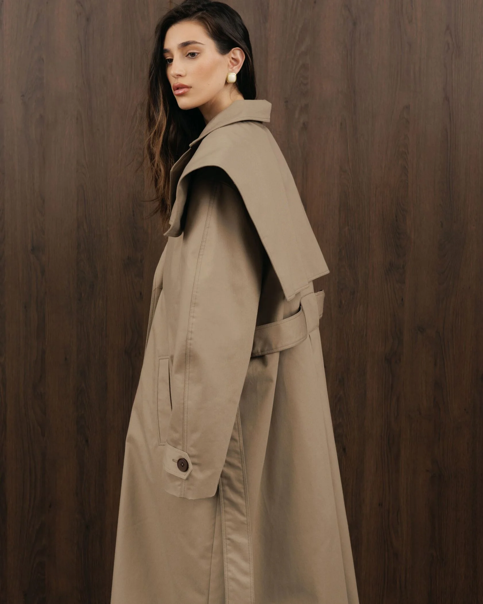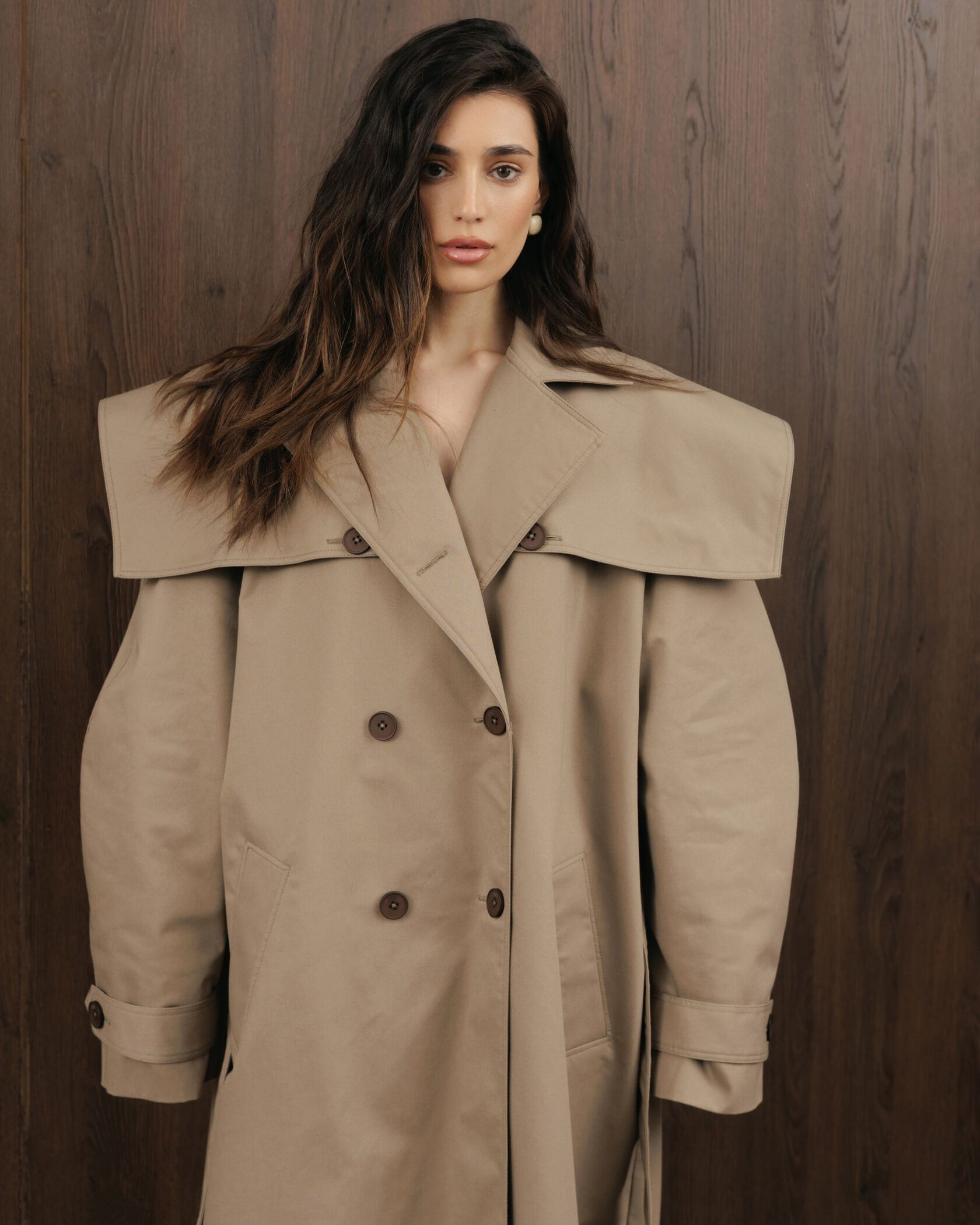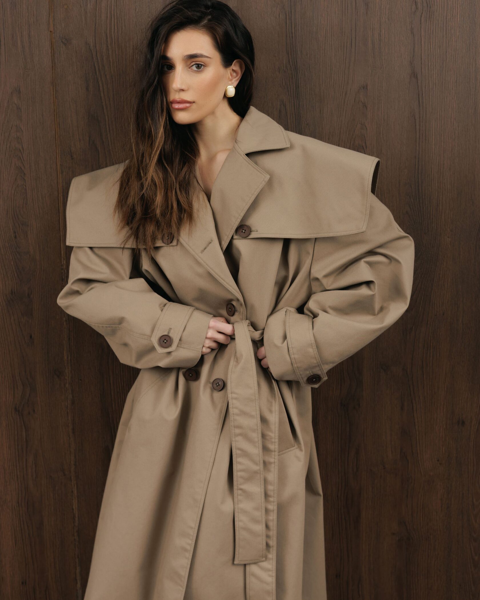 Тренч в элегантном бежевом оттенке — выразительная классика с акцентом на детали. Удлинённый силуэт, широкий воротник и объёмные рукава создают эффектный, архитектурный образ. Пояс подчёркивает талию, а двубортная застёжка добавляет строгости и баланса. Выполнен из ткани с водоотталкивающим покрытием, что делает его идеальным для переменчивой погоды. Идеален для стильных и уверенных образов в межсезонье.