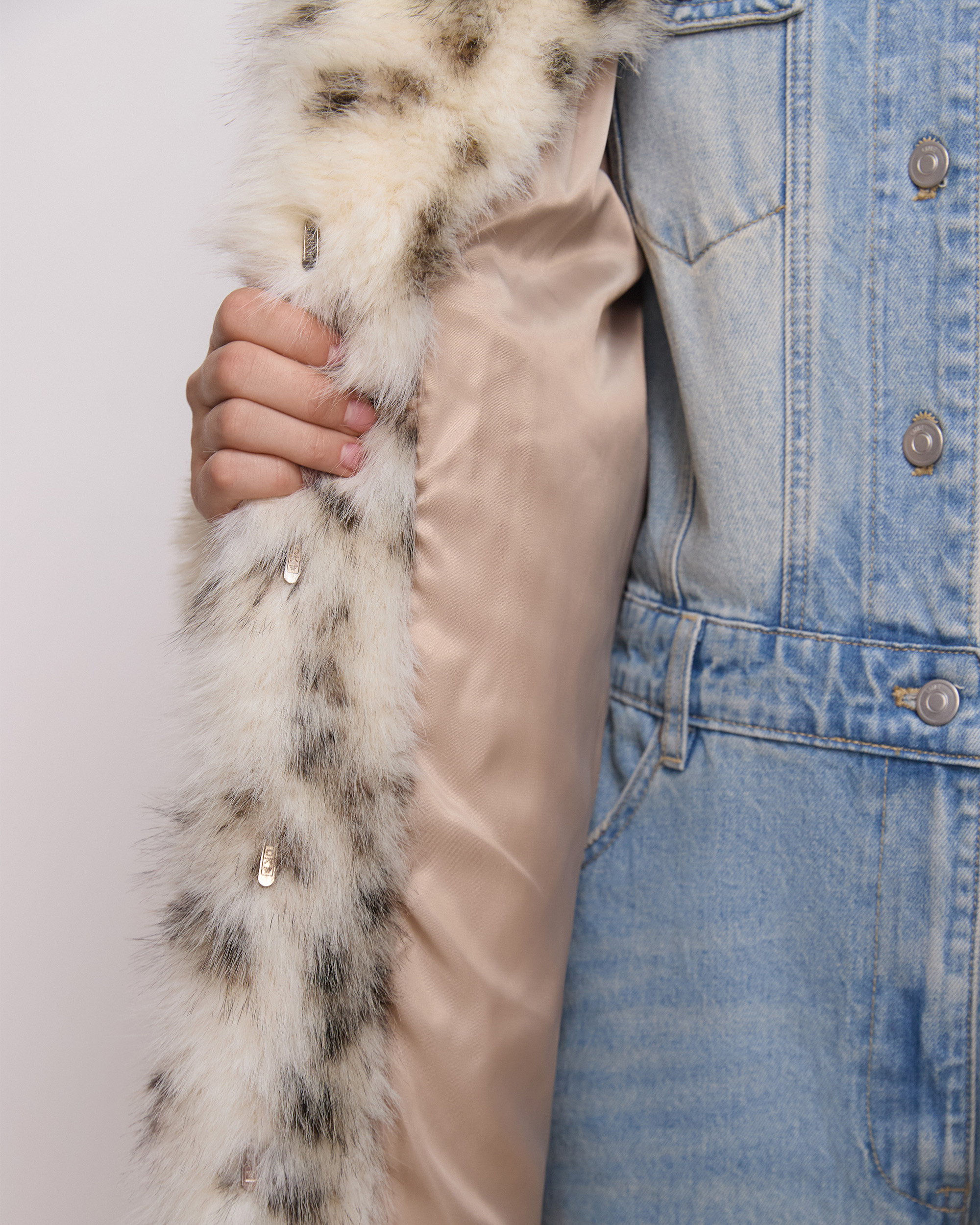 Экошуба выполнена из пушистого экомеха под песца в актуальных оттенках и принтах.