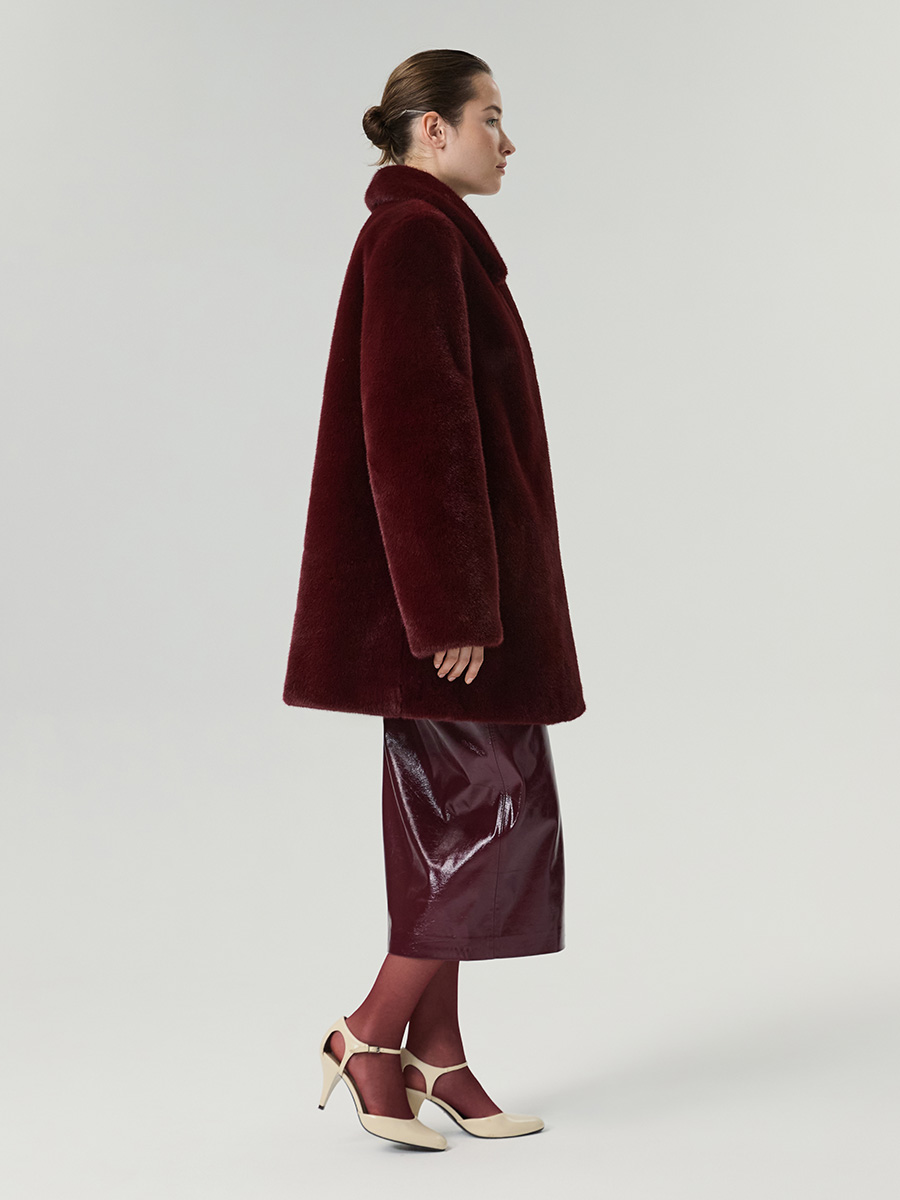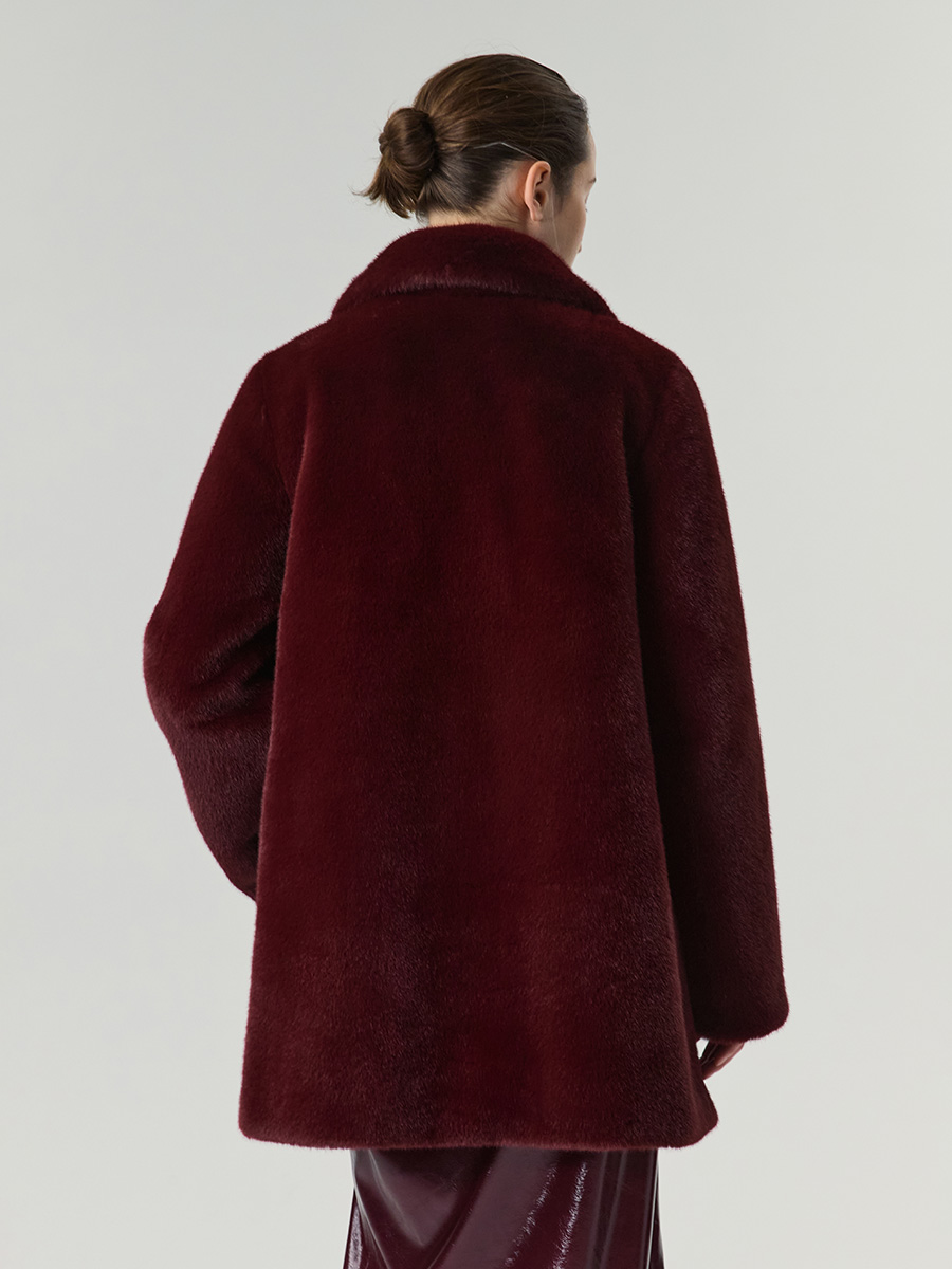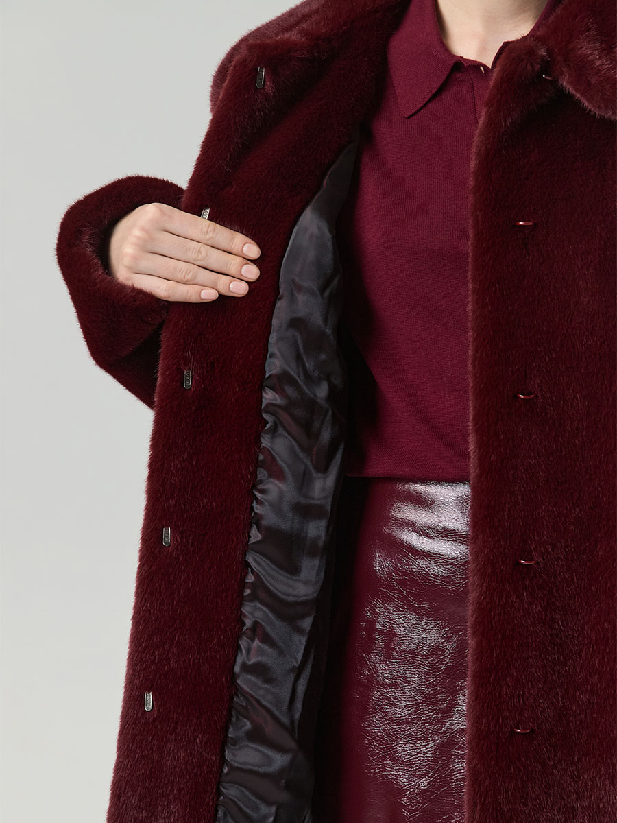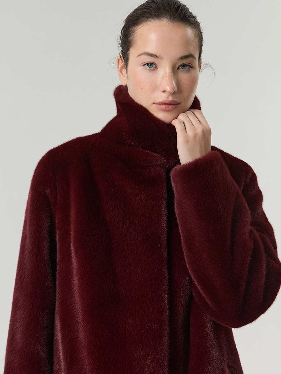 Экошуба выполнена из гладкого экомеха под норку, имеет А-силуэт и аккуратно садится по фигуре.