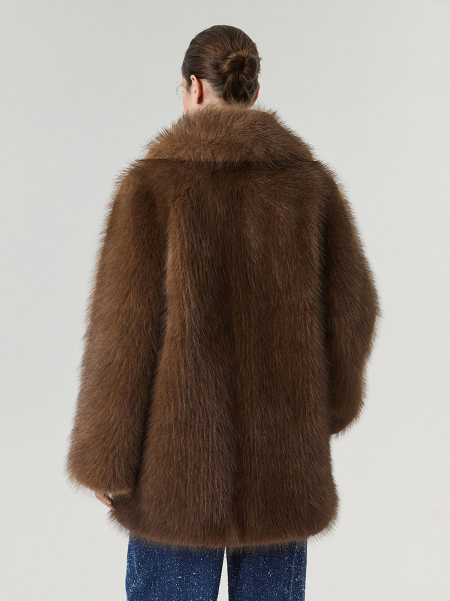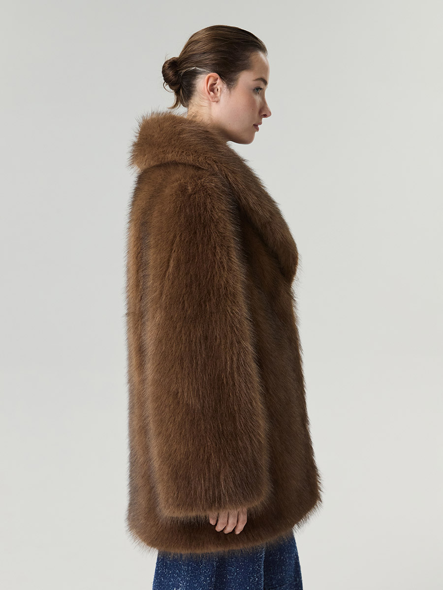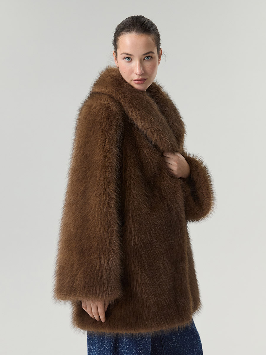 Красивая шуба из экомеха под песца. Аккуратный оверсайз позволяет носить её на объемные свитеры.