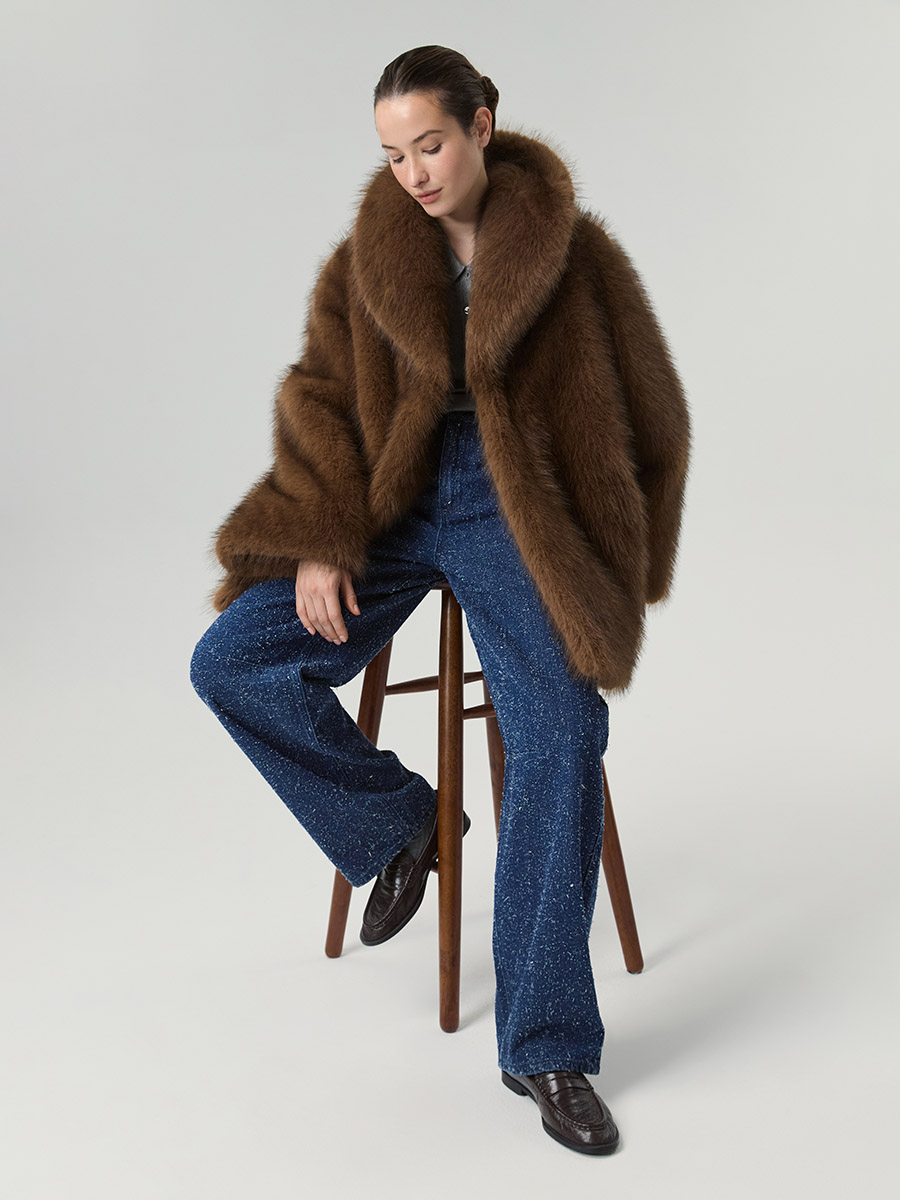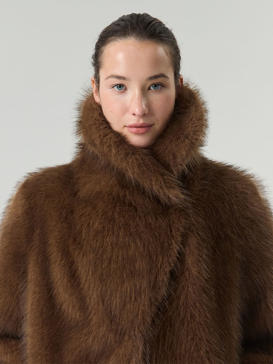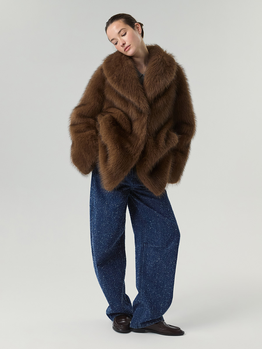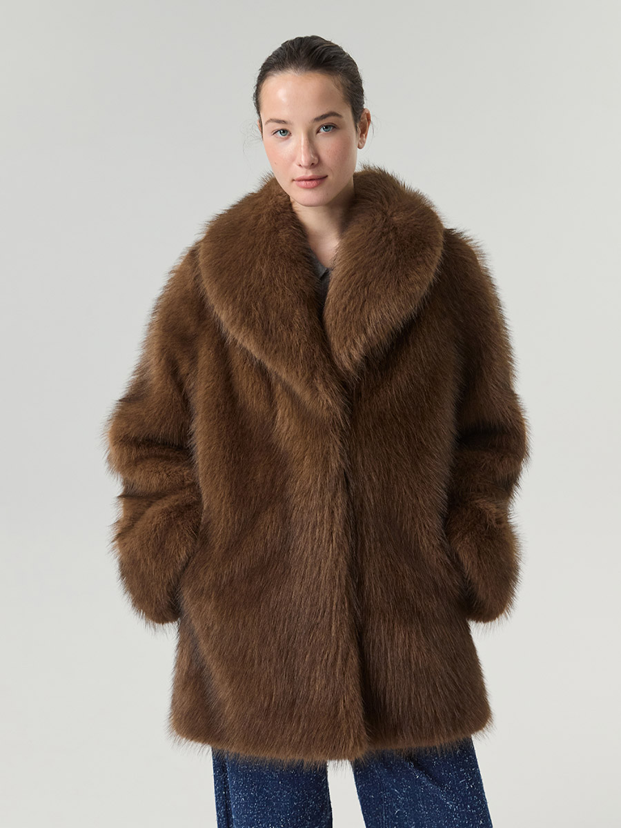 Утрированно широкий шалевый воротник эффектно смотрится в опущенном и поднятом виде. Популярные оттенки и один анималистичный принт подойдут для актуального и базового гардероба.