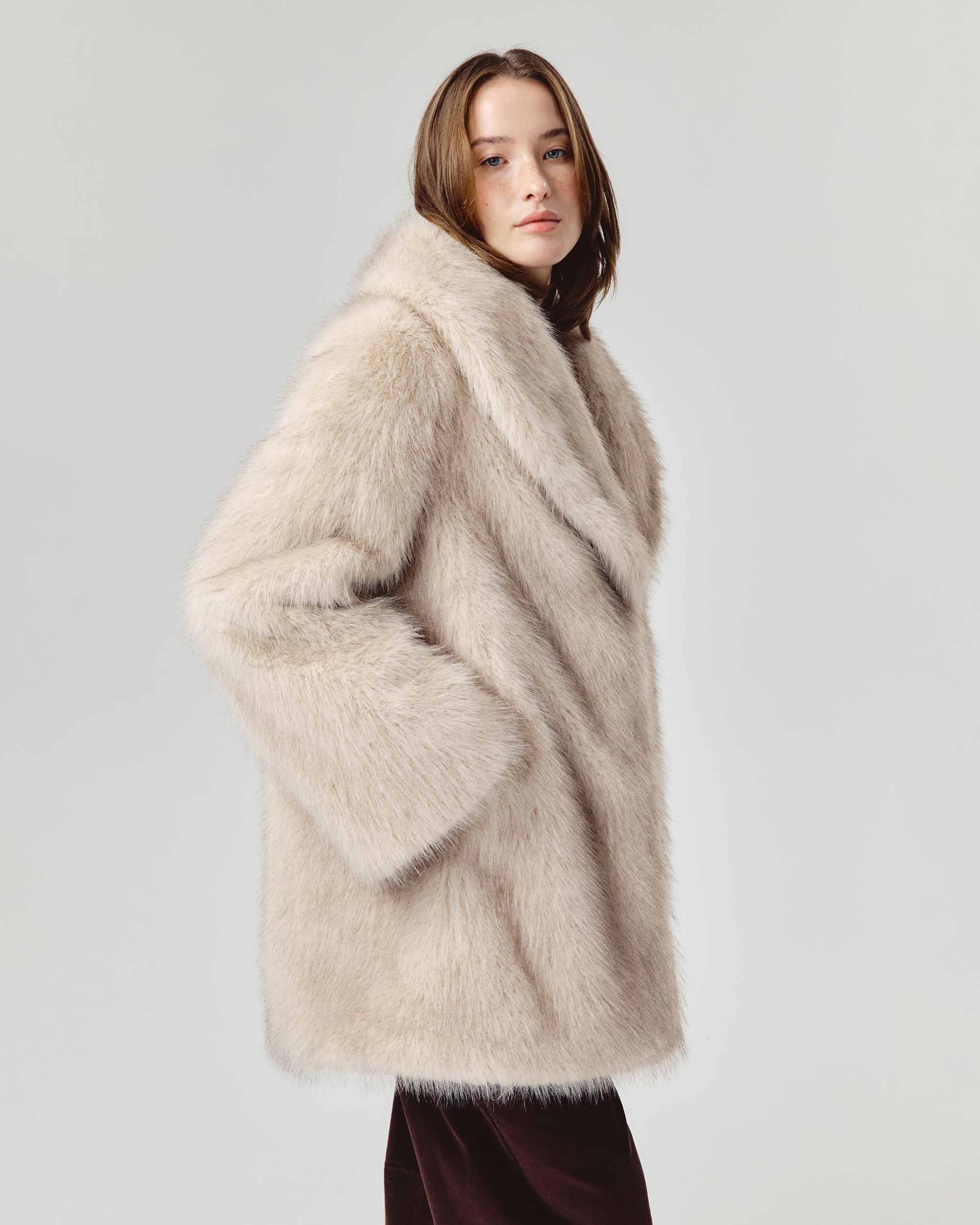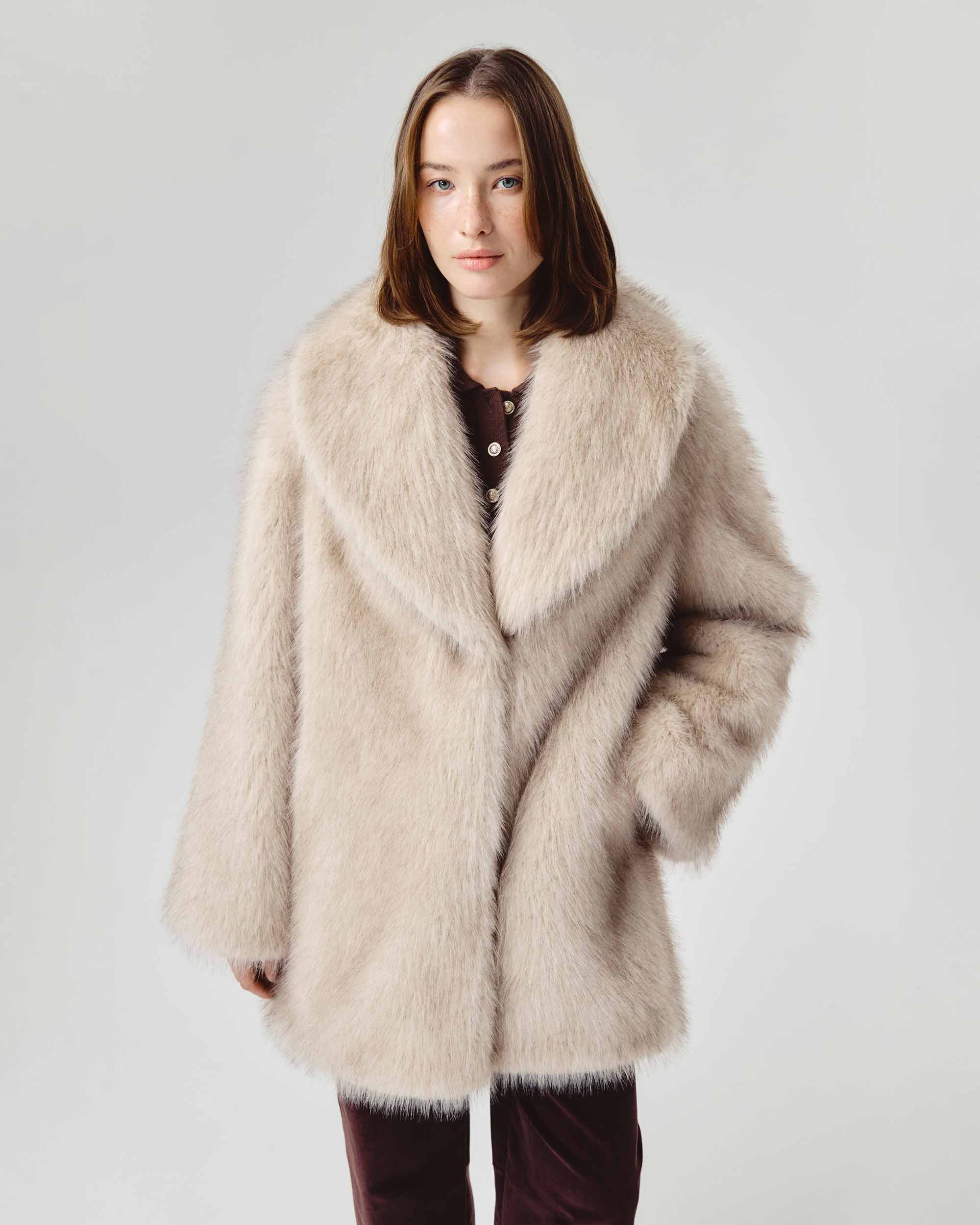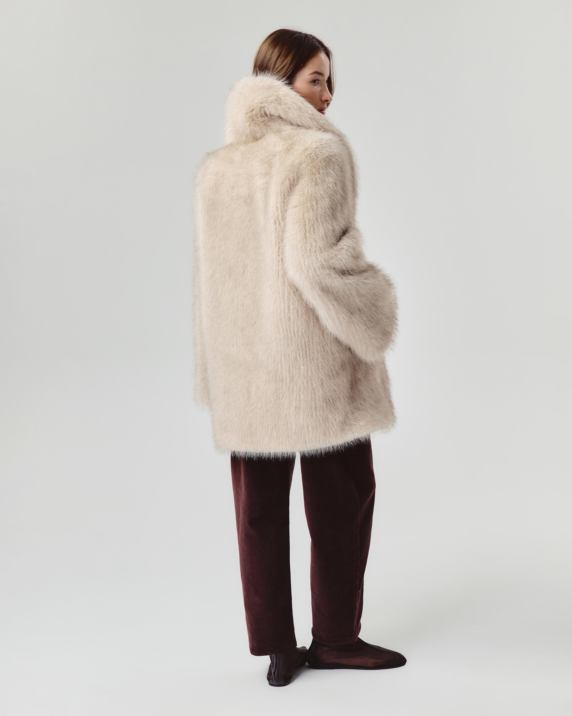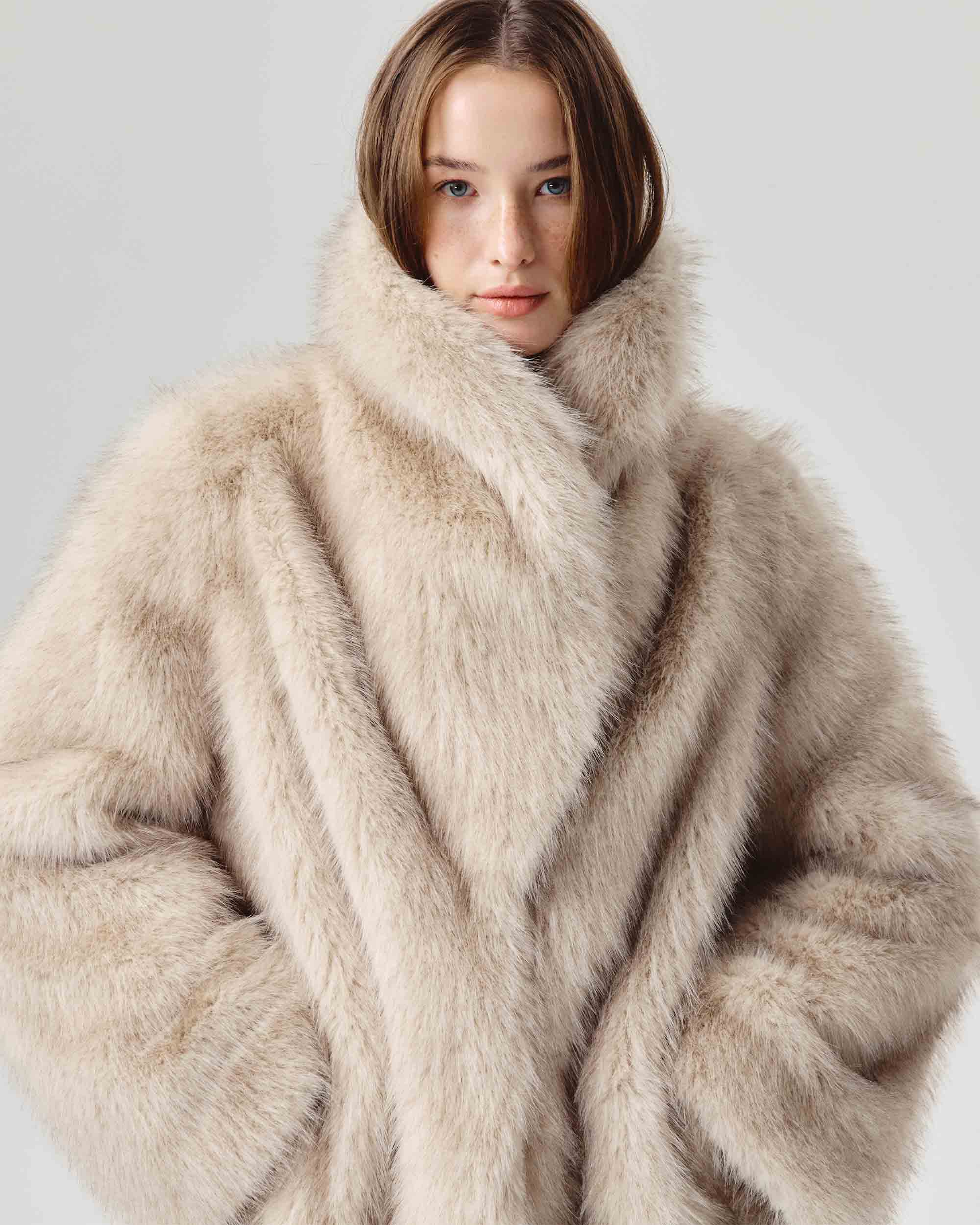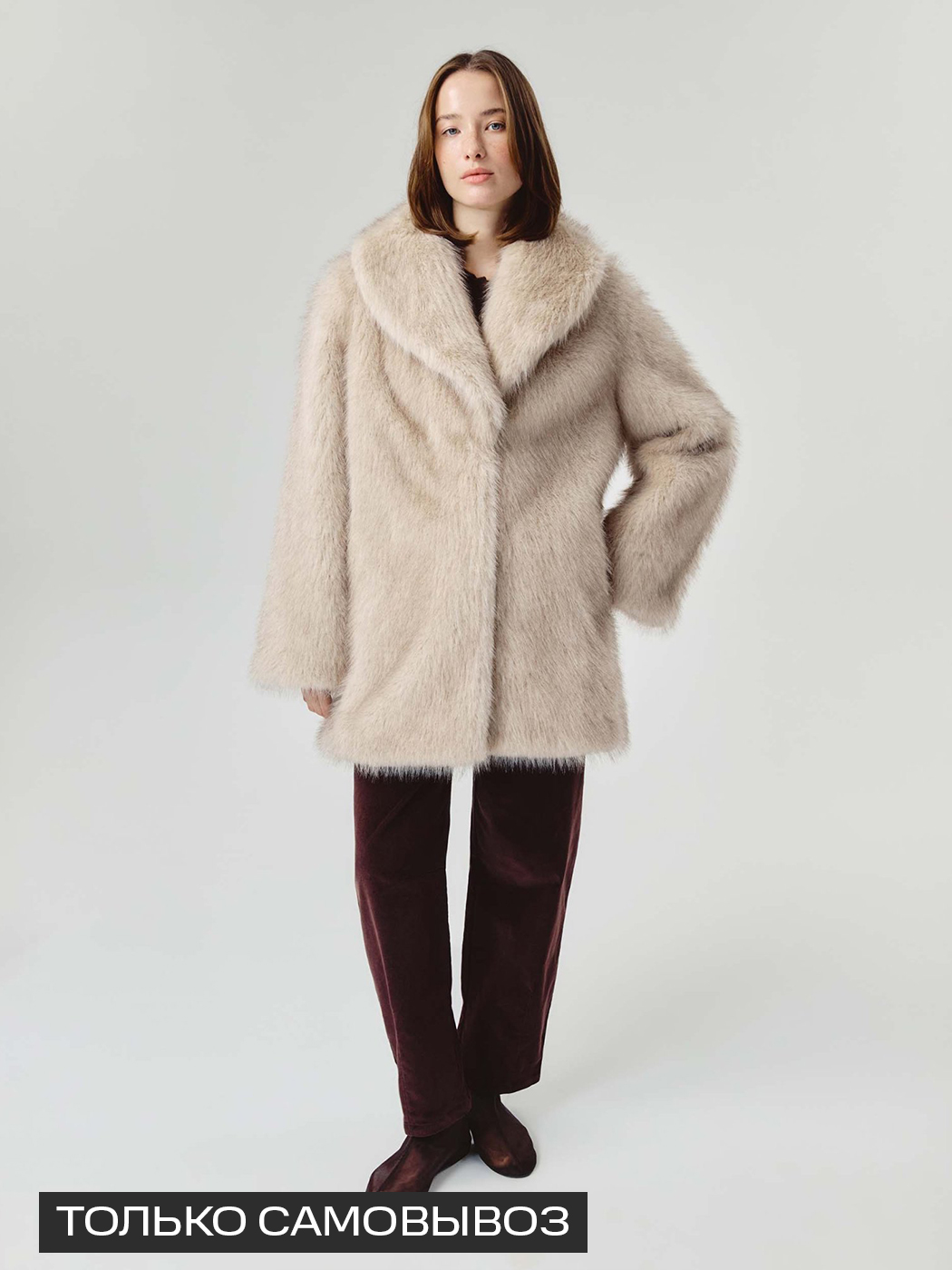 Красивая шуба из экомеха под песца. Аккуратный оверсайз позволяет носить её на объемные свитеры.