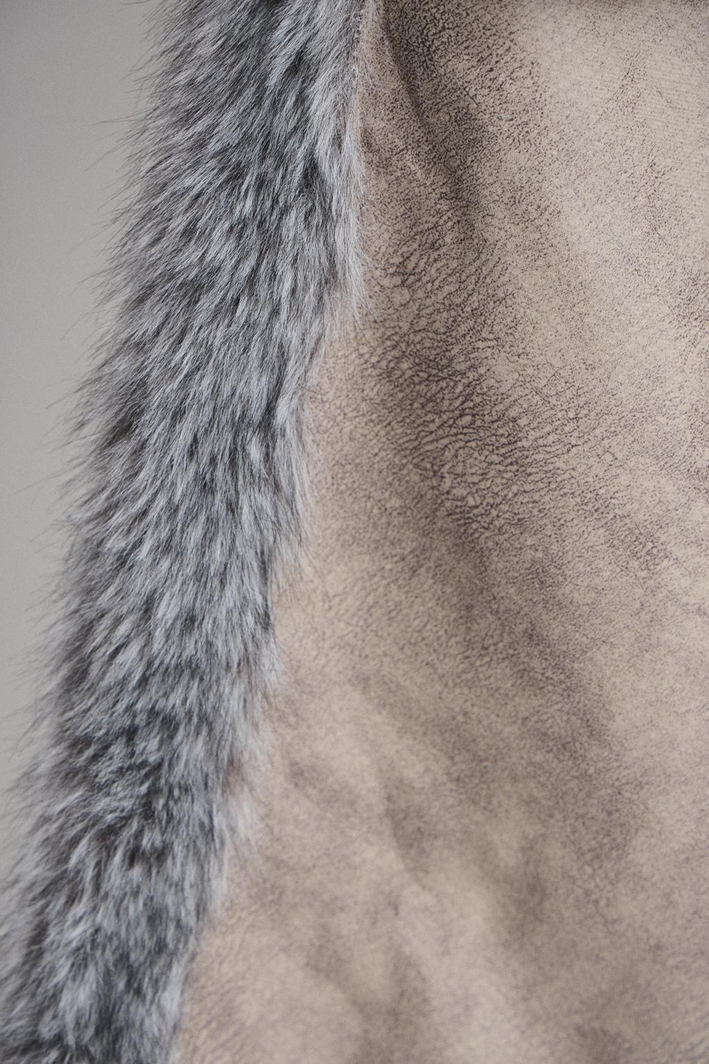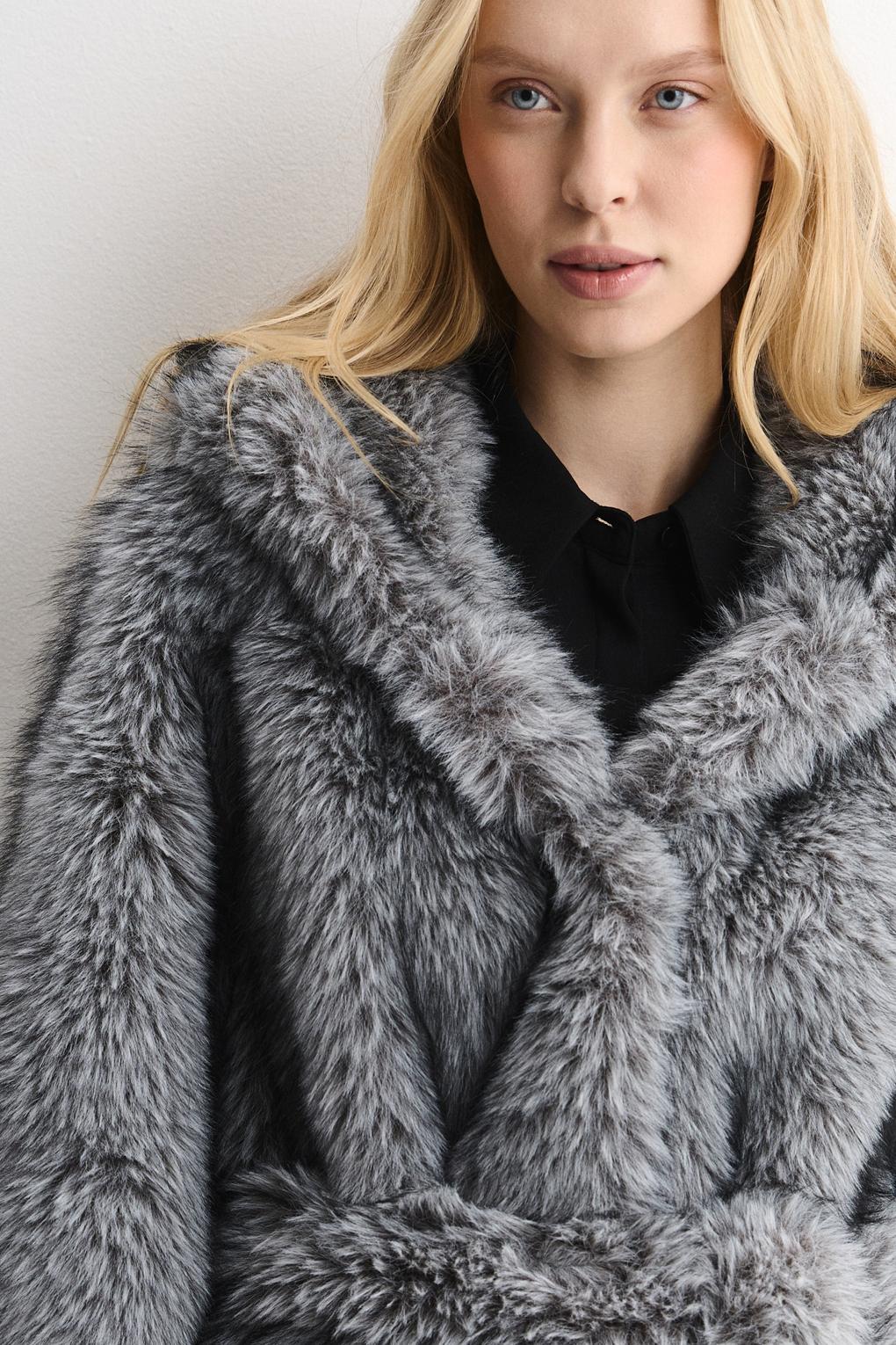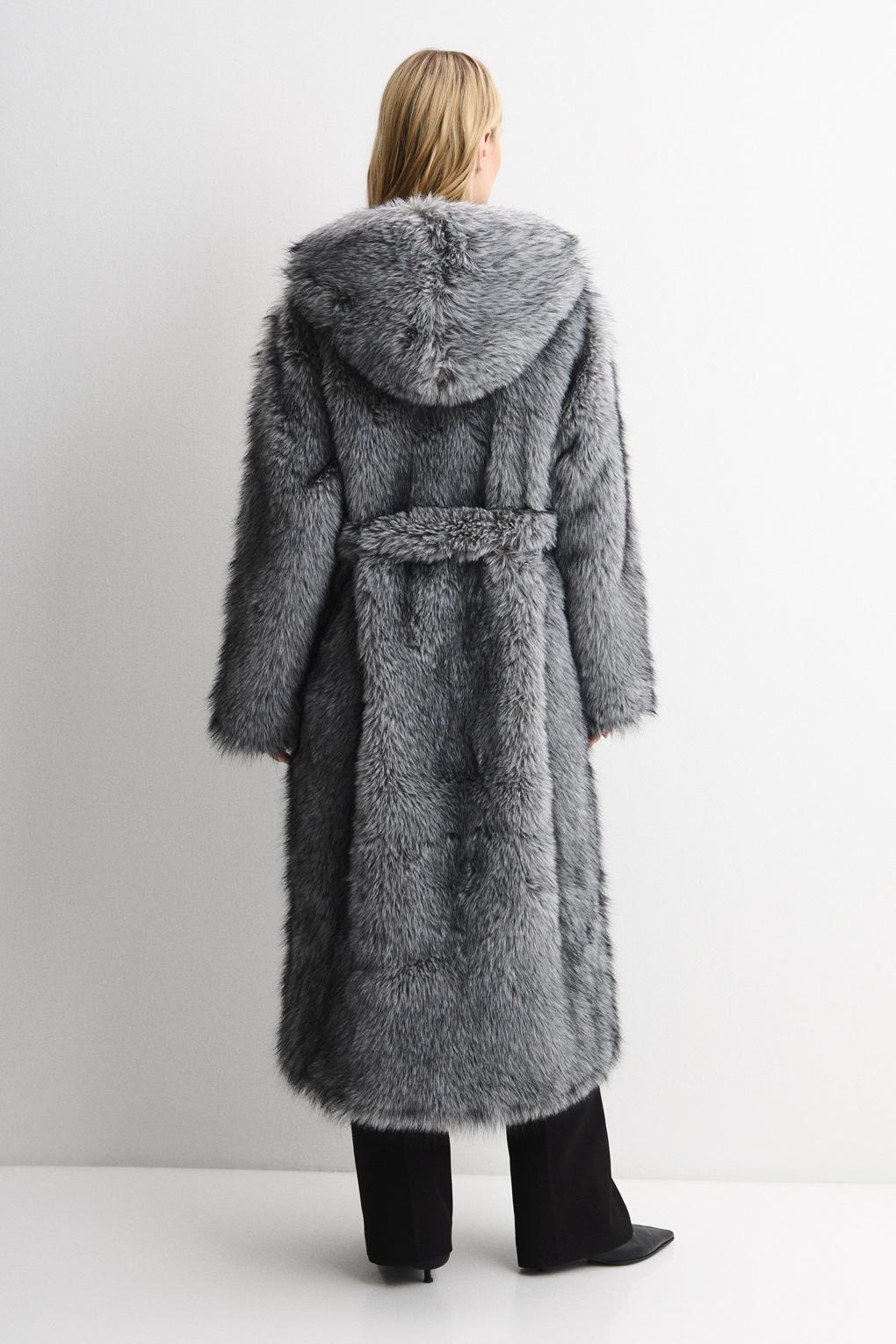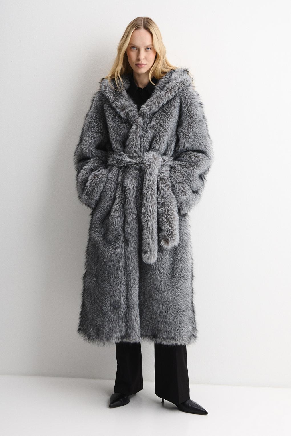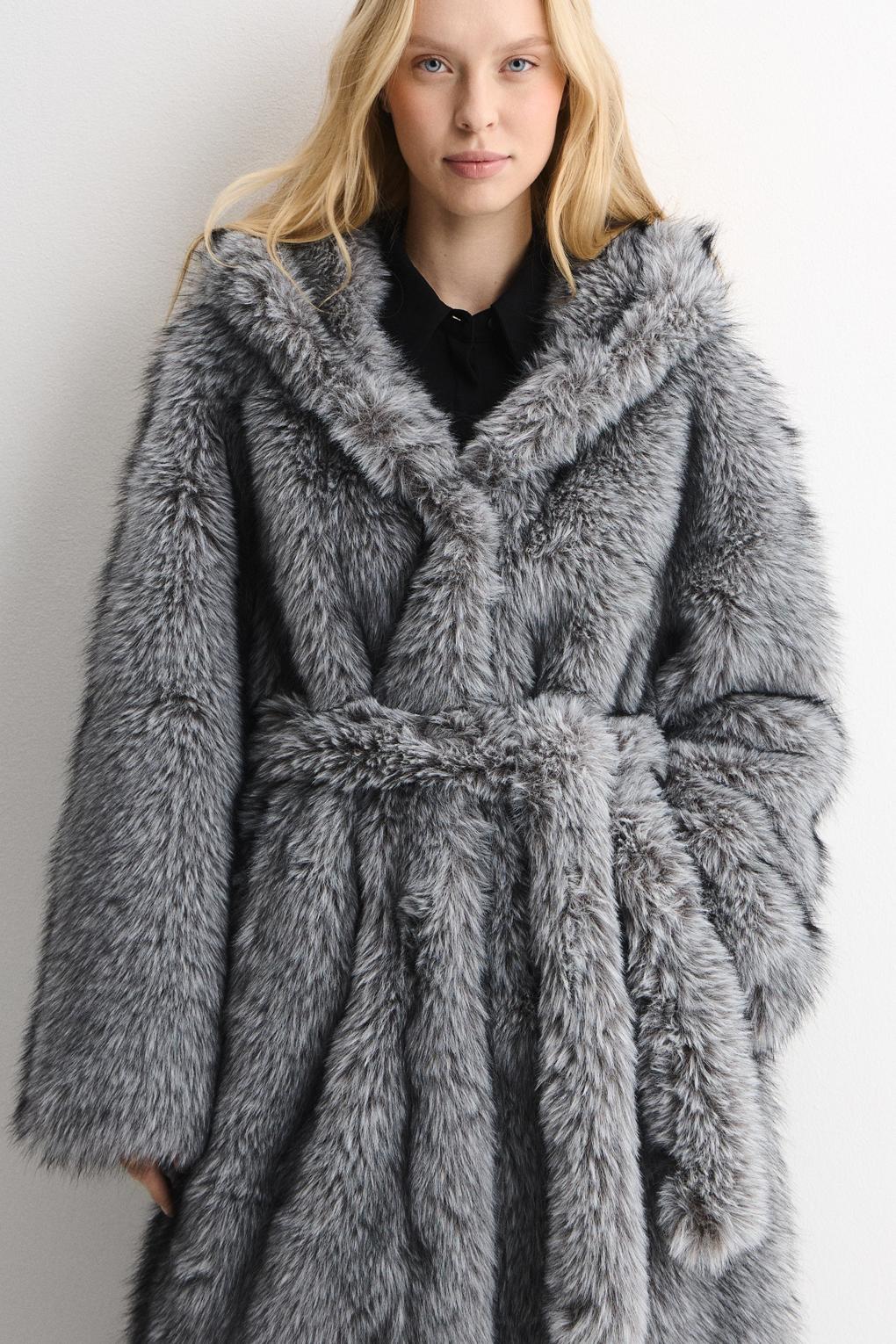 Удлиненная шуба выполнена из искусственного меха. Детали: застежки нет, отложной воротник, несъемный капюшон, 2 кармана, пояс в комплекте.