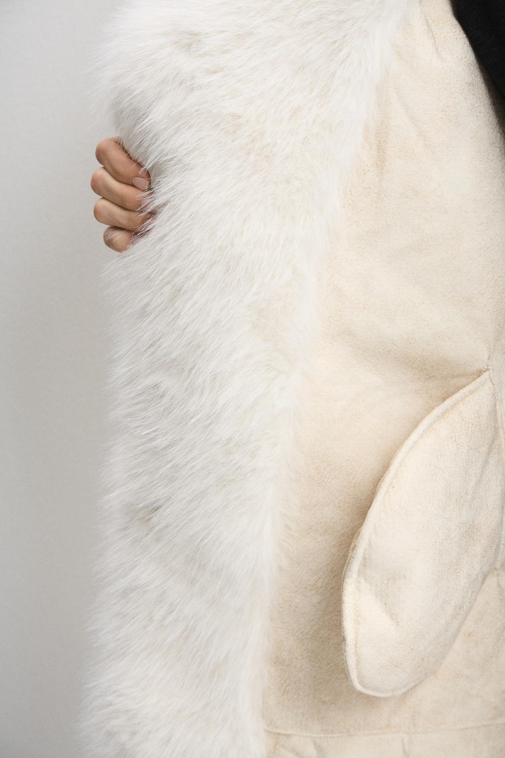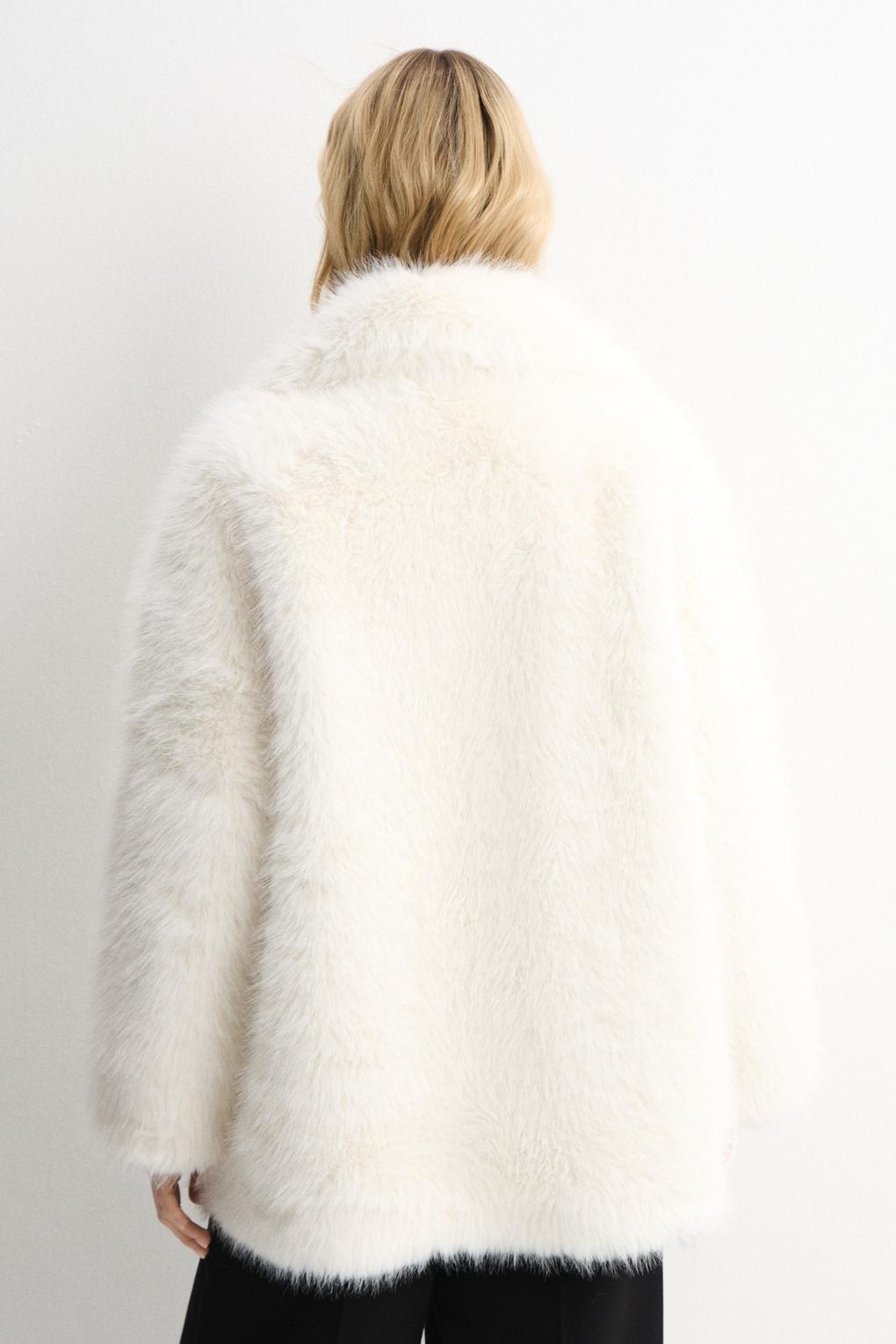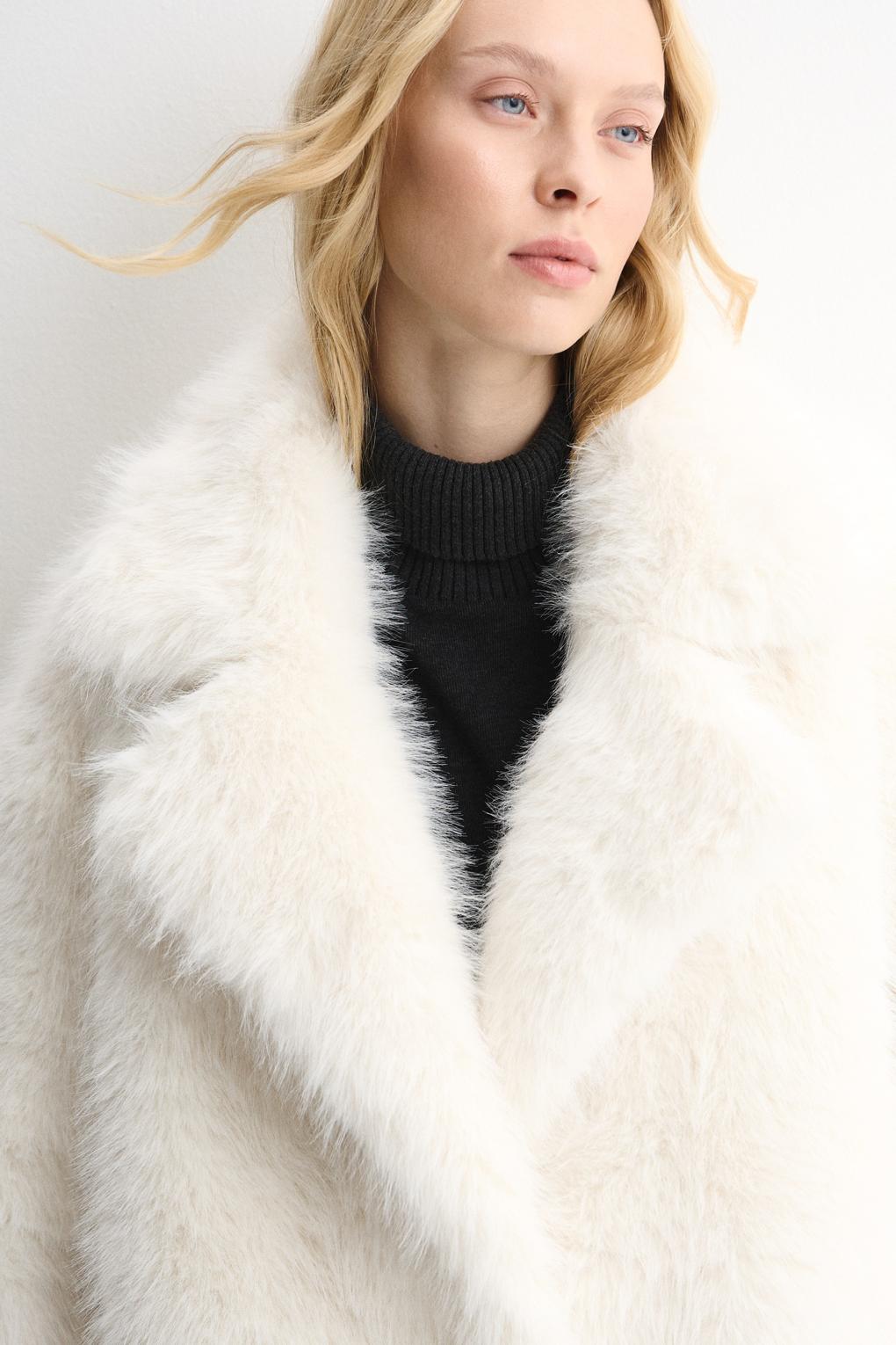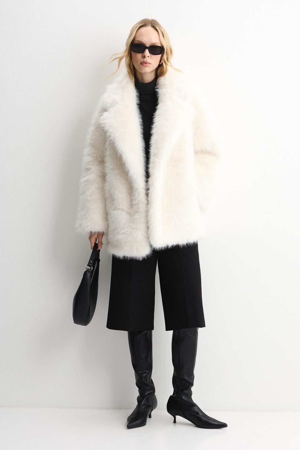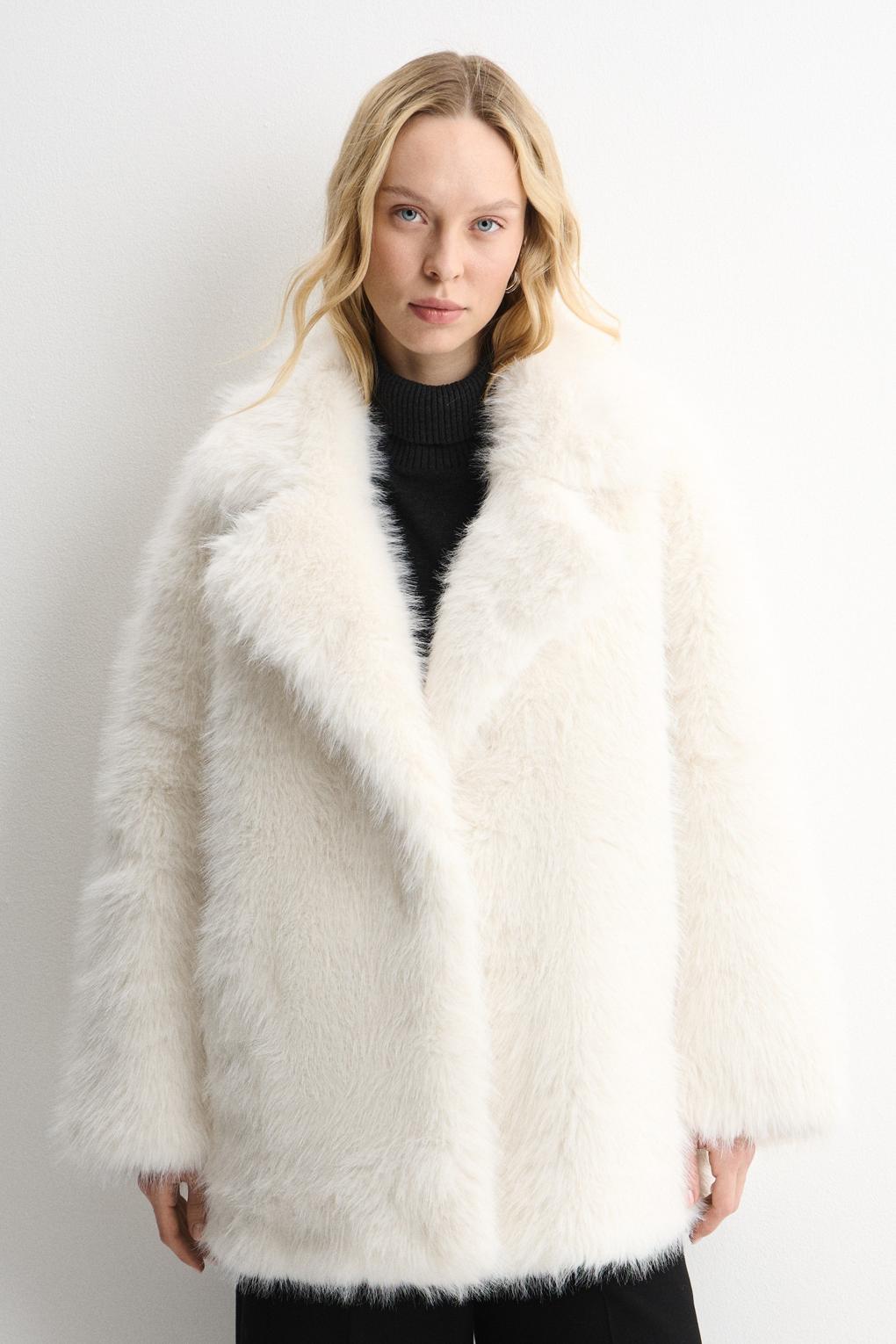 Женская укороченная шуба выполнена из мягкого искусственного меха. Особенности: свободный прямой крой со спущенным плечом и длинными рукавами, отложной воротник с лацканами, застежка на металлические крючки, два боковых внешних кармана.