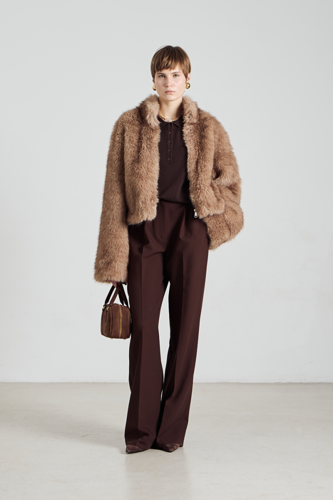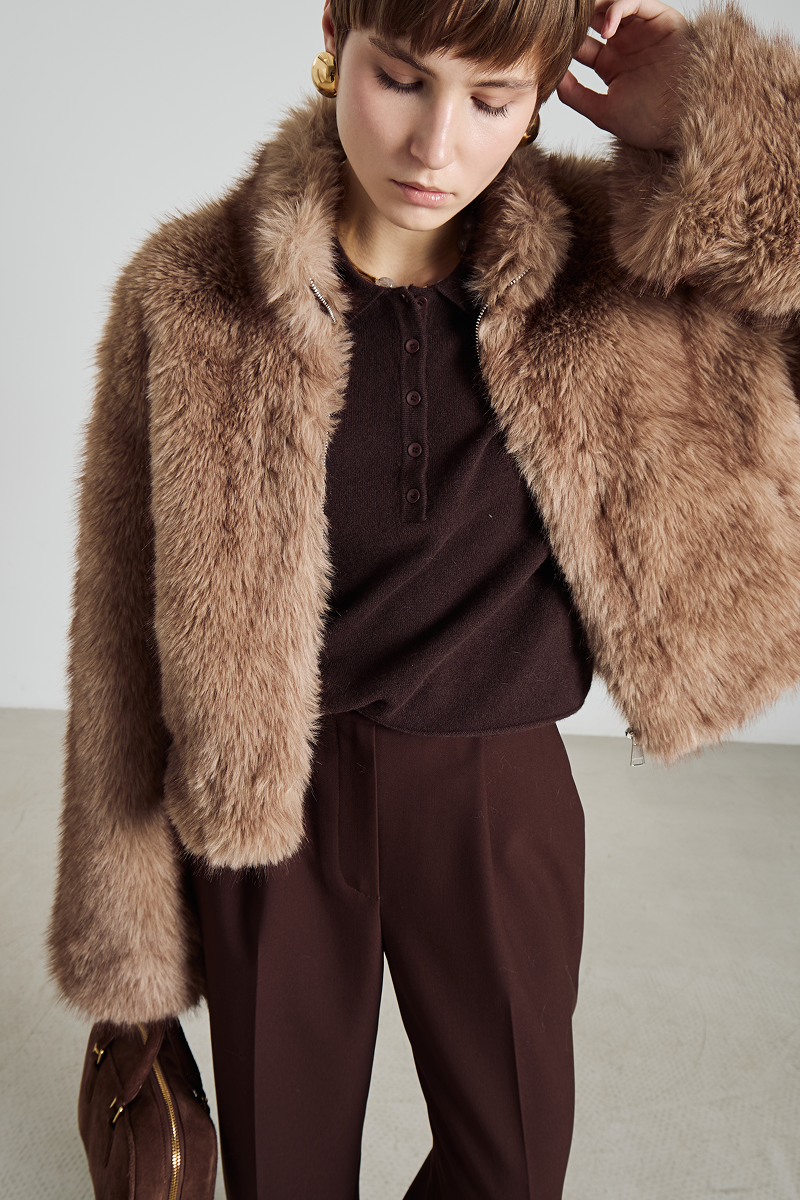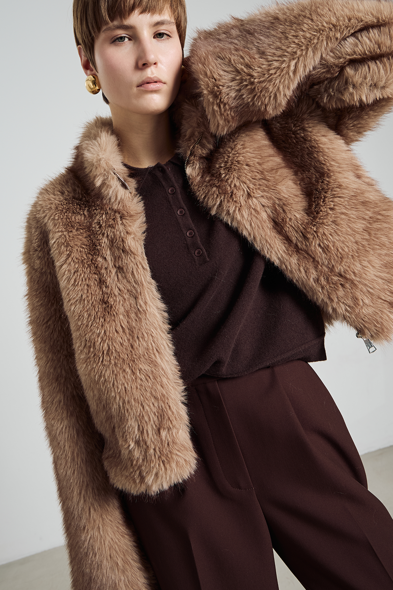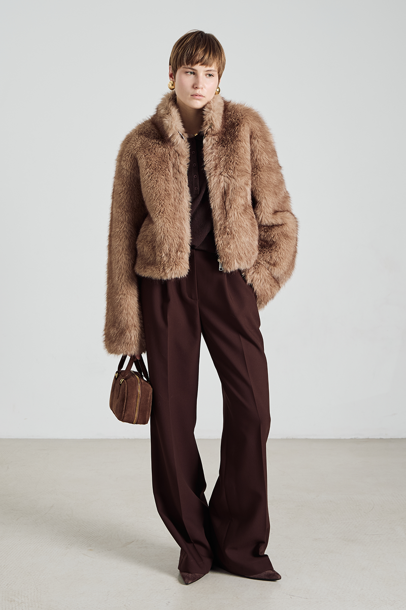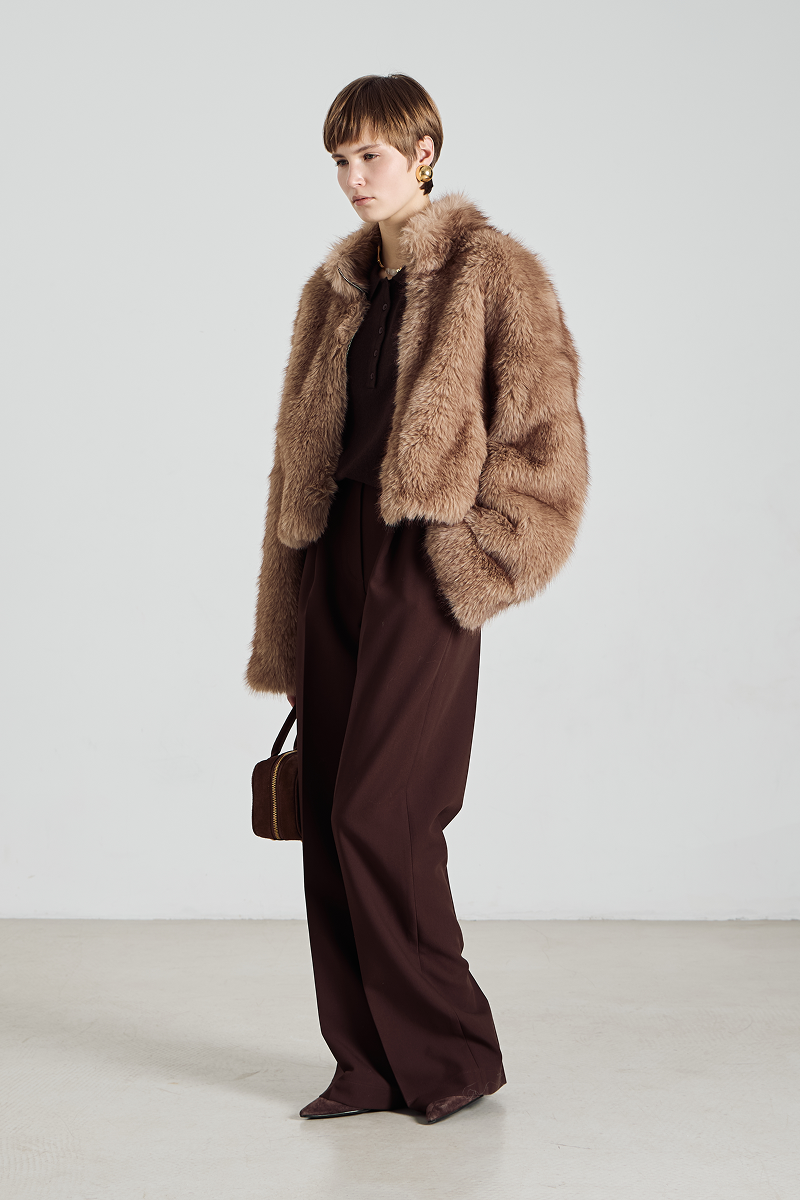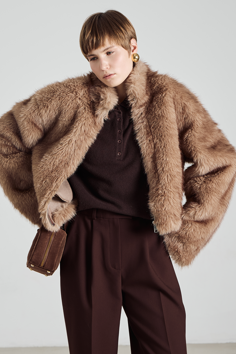 Шуба имеет удобный крой и застёгивается на молнию, что обеспечивает лёгкость в использовании и дополнительную защиту от непогоды. Высокий воротник добавляет образу элегантности и защищает шею от холода. Отсутствие капюшона делает модель более лаконичной и подходящей для создания различных образов — от повседневных до более формальных.