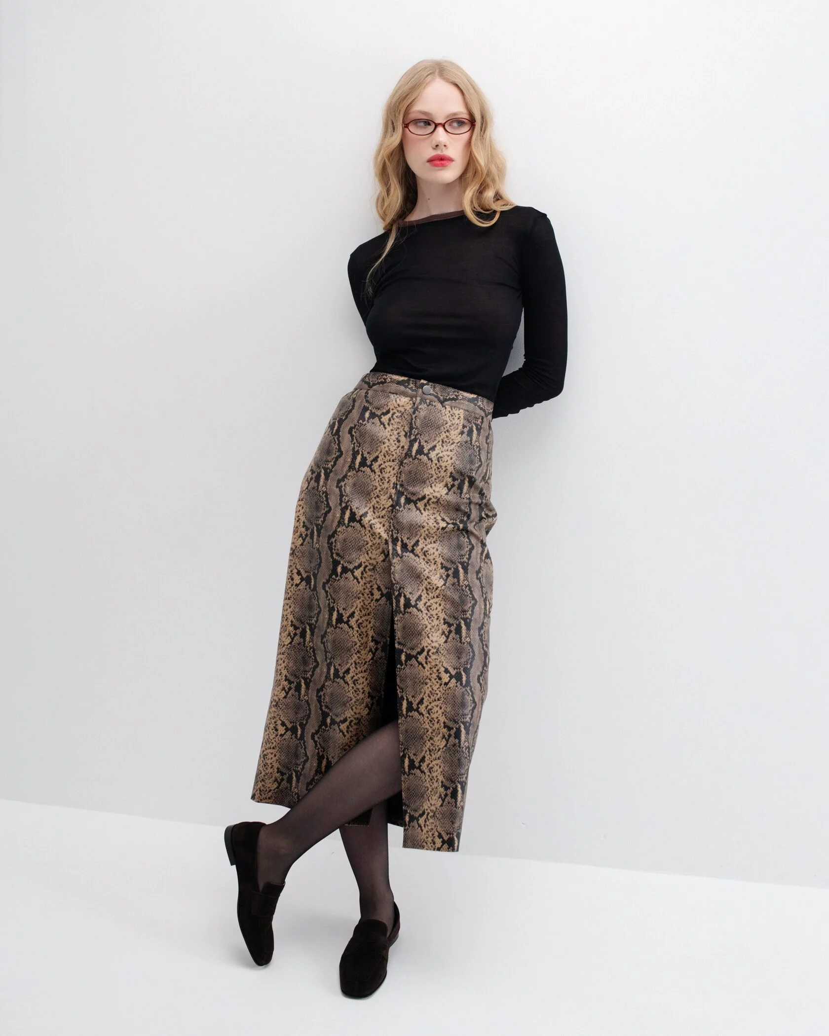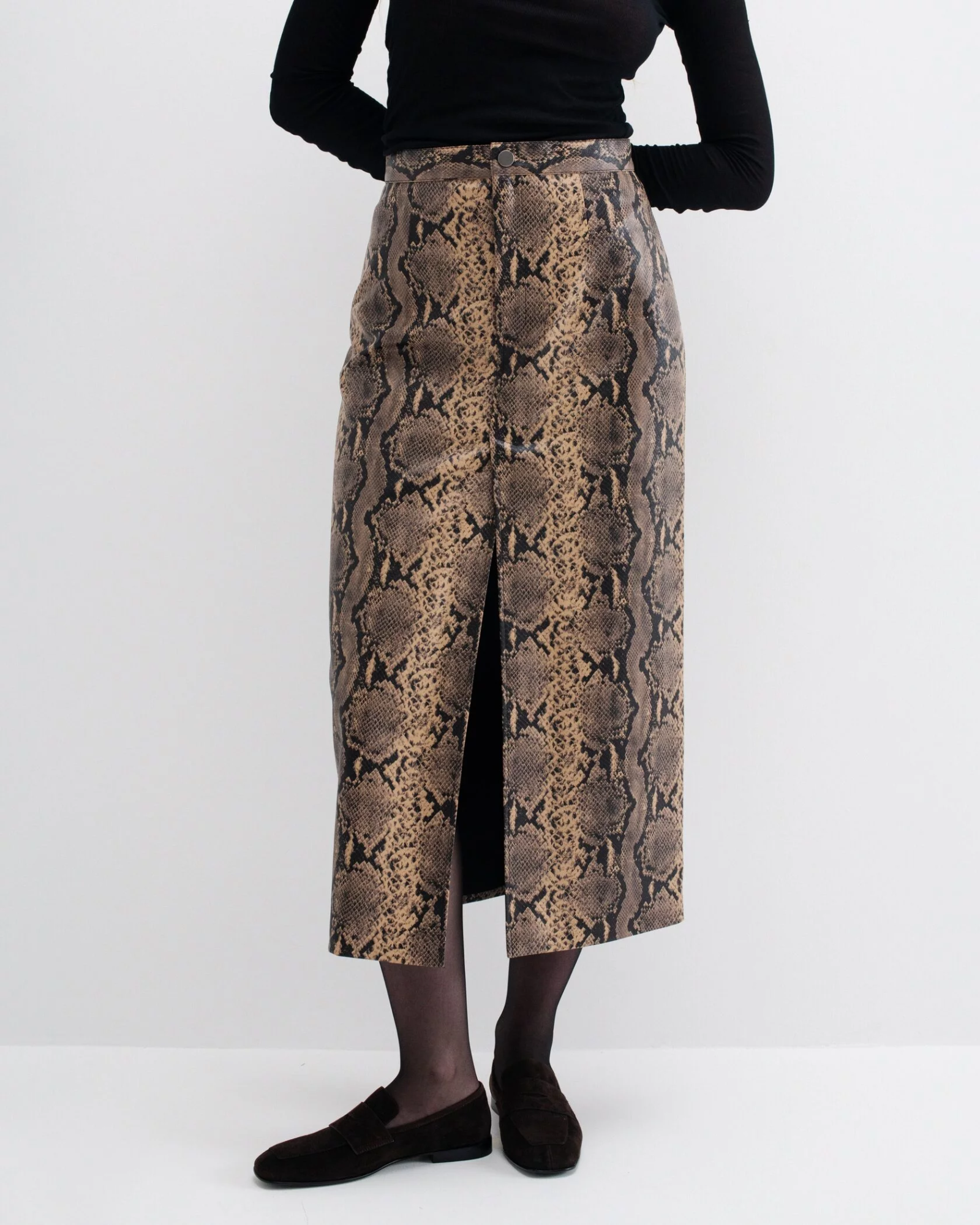 В этом сезоне дизайнеры экспериментируют с анималистичными принтами и материалами. Осень – самое время перестать говорить намёками и привнести в образ тот новый характер, который всегда был внутри. Изделие выполнено из эко-кожи и дополнено акцентным разрезом.