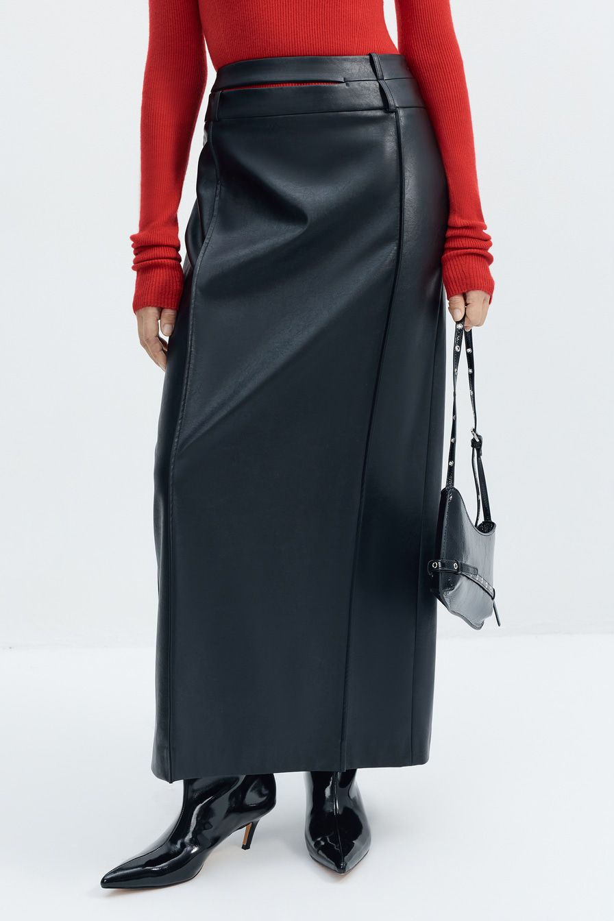 Черная юбка-карандаш из экокожи – модель с двойным поясом. Юбка дополнена разрезом, фактурными швами и боковой застежкой-молнией.