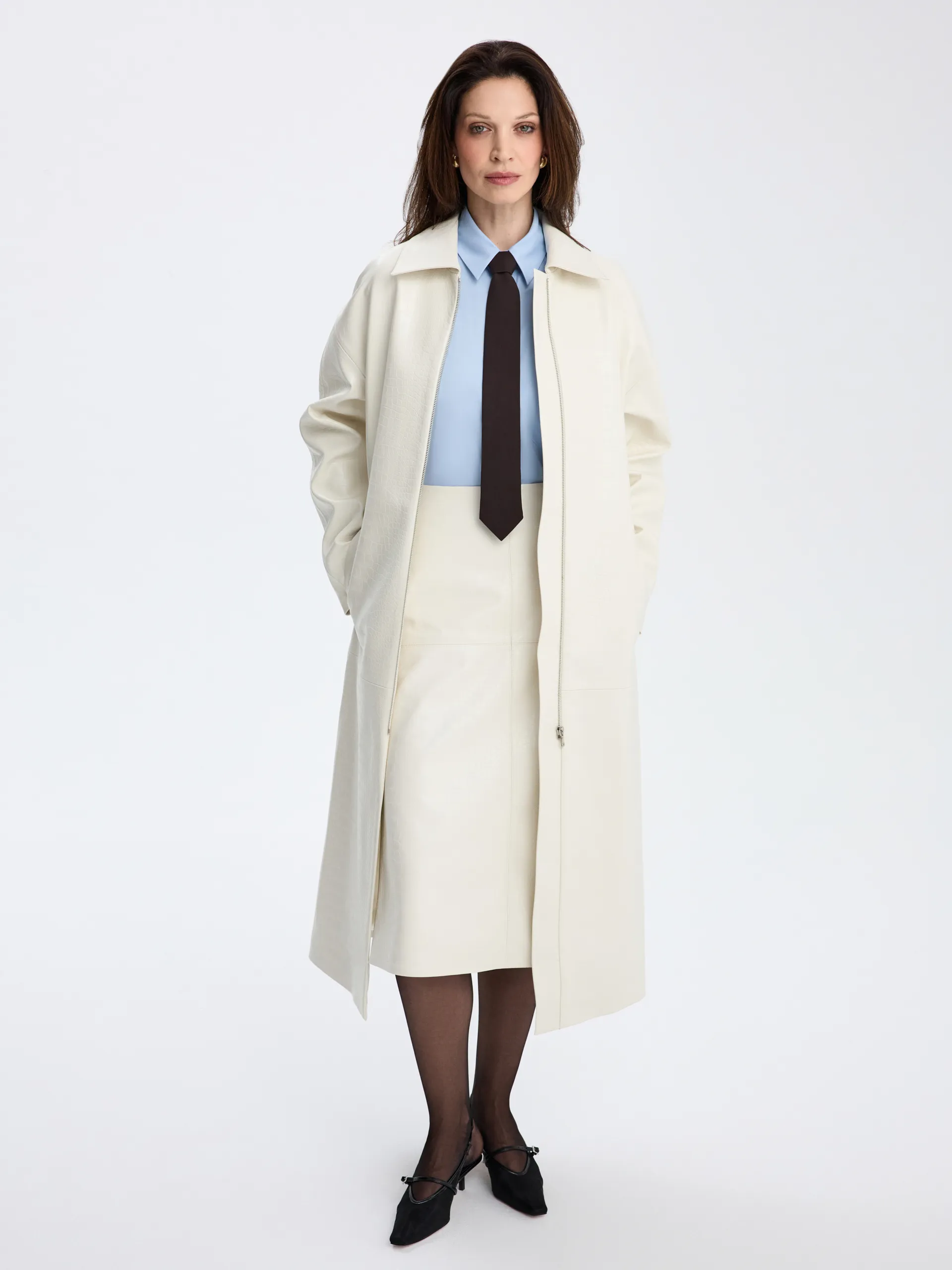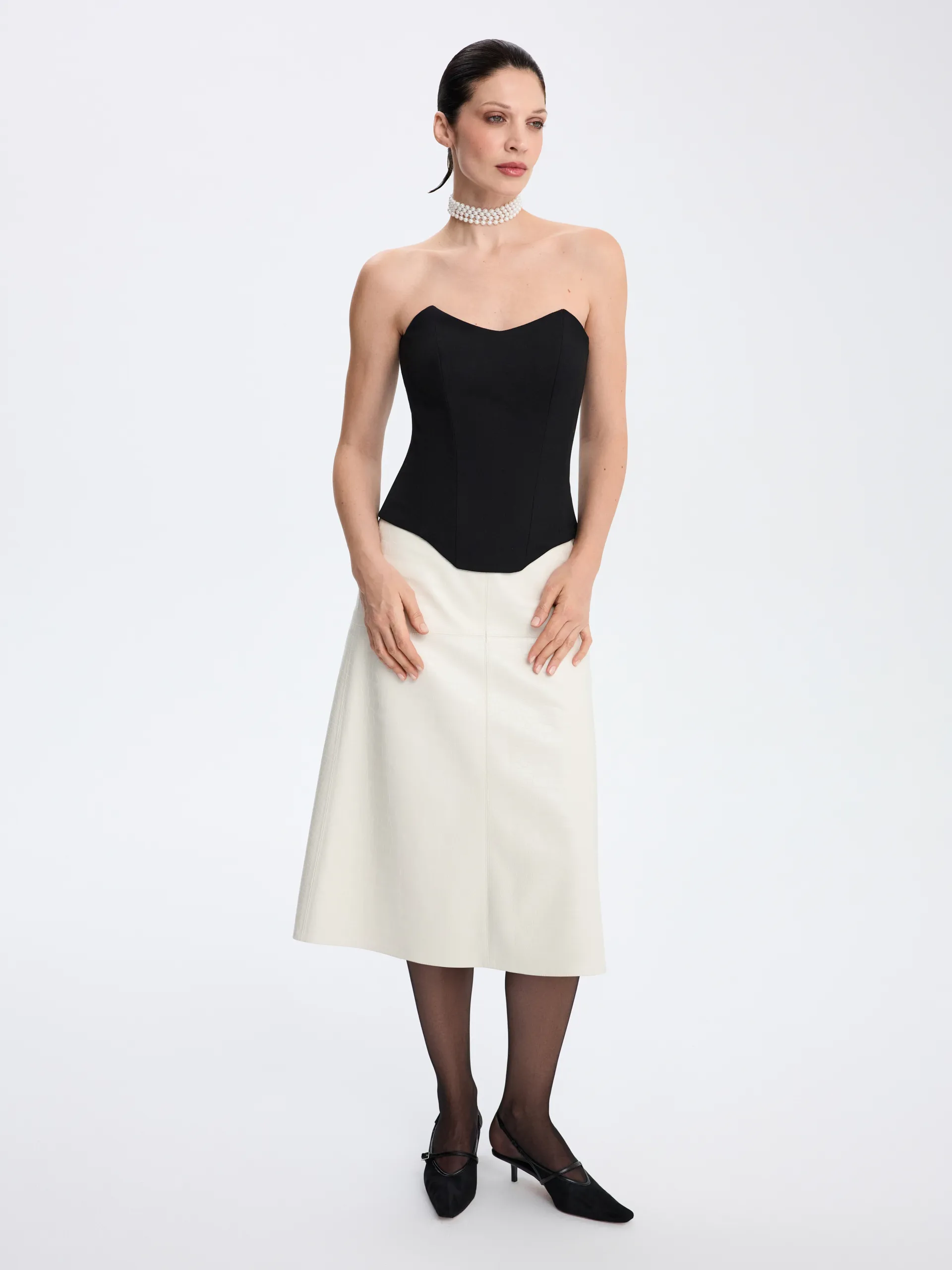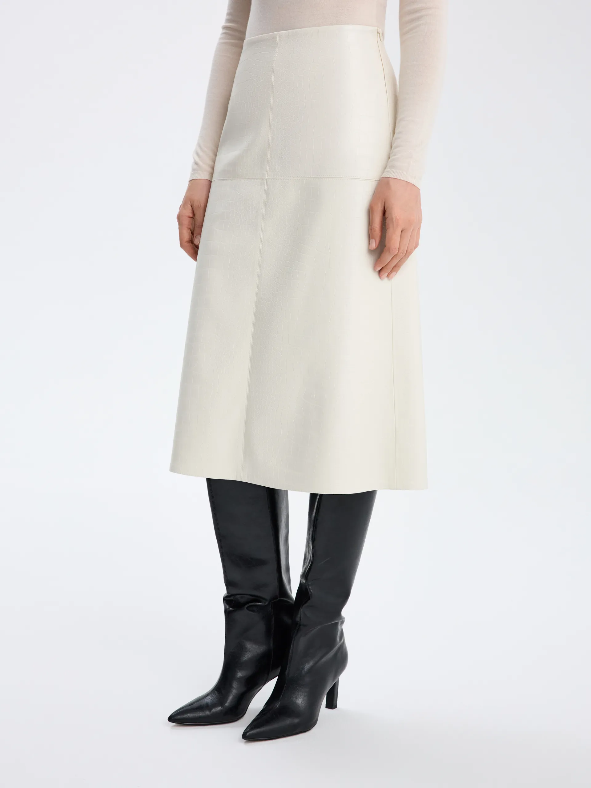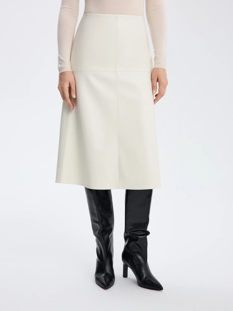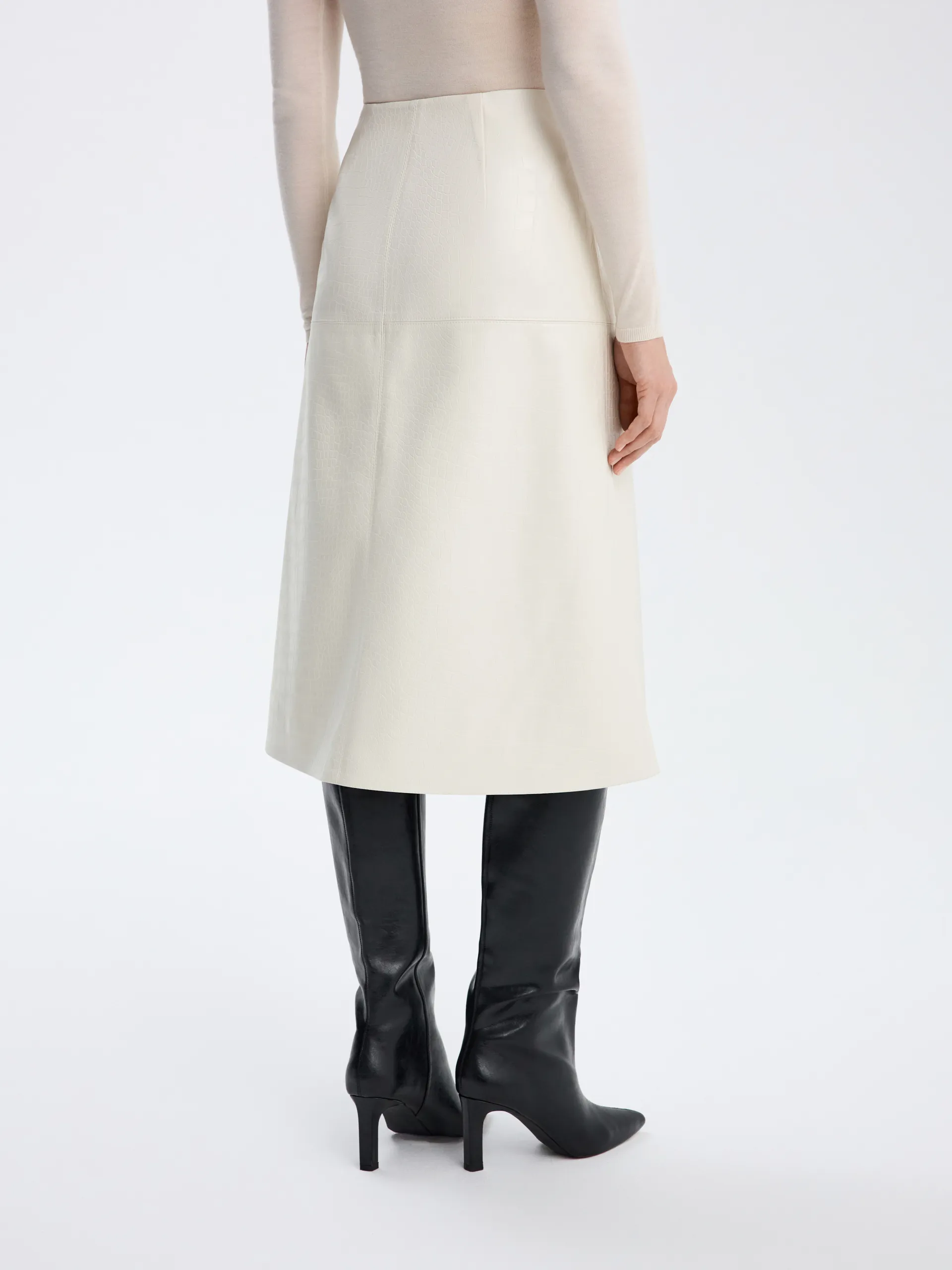 Белая миди юбка трапециевидного силуэта выполнена из фактурной экокожи с вискозной подкладкой, благодаря чему хорошо держит форму и комфортна в носке. Чёткая линия кроя визуально вытягивает силуэт, а лаконичный дизайн позволяет легко сочетать модель с рубашками, корсетами, трикотажем и жакетами для сдержанных и современных образов.