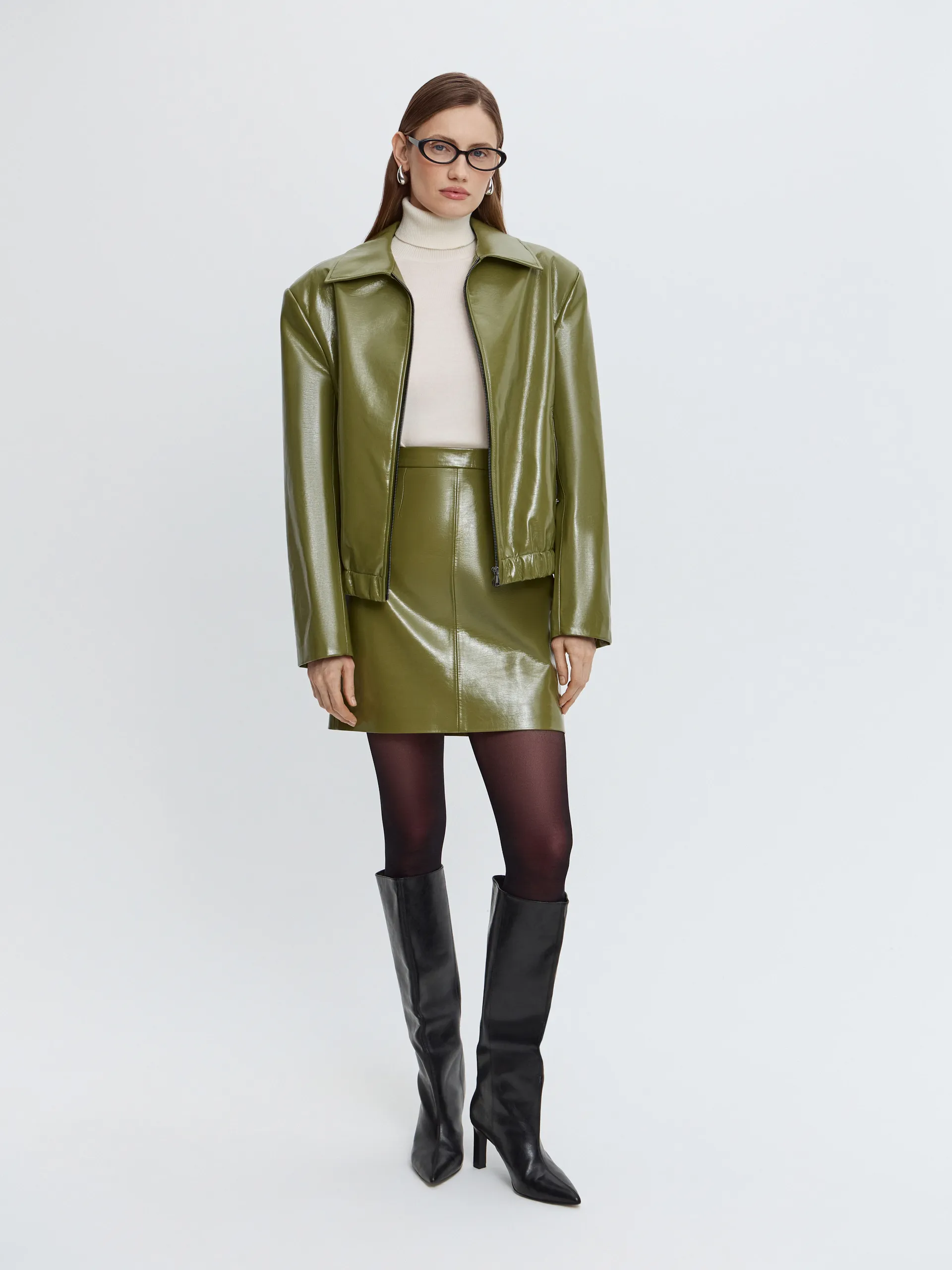 Юбка выполнена из премиальной лакированной экокожи, ее деликатный блеск подчеркивает фактуру, близкую к натуральной. А-силуэт хорошо корректирует фигуру, подчеркивая достоинства и скрывая недостатки. Втачной пояс акцентирует талию, создавая эффект песочных часов. Предлагаем носить с жакетом или бомбером для создания стильного комплекта.