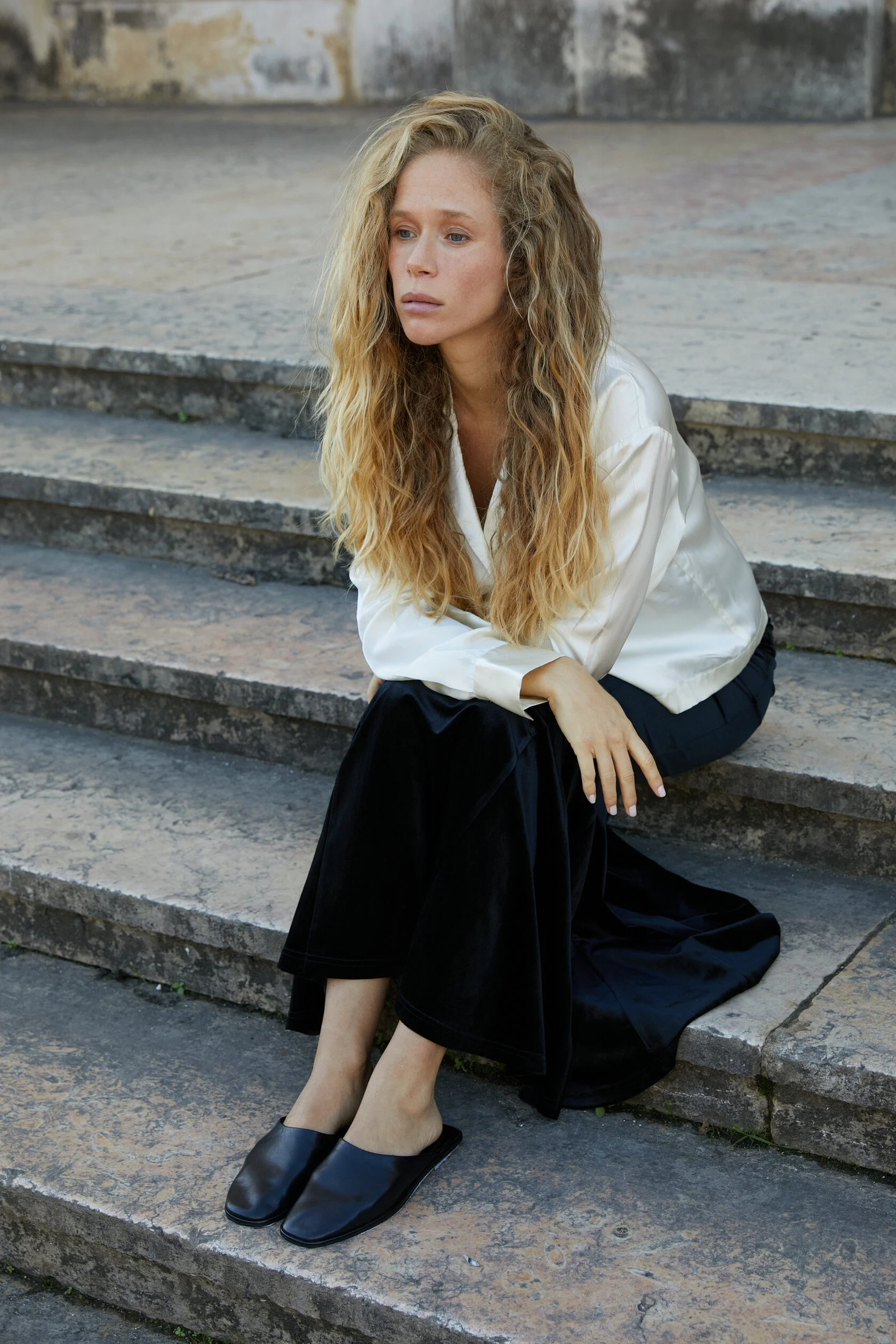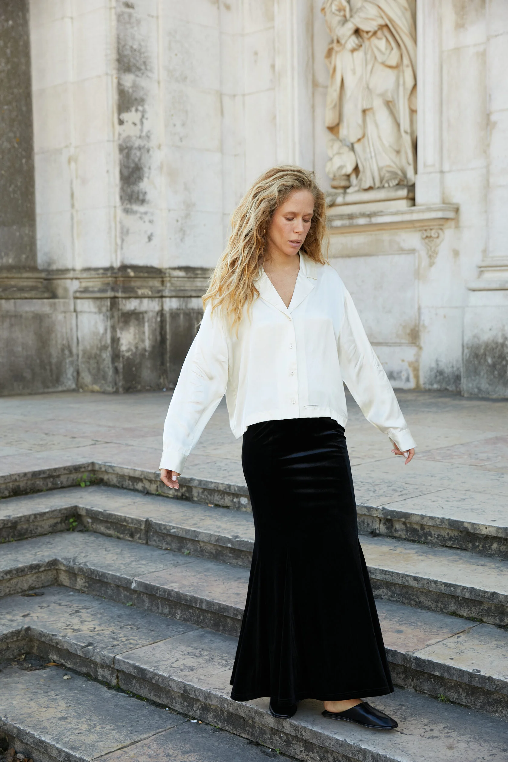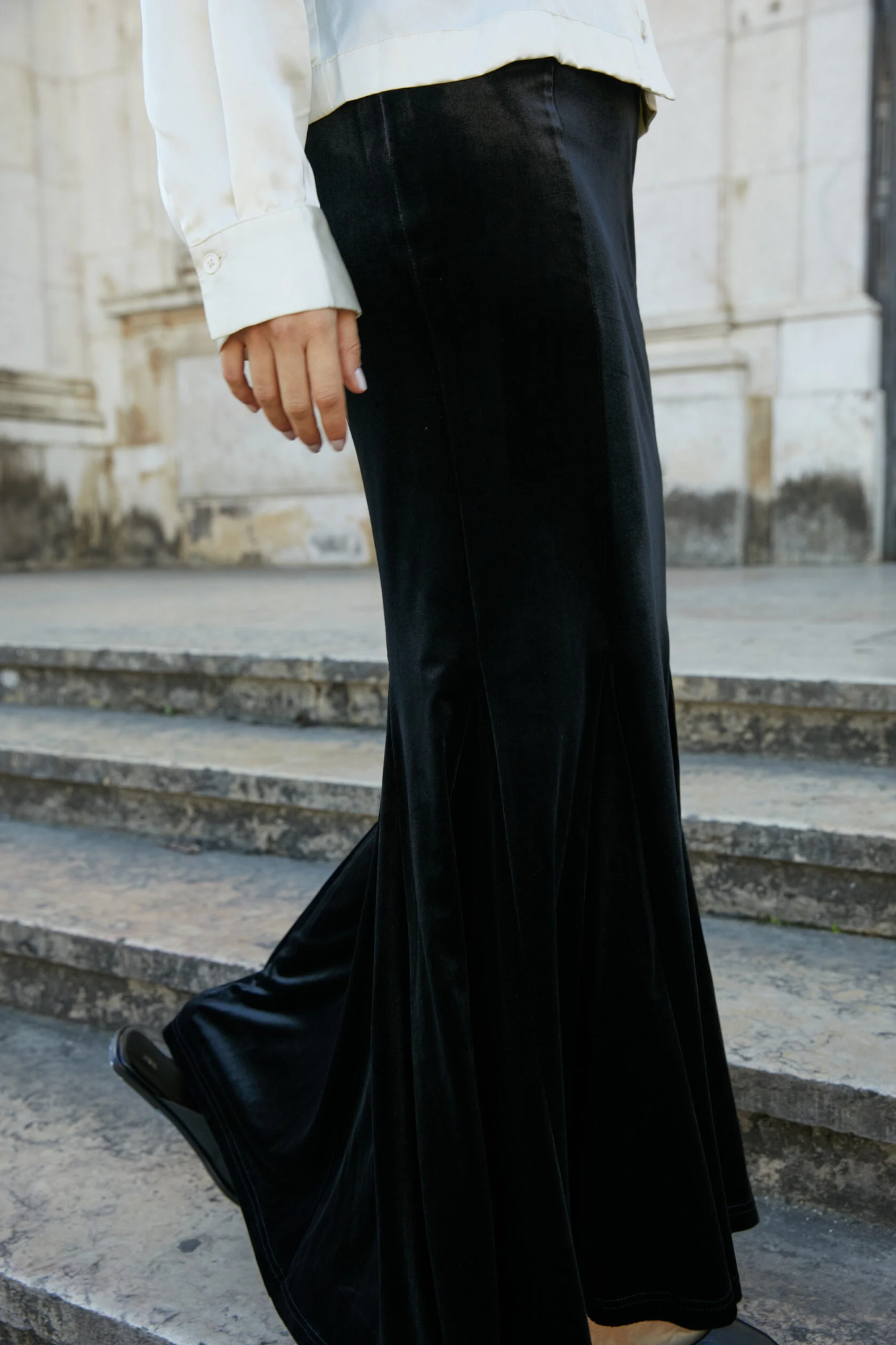Бархатная ткань придаёт юбке роскошный и насыщенный вид, а макси-длина обеспечивает комфорт и свободу движений. Чёрный цвет является универсальным и легко сочетается с различными верхами — от классических блузок до ярких топов.