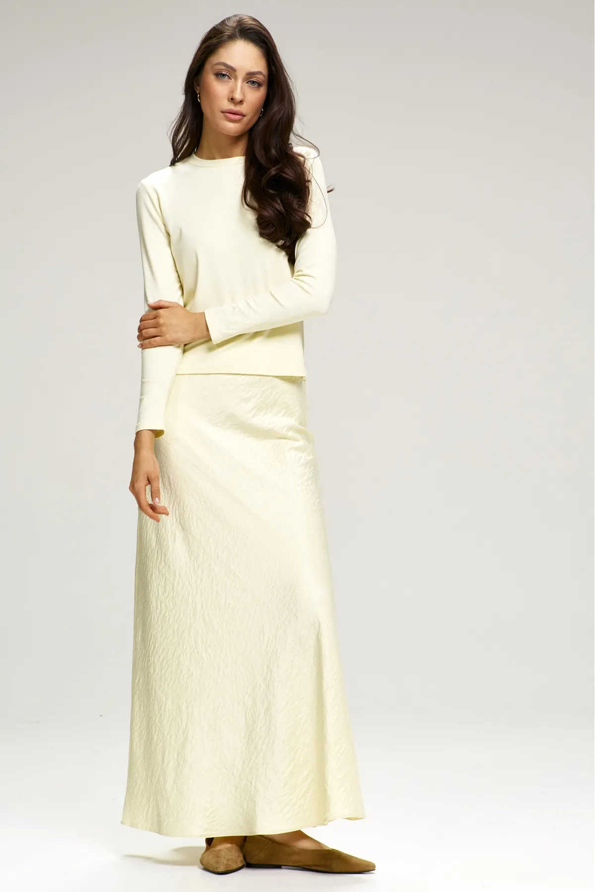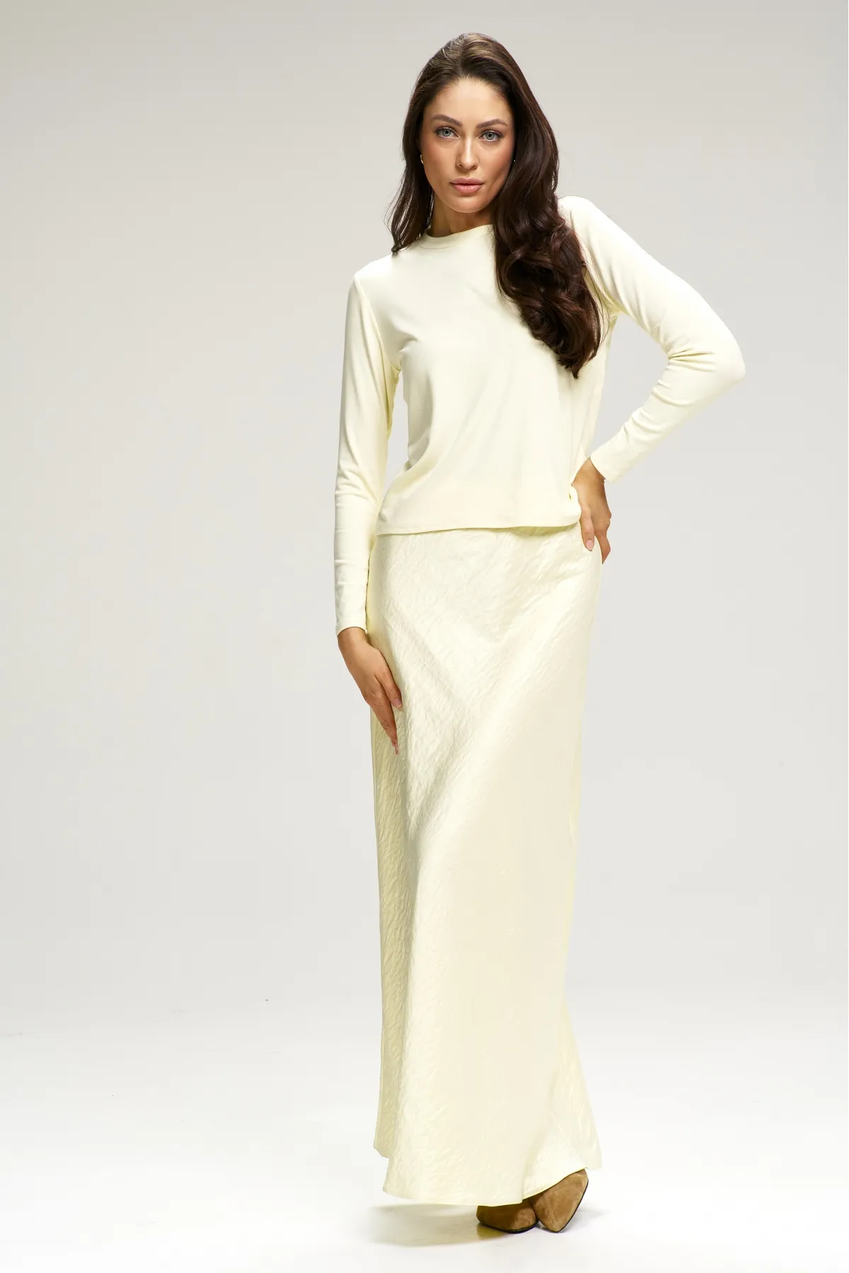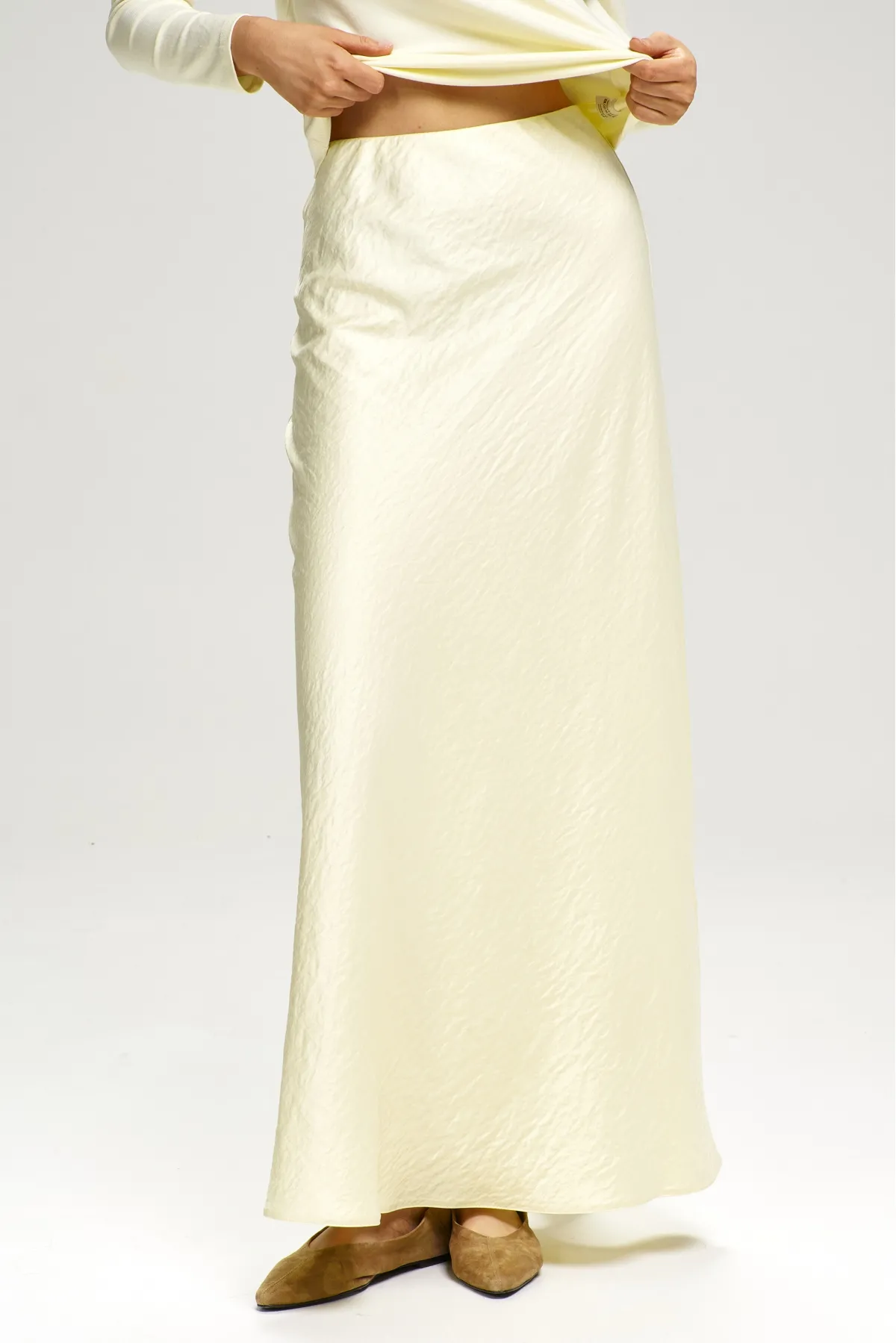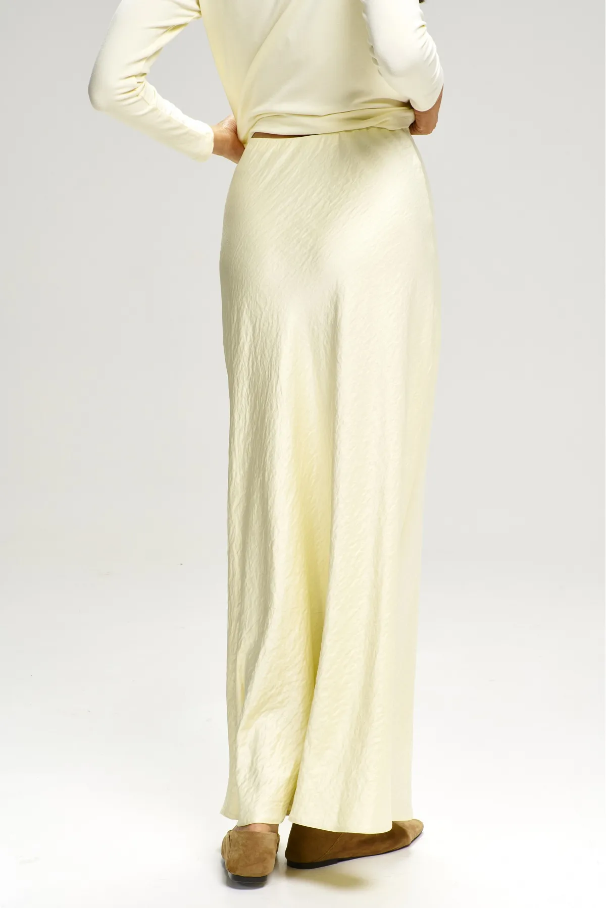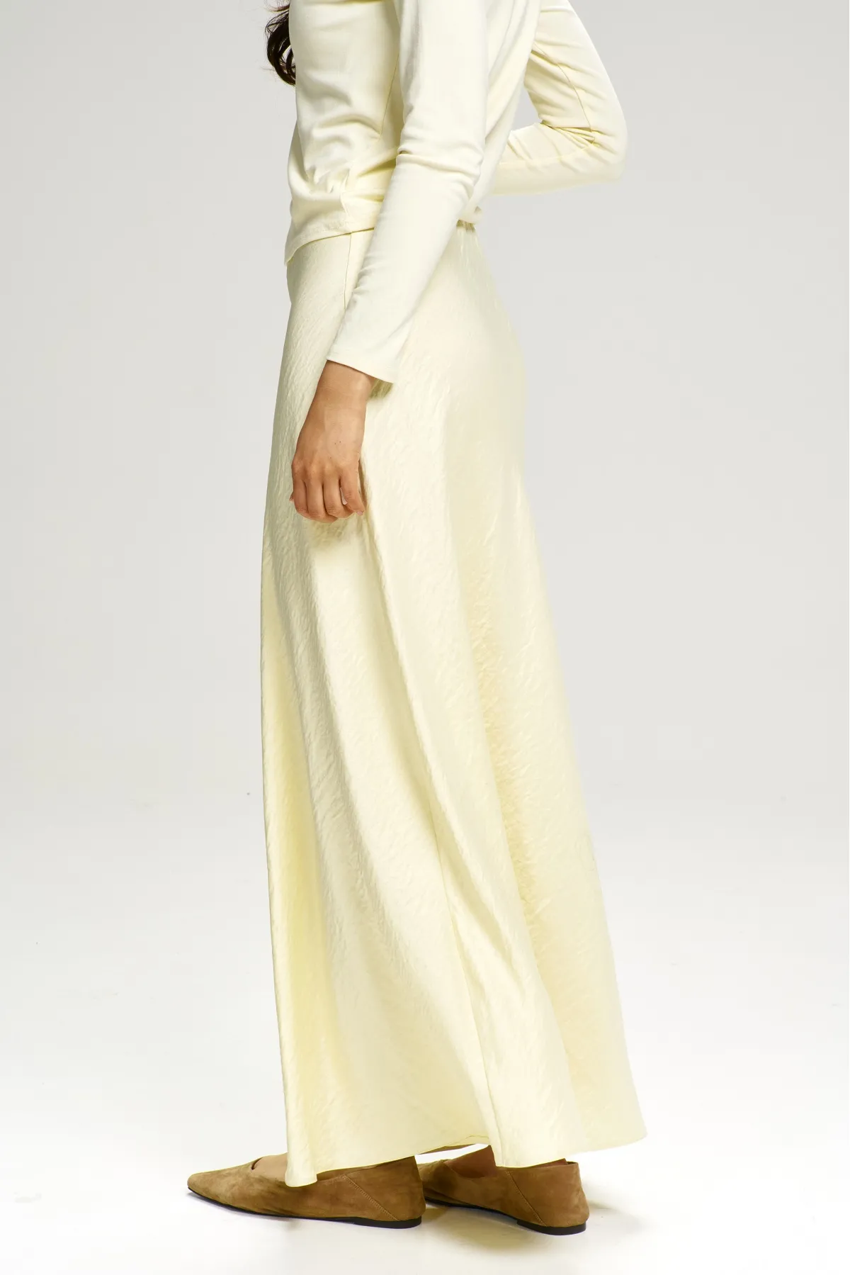 Плавный А‑силуэт, сшитая по юбка косой, которая мягко облегает и красиво спадает до щиколотки. Нежный сатиновый блеск и сочетание нейлона с вискозой дают лёгкую структуру, прочность и приятную на ощупь драпировку. При движении юбка элегантно струится.