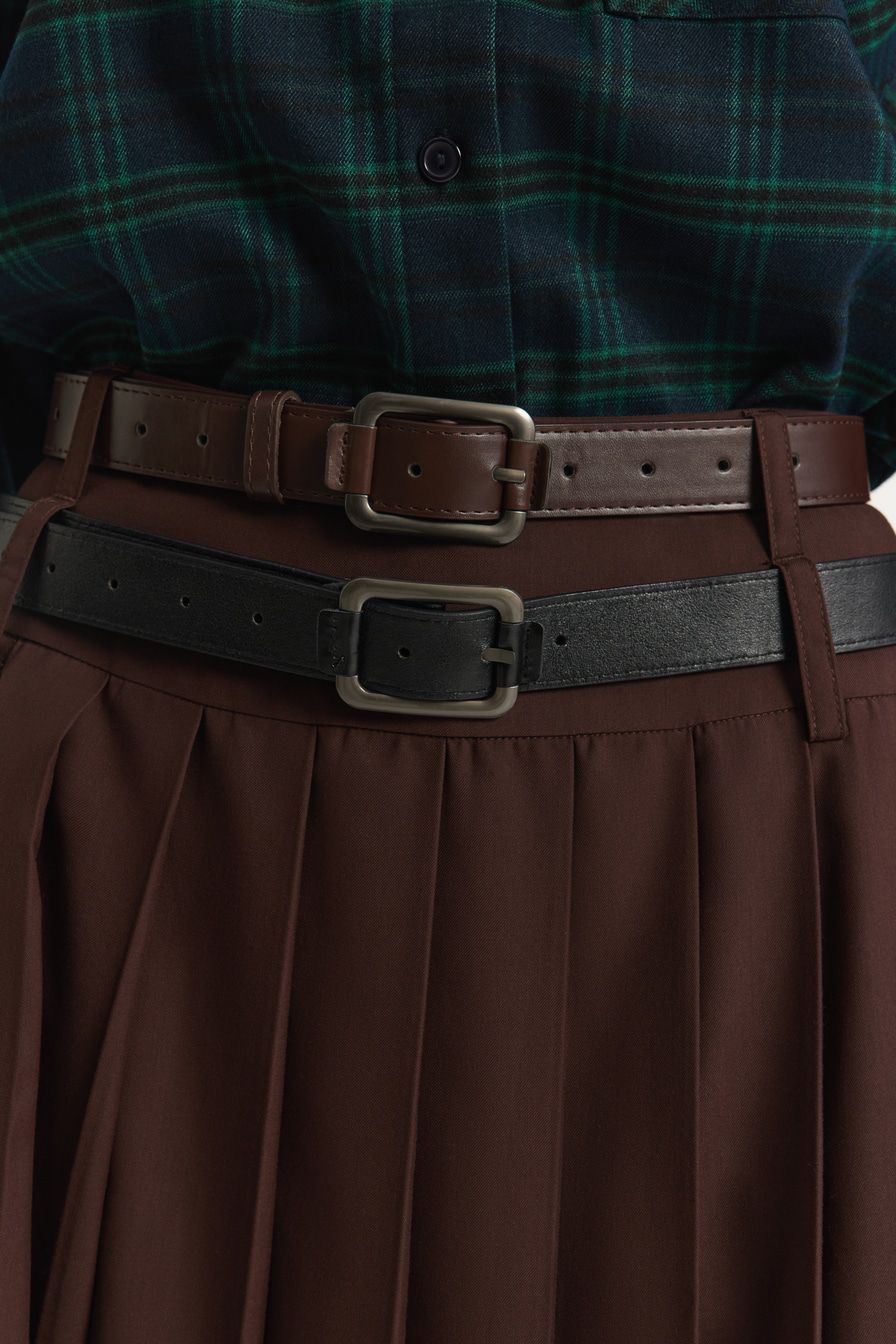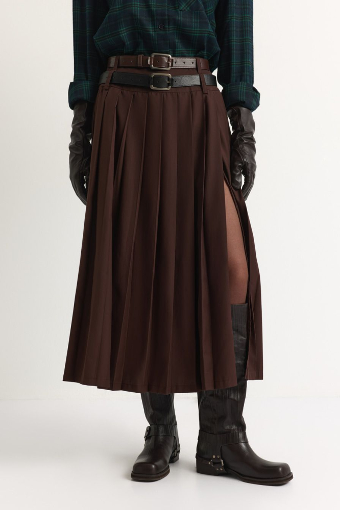 Длинная плиссированная юбка коричневого цвета выполнена из смесовой ткани с добавлением вискозы. Модель дополнена высоким разрезом и двойным ремнем.