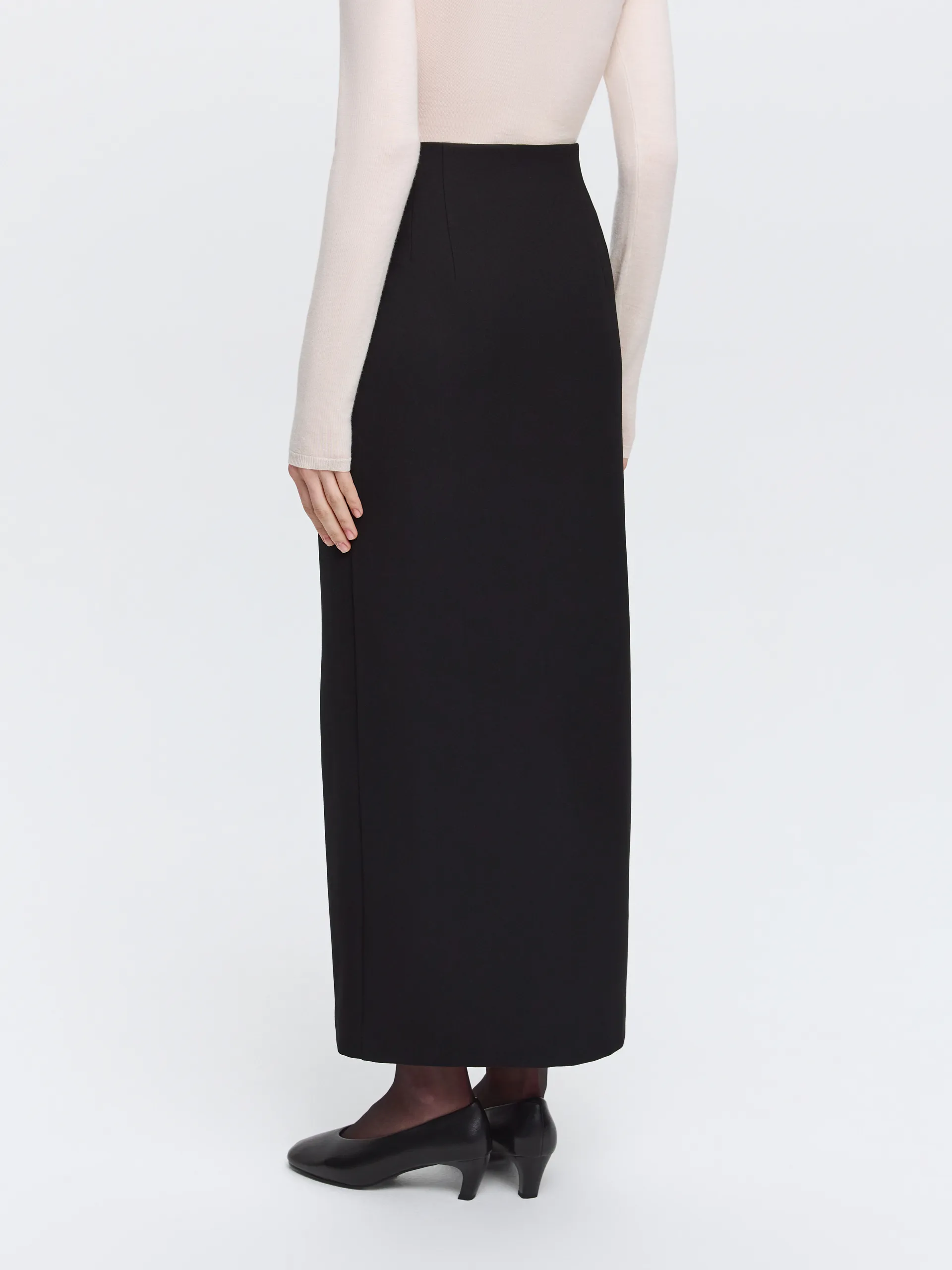 Прямая юбка-макси из чёрной костюмной ткани — элегантная и универсальная основа гардероба. Плотный материал держит форму и сохраняет аккуратный внешний вид, подчёркивая чистоту линий. Чёткий силуэт визуально вытягивает пропорции, а разрез спереди добавляет свободы движения. Модель гармонично сочетается с жакетом из той же ткани, а также с блузами, рубашками и трикотажем, легко адаптируясь под деловой и городской гардероб. База, которая выглядит уместно в любой ситуации.