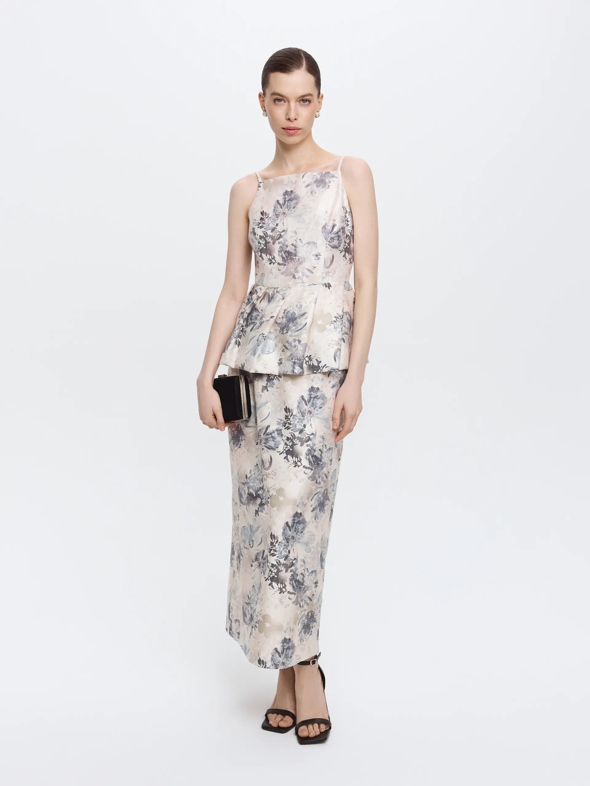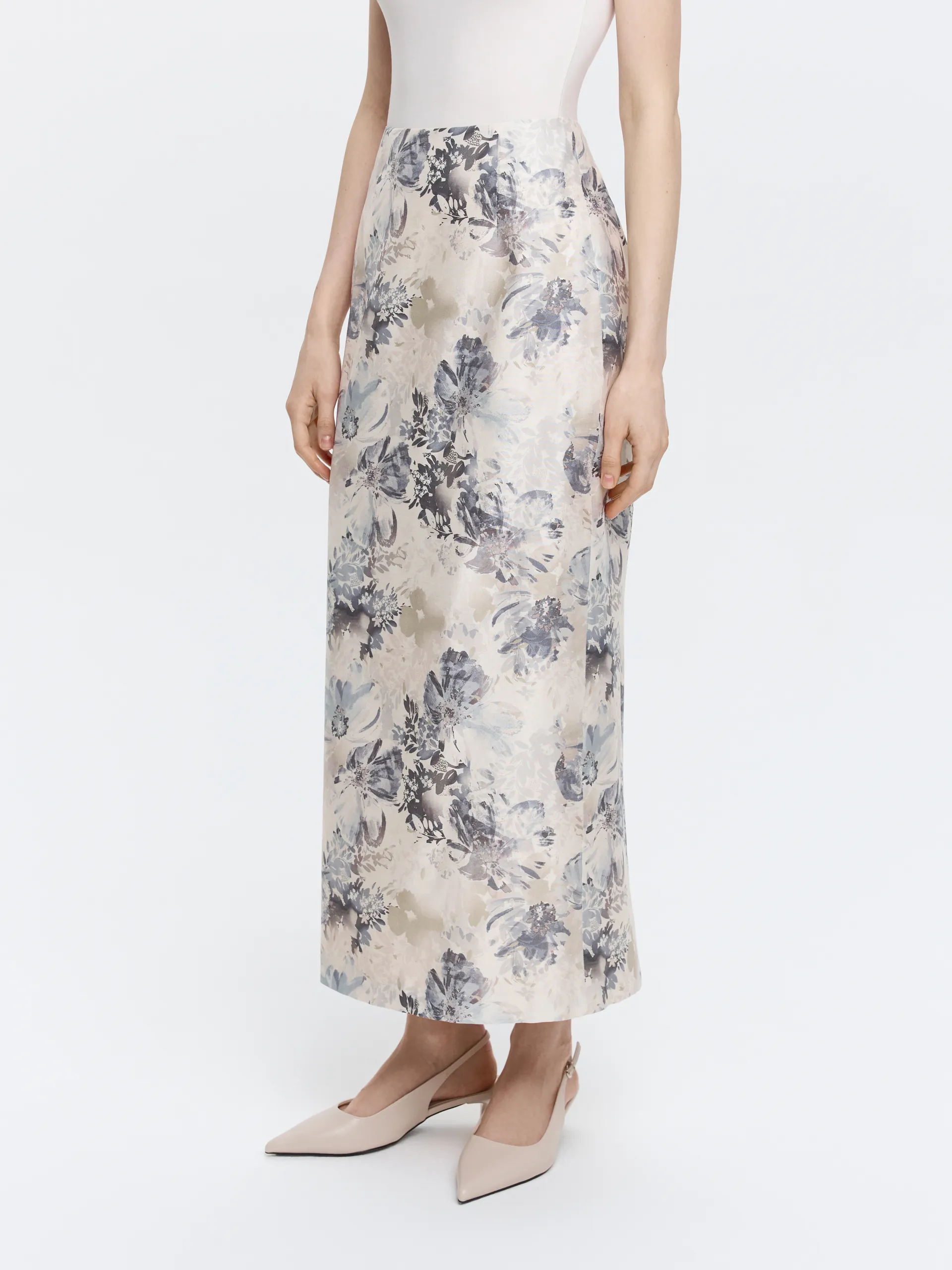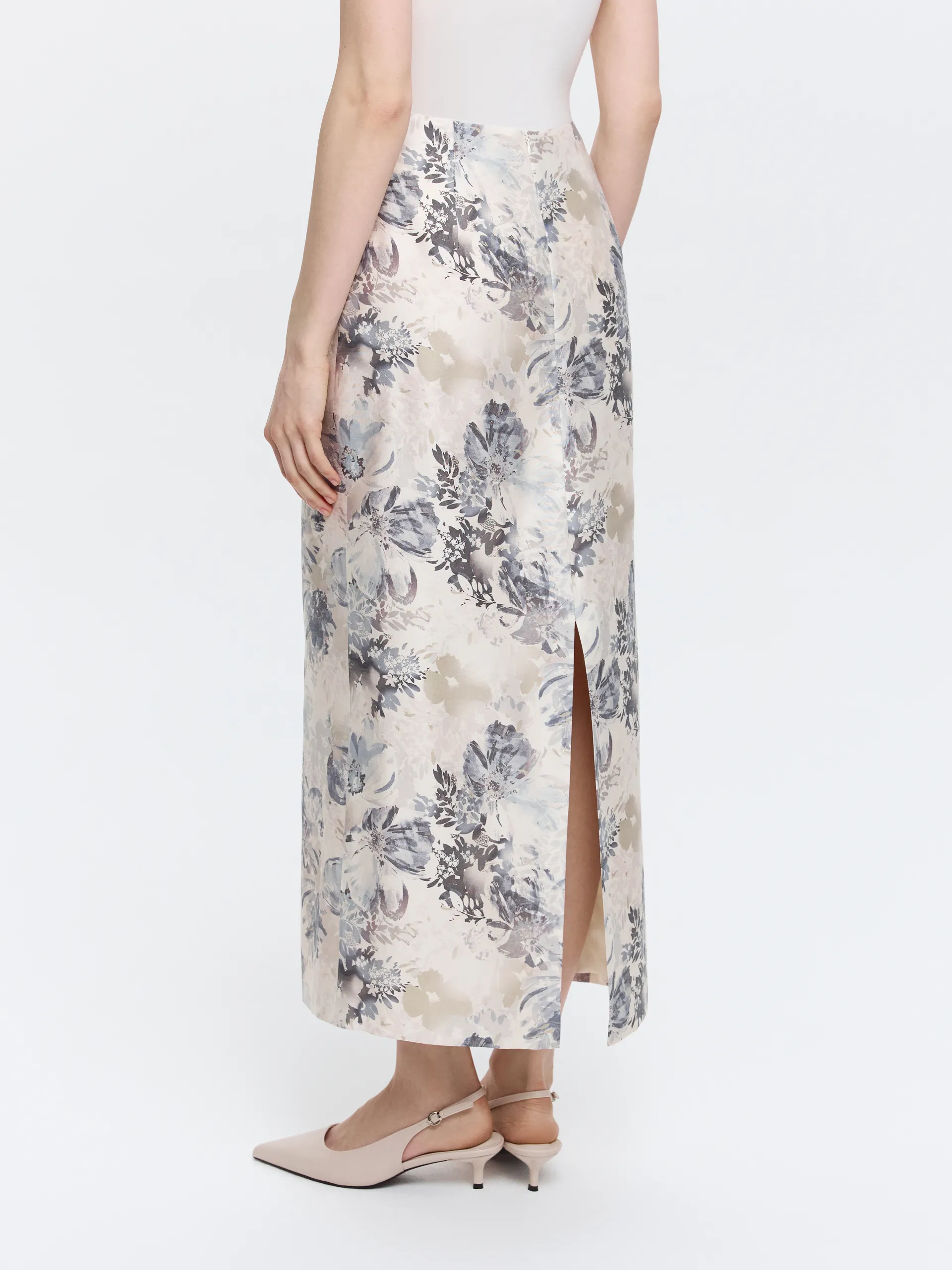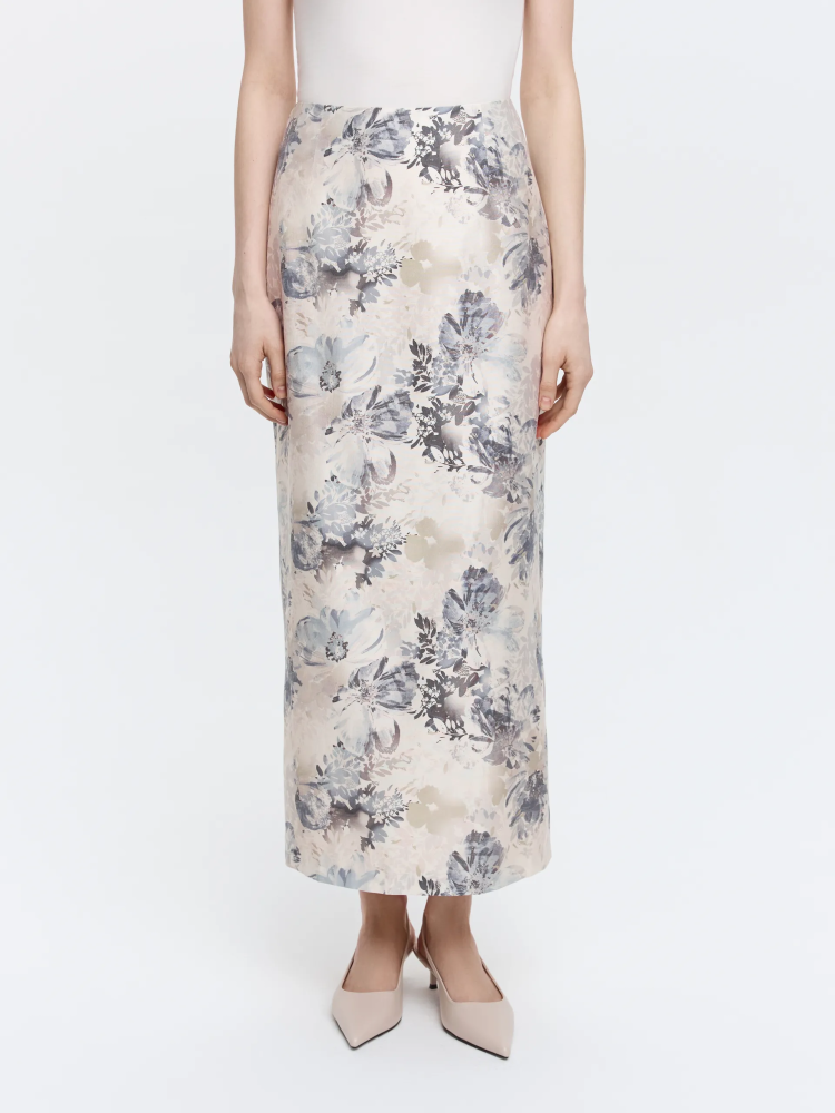 Макси-юбка прямого силуэта выполнена из итальянской ткани с принтом голубые цветы. Материал держит форму и сохраняет аккуратный внешний вид, создавая лёгкий и собранный силуэт. Выверенный крой подчёркивает фигуру без излишнего прилегания и визуально вытягивает пропорции. Юбка гармонично сочетается с жакетом и топом Лика, формируя цельный комплект, и легко адаптируется под деловой и городской гардероб.