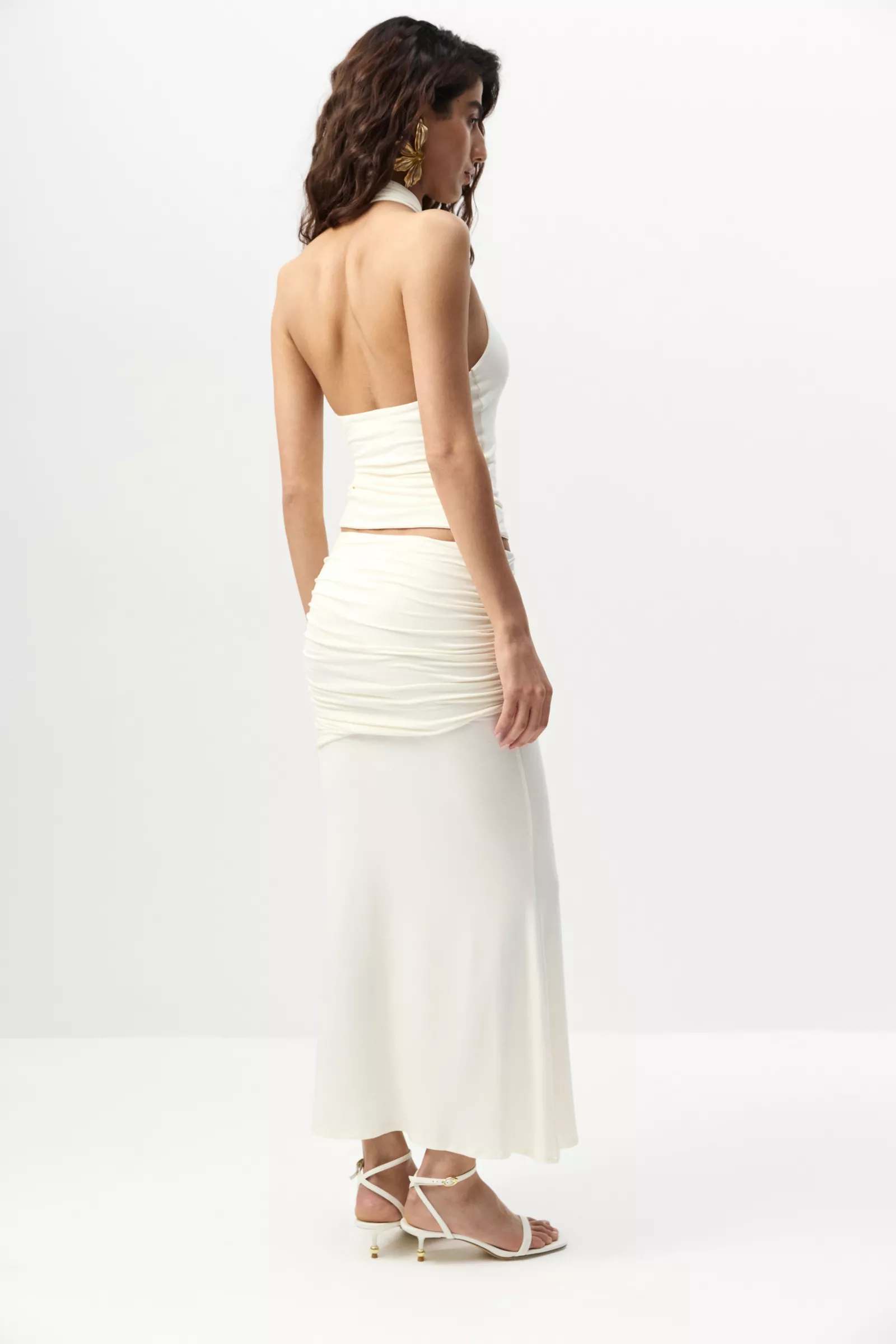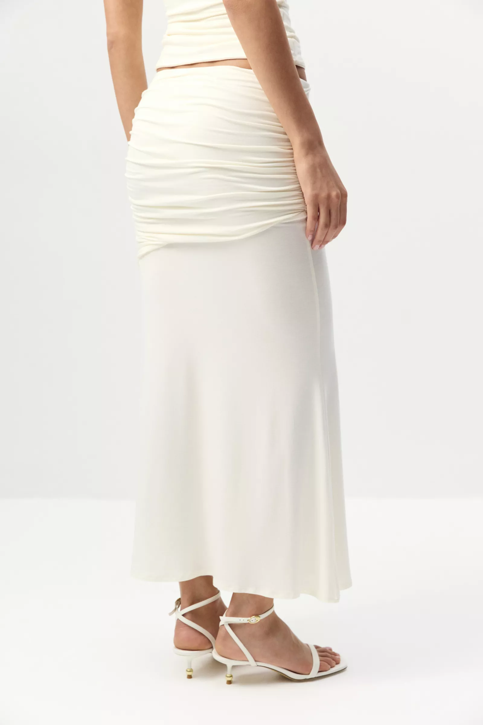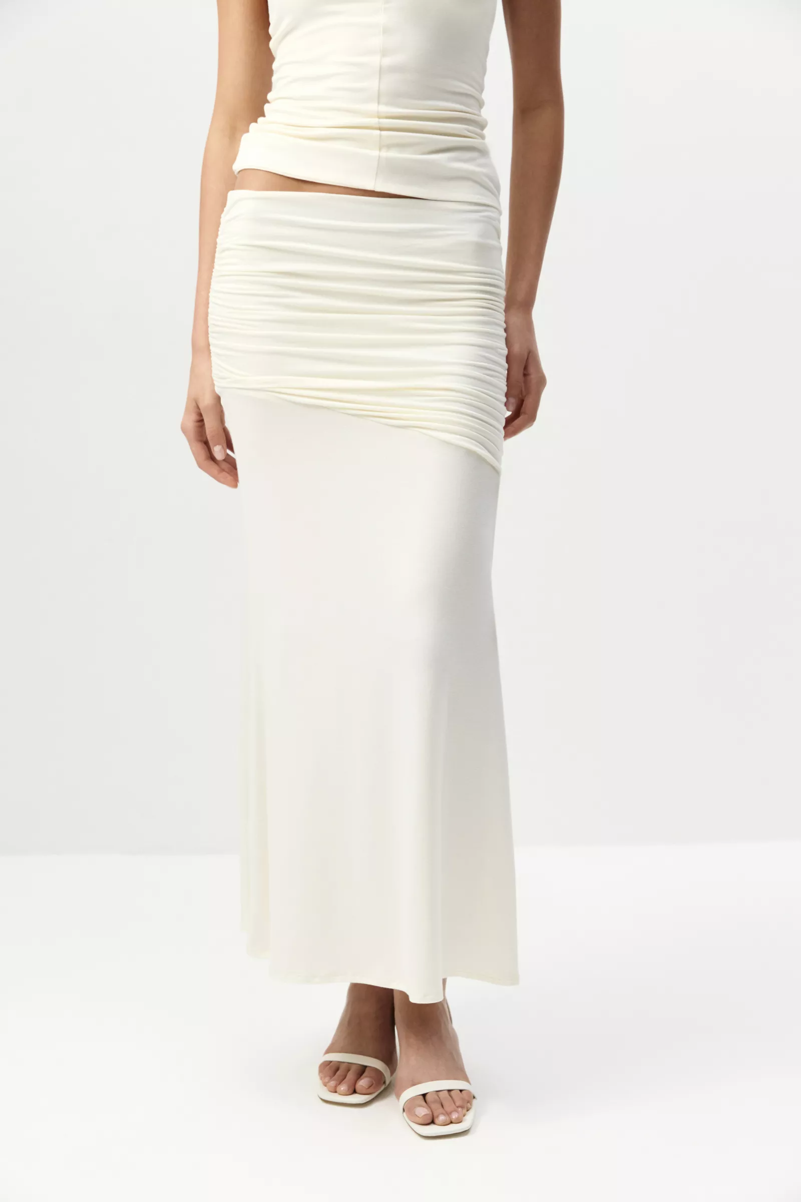 Трикотажная юбка-годе из плотного, мягкого трикотажа, облегает фигуру и подчеркивает силуэт. По верхней части юбки сборка в боковых швах. Легкое расклешение к низу создает красивое движение при ходьбе.