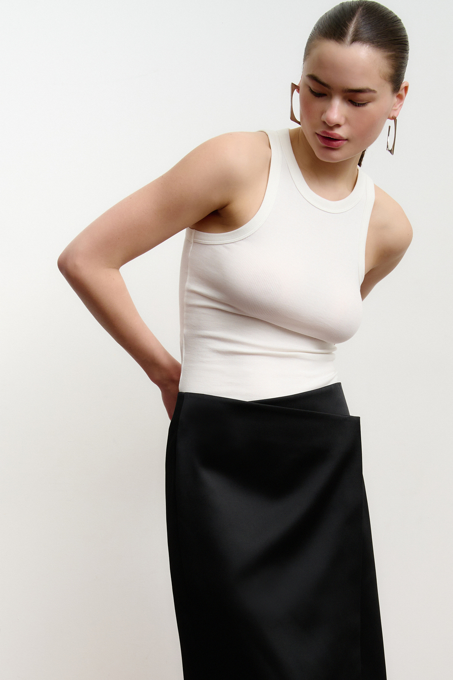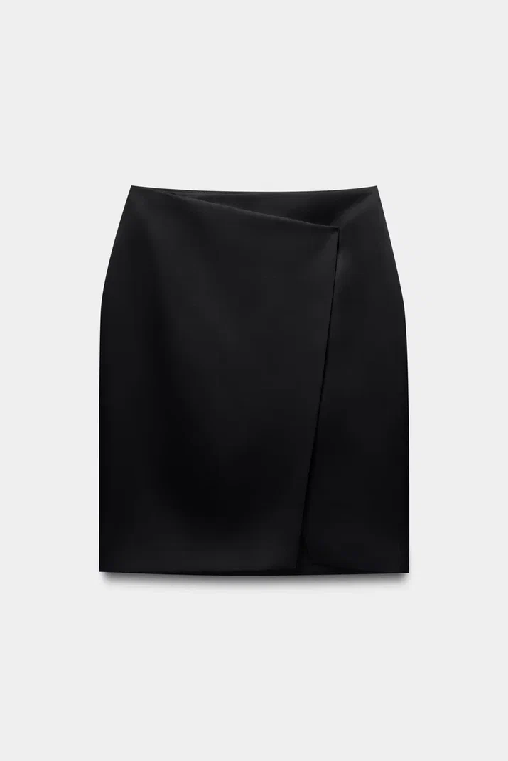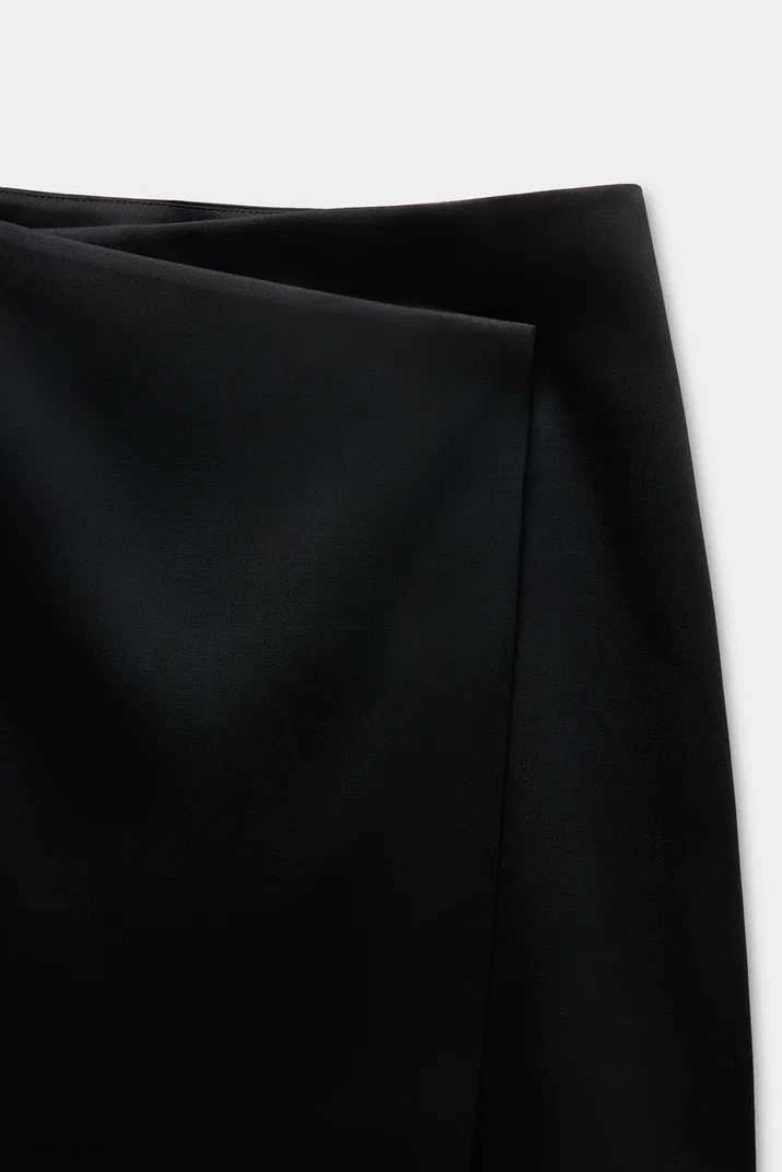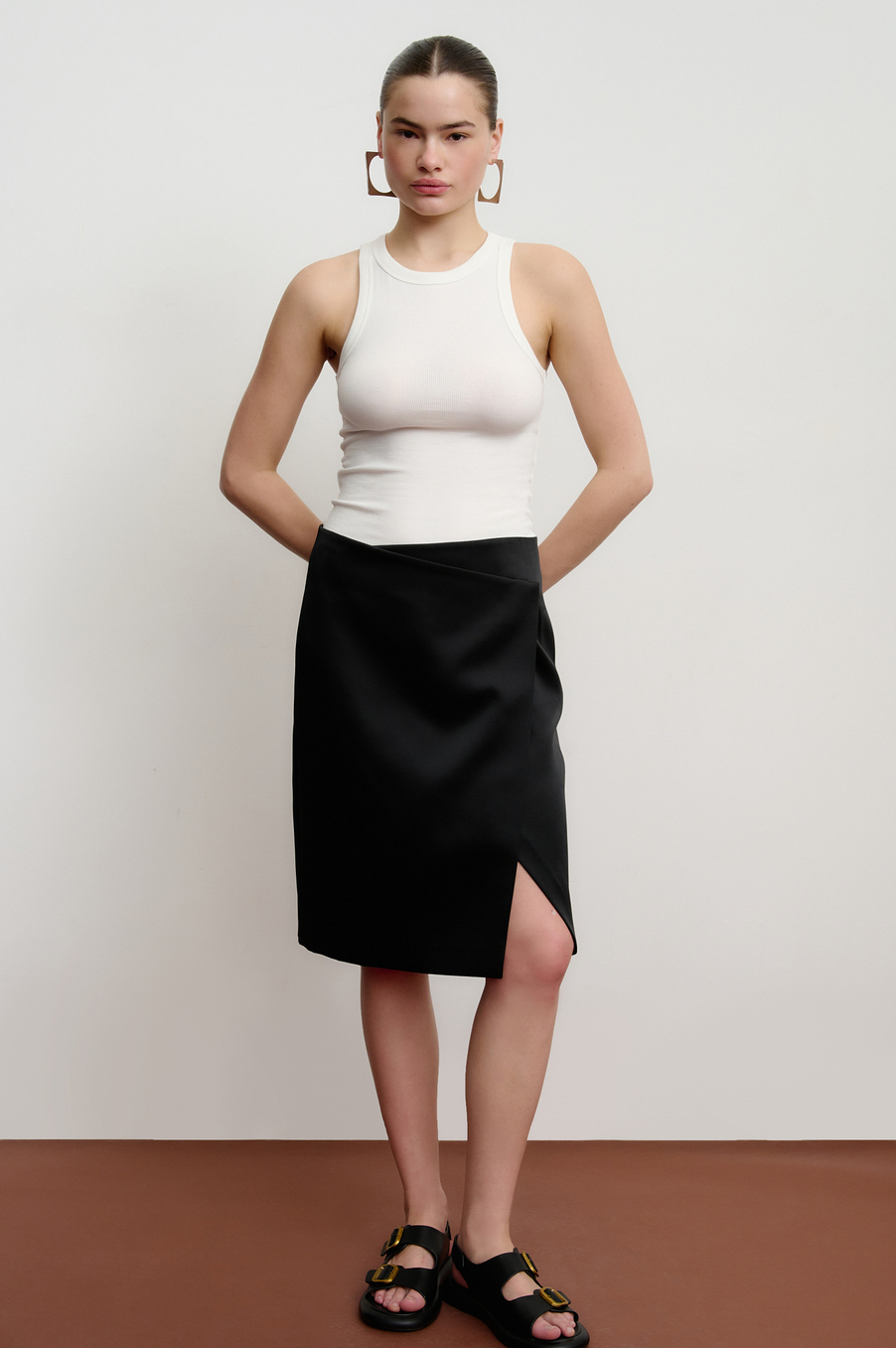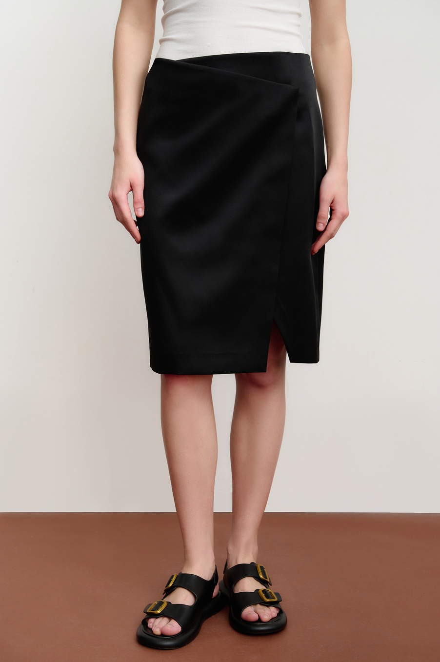 Юбка на запах из сатина в ретростиле сделает ваш образ ярким и нетривиальным. К ней предлагаем подобрать необычные колготки — например, цветные или с узором. Сделайте ставку на украшения и аксессуары — в таком образе в духе 90-х можно и нужно экспериментировать.