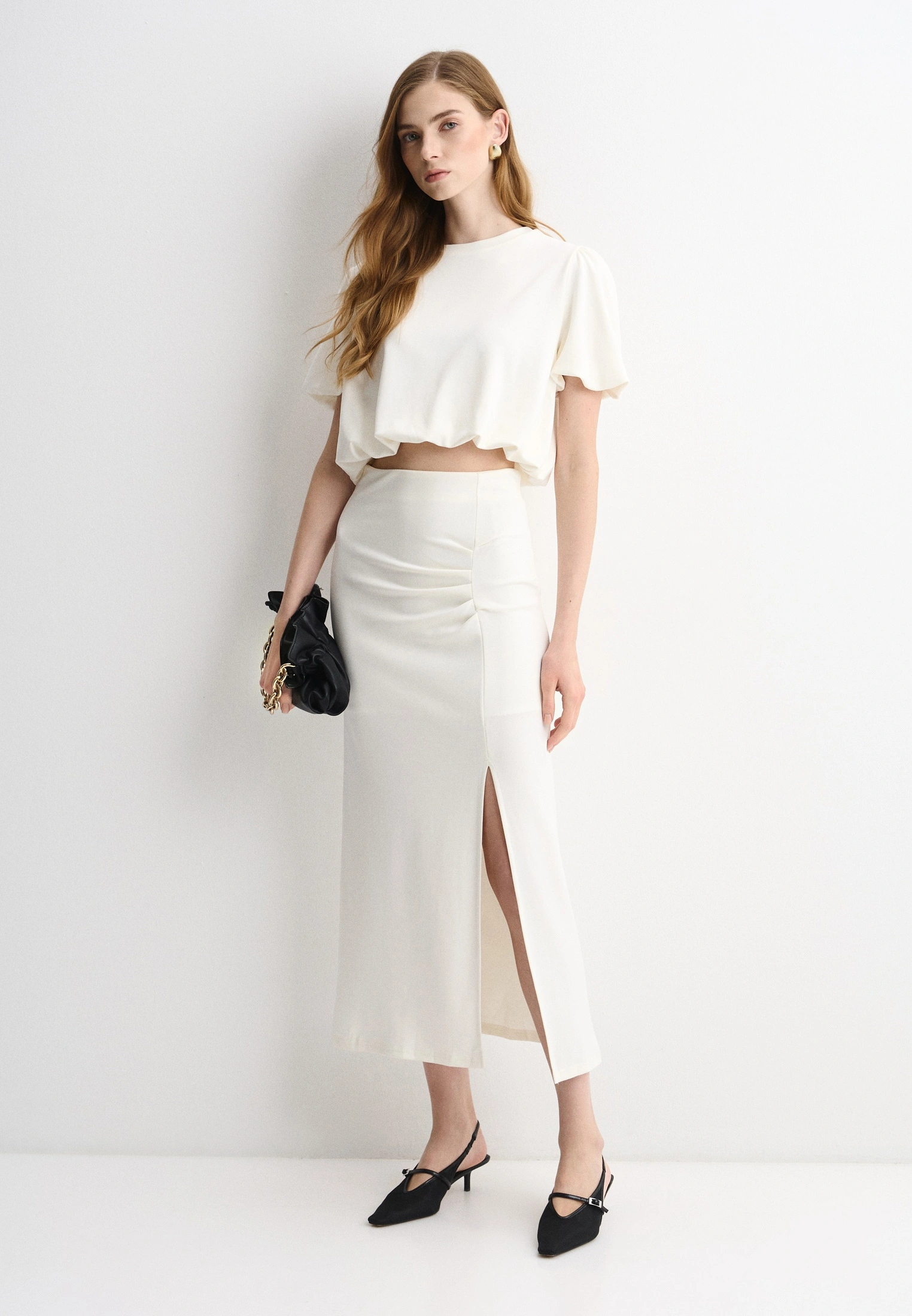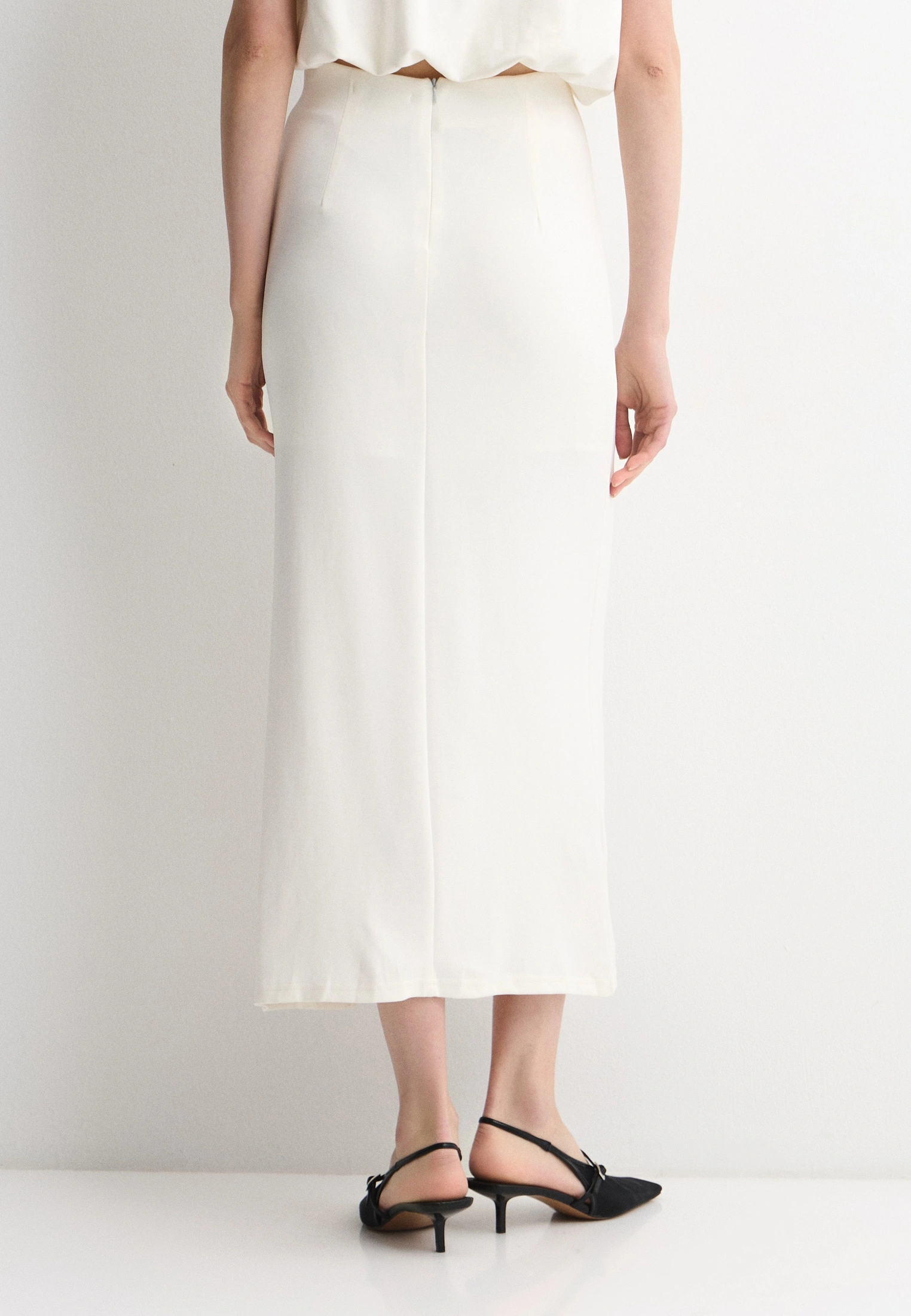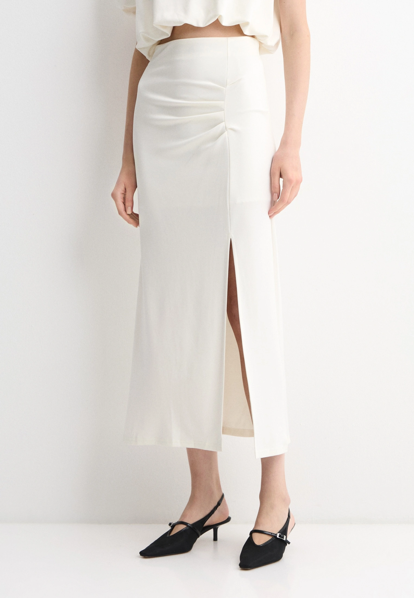 Белая юбка миди с разрезом — идеальный выбор для создания элегантного и стильного образа. Модель сочетает в себе утончённость и женственность, подходит для различных повседневных и вечерних образов.