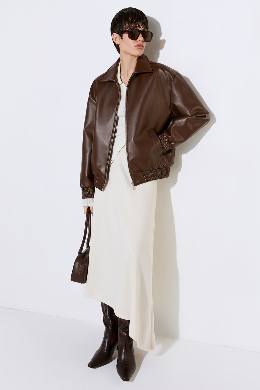 Молочная юбка асимметричного кроя выполнена из неопрена – прочного, легкого, износостойкого материала, который хорошо держит форму. Модель декорирована вышивкой в виде логотипа бренда.