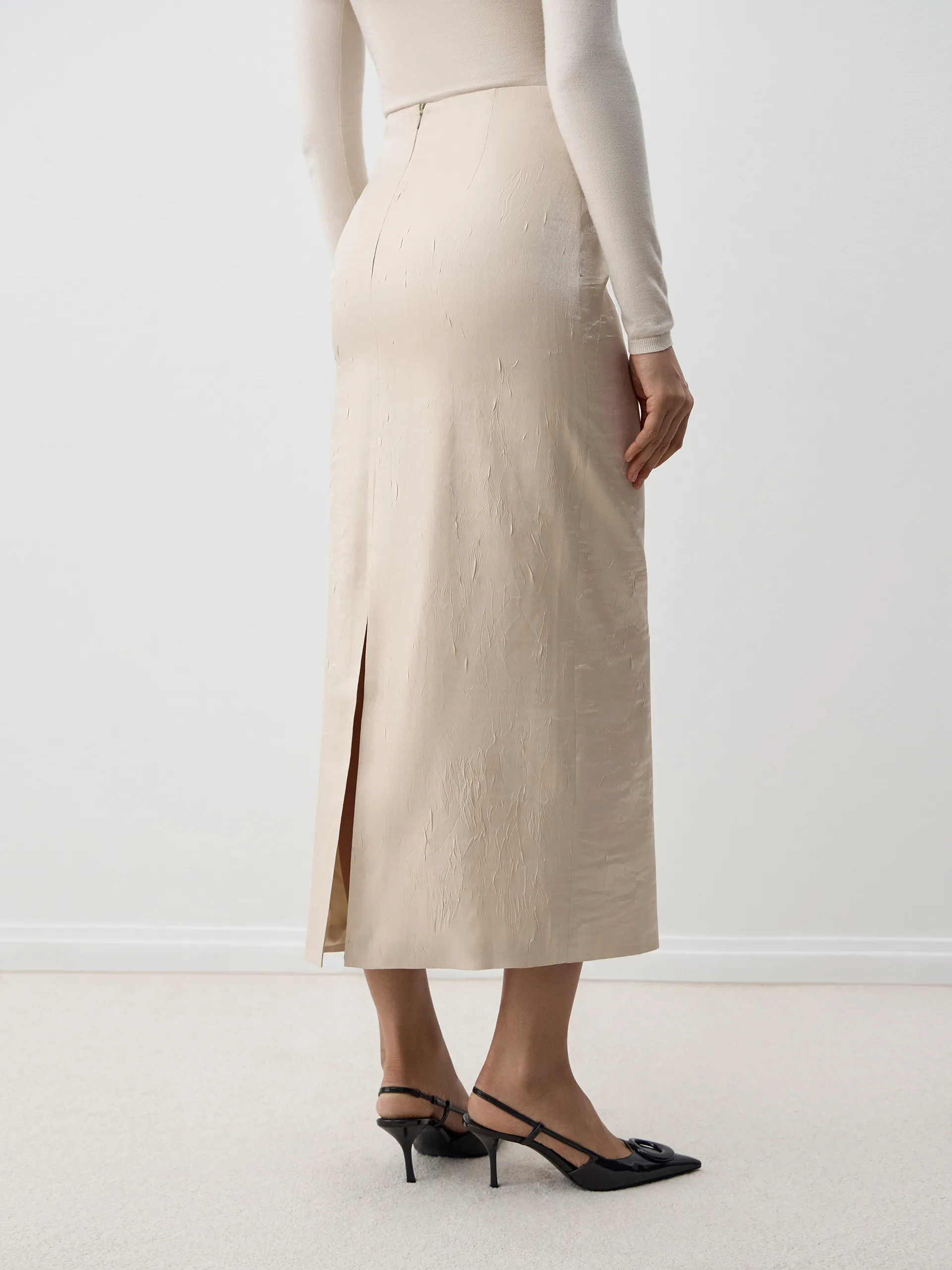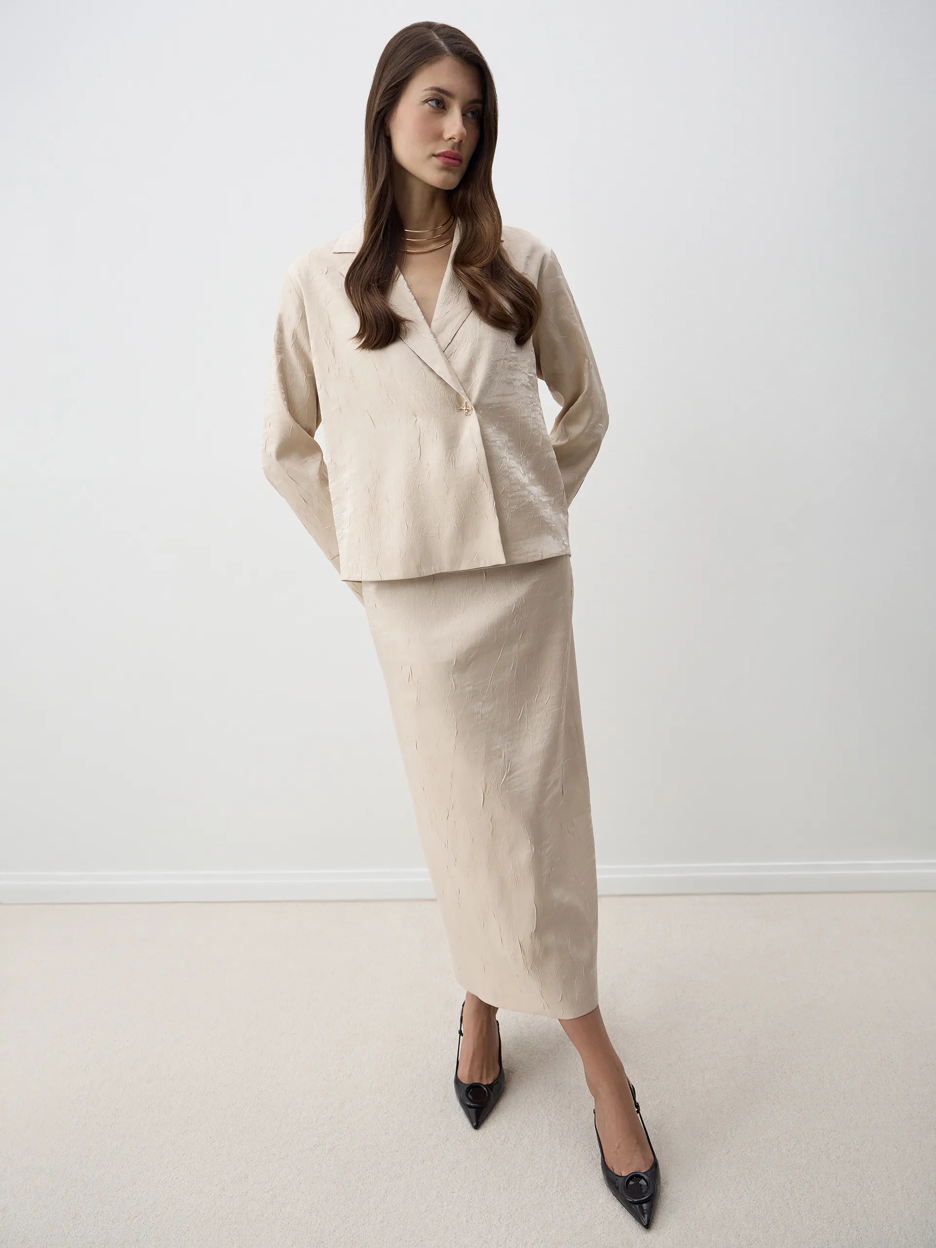 Юбка Lika. Макси-юбка прямого силуэта из итальянской текстурной ткани с деликатной блестящей нитью — изящная и утончённая модель, подчёркивающая женственность и создающая лёгкий, собранный силуэт. Текстурная ткань придаёт изделию выразительную фактуру, а нить переливается на свету, добавляя мягкий блеск и изысканность. Рекомендуем сочетать с жакетом и топом Lika — вместе они формируют гармоничный комплект для офиса, повседневных образов и мероприятий.