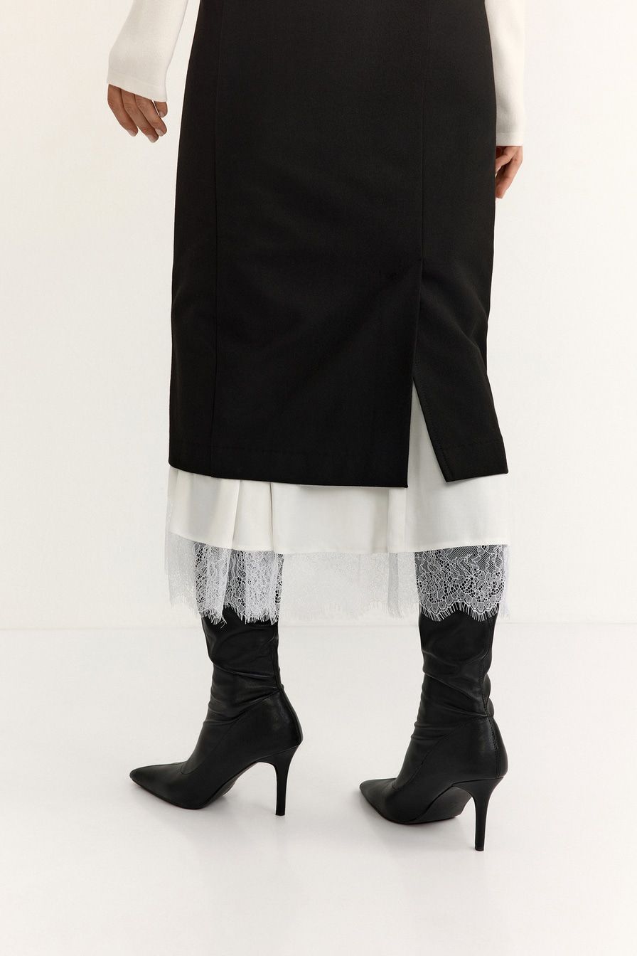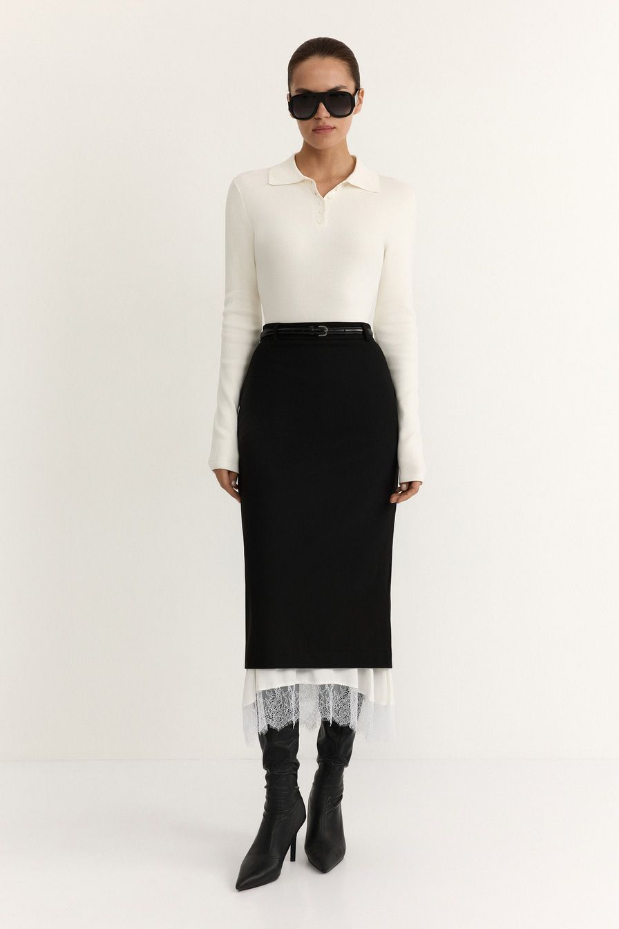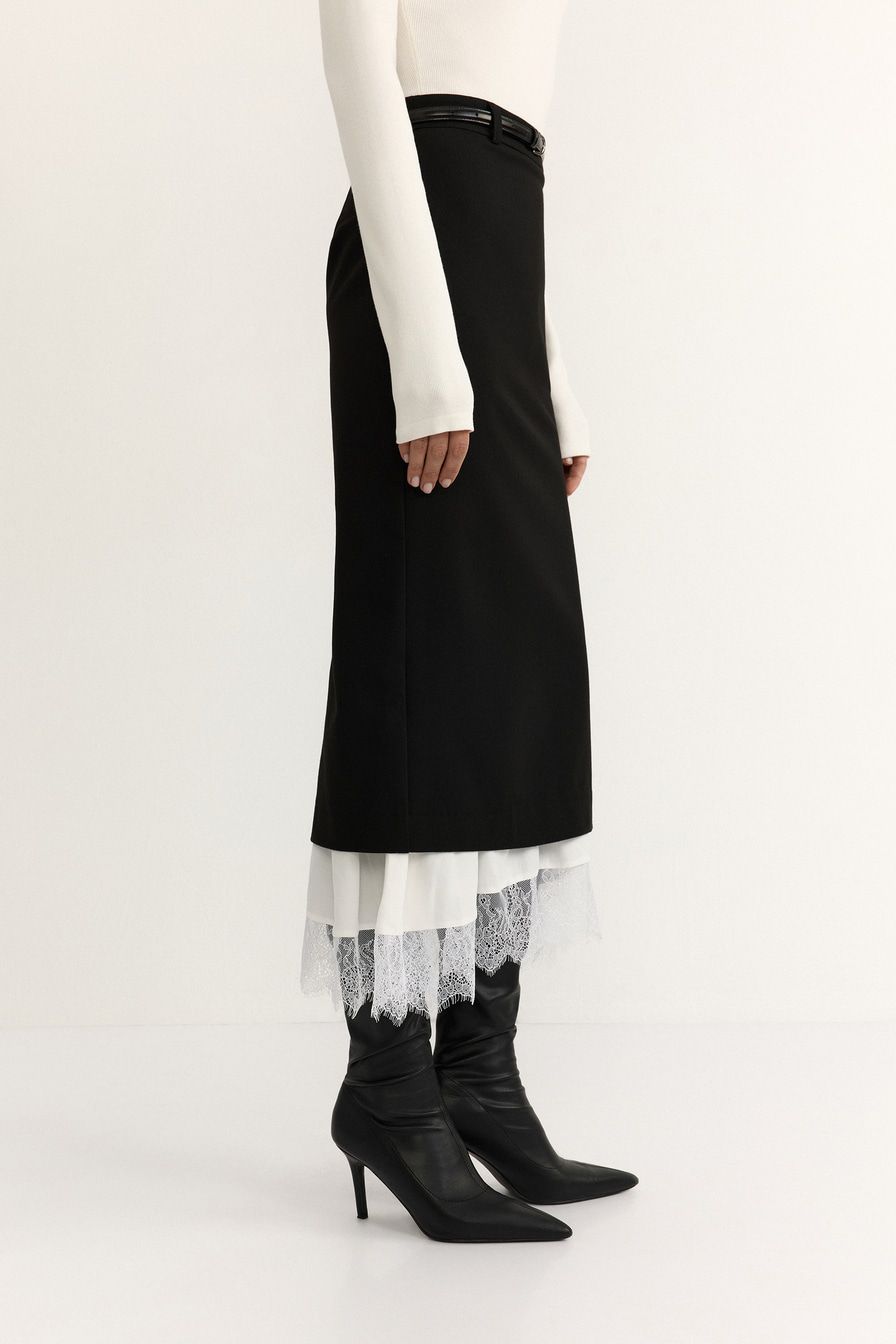 Юбка-карандаш из смесовой вискозы – модель черного цвета. Юбка дополнена контрастной подкладкой с кружевной отделкой.