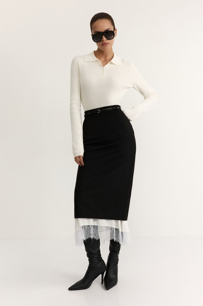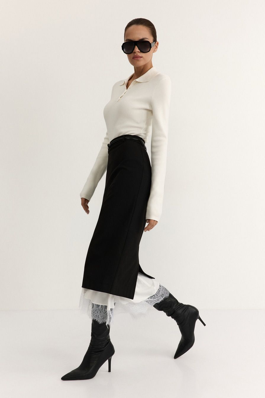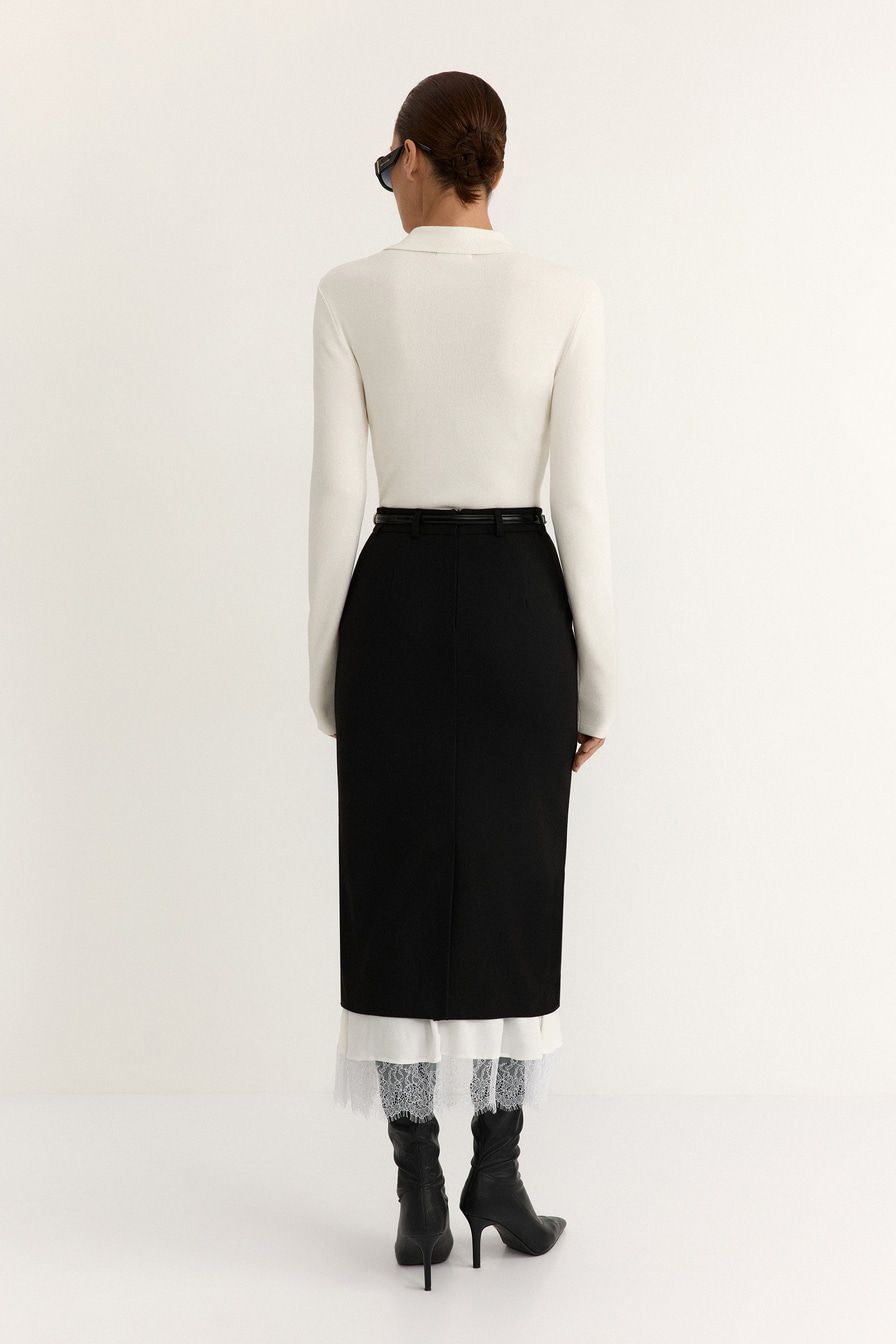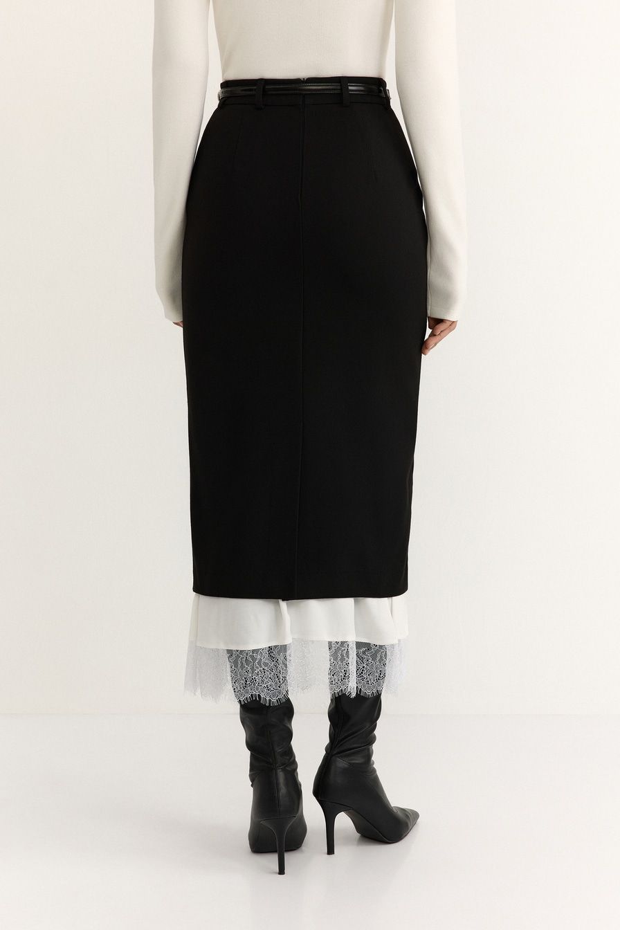 Юбка-карандаш из смесовой вискозы – модель черного цвета. Юбка дополнена контрастной подкладкой с кружевной отделкой.