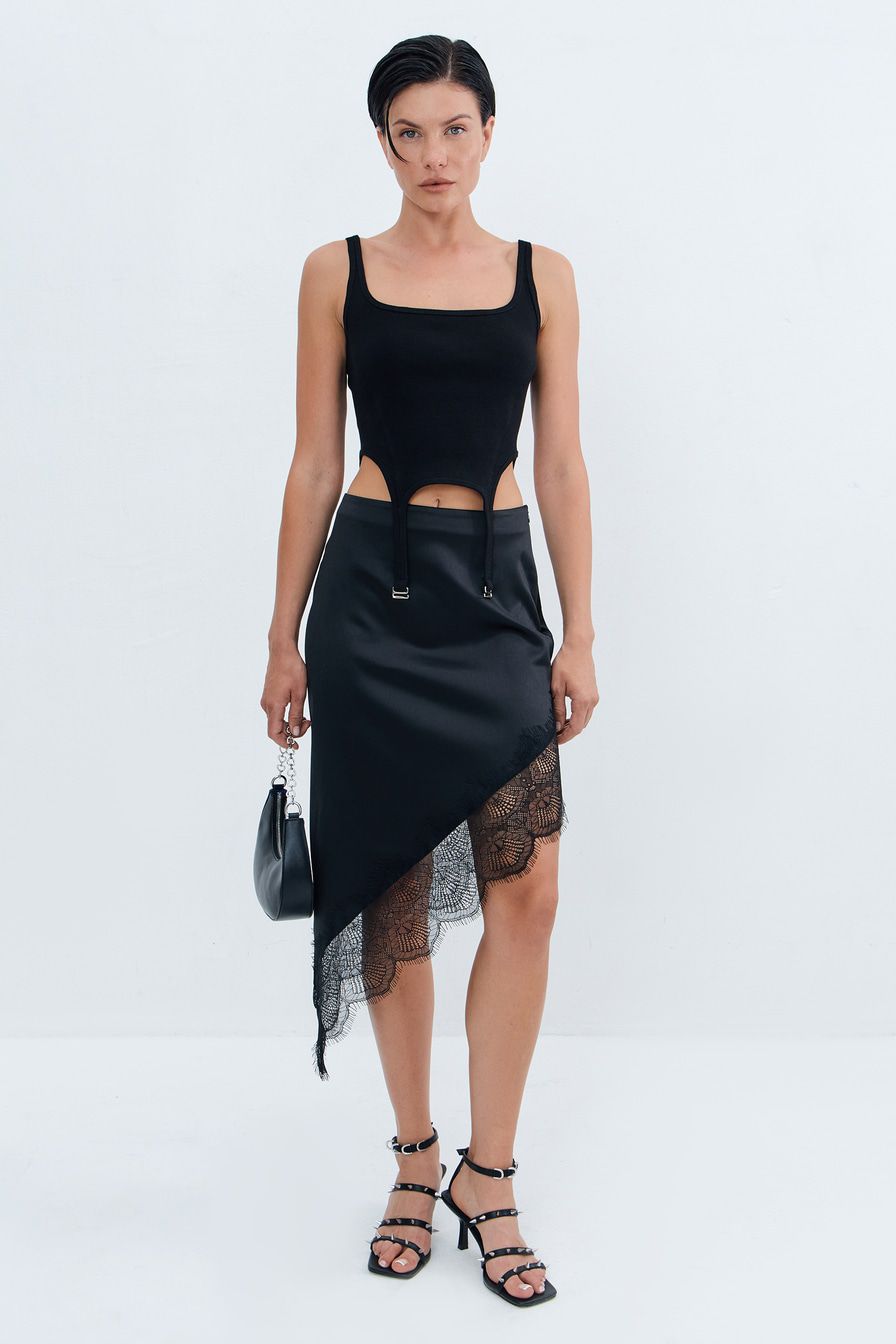Черная юбка с асимметричным низом – модель прямого кроя. Юбка декорирована кружевной отделкой.