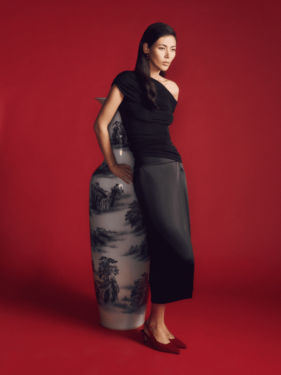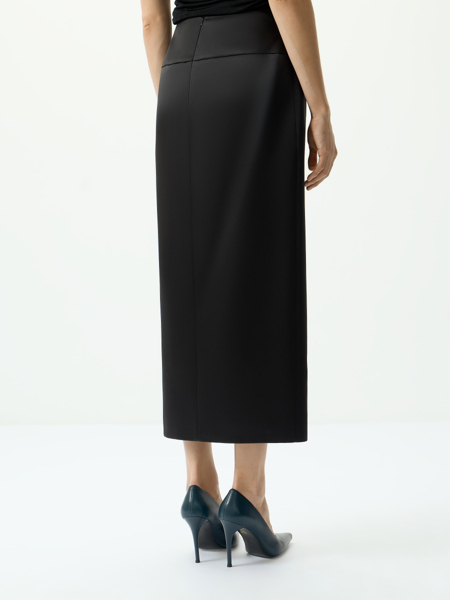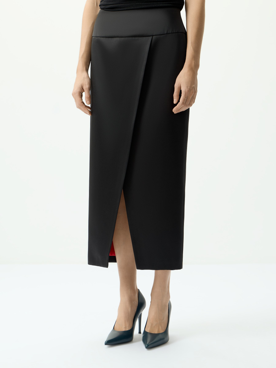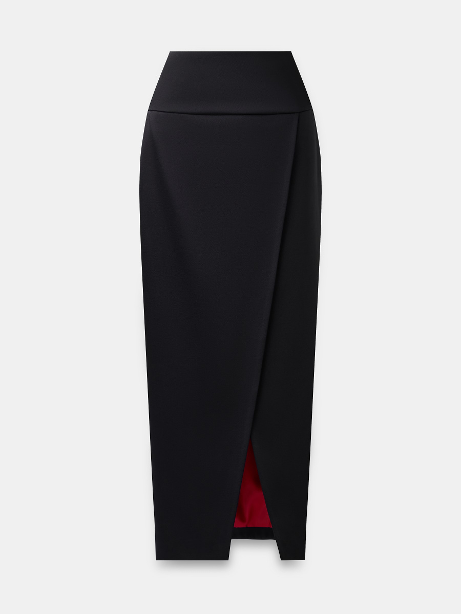 Юбка мидикси на фиксированный запах с разрезом и контрастной красной подкладкой, которая словно подсвечивает изделие и придает ему визуальную глубину. Широкий отрезной пояс моделирует силуэт и позволяет избежать лишних складок. Плотное полотно с шелковистым блеском — в меру нарядное и несминаемое. Потайная застежка на нейлоновую молнию в тон.