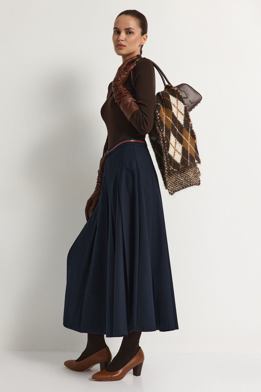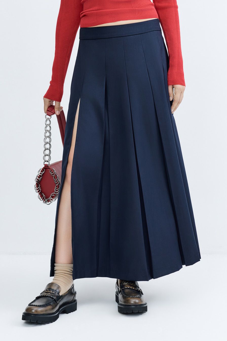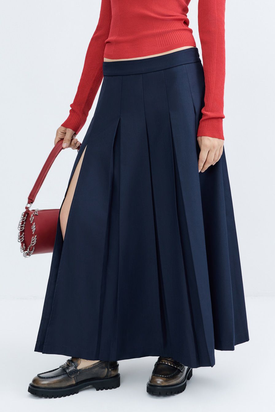 Юбка-макси А-силуэта из смесовой вискозы – модель темно-синего цвета. Юбка декорирована складками и высоким разрезом.