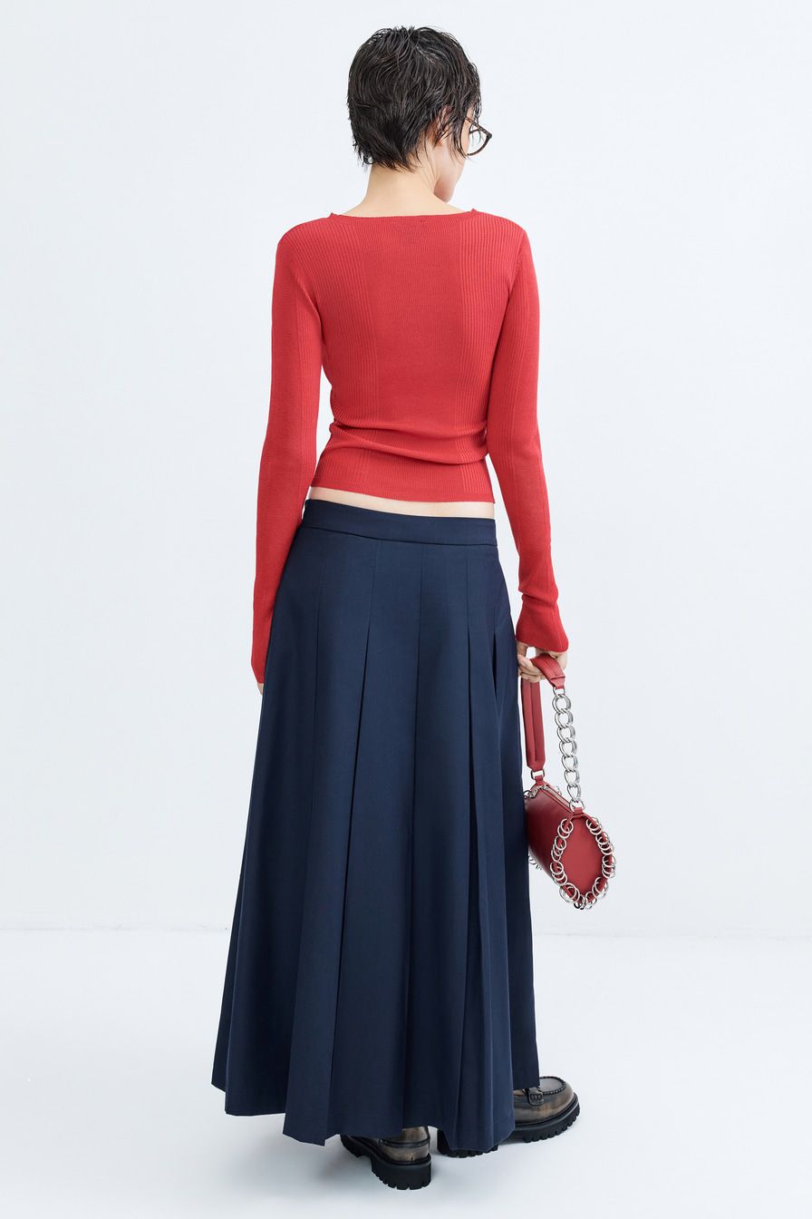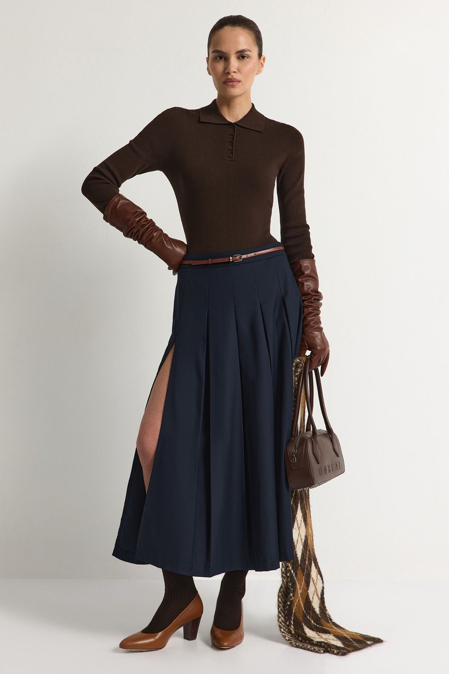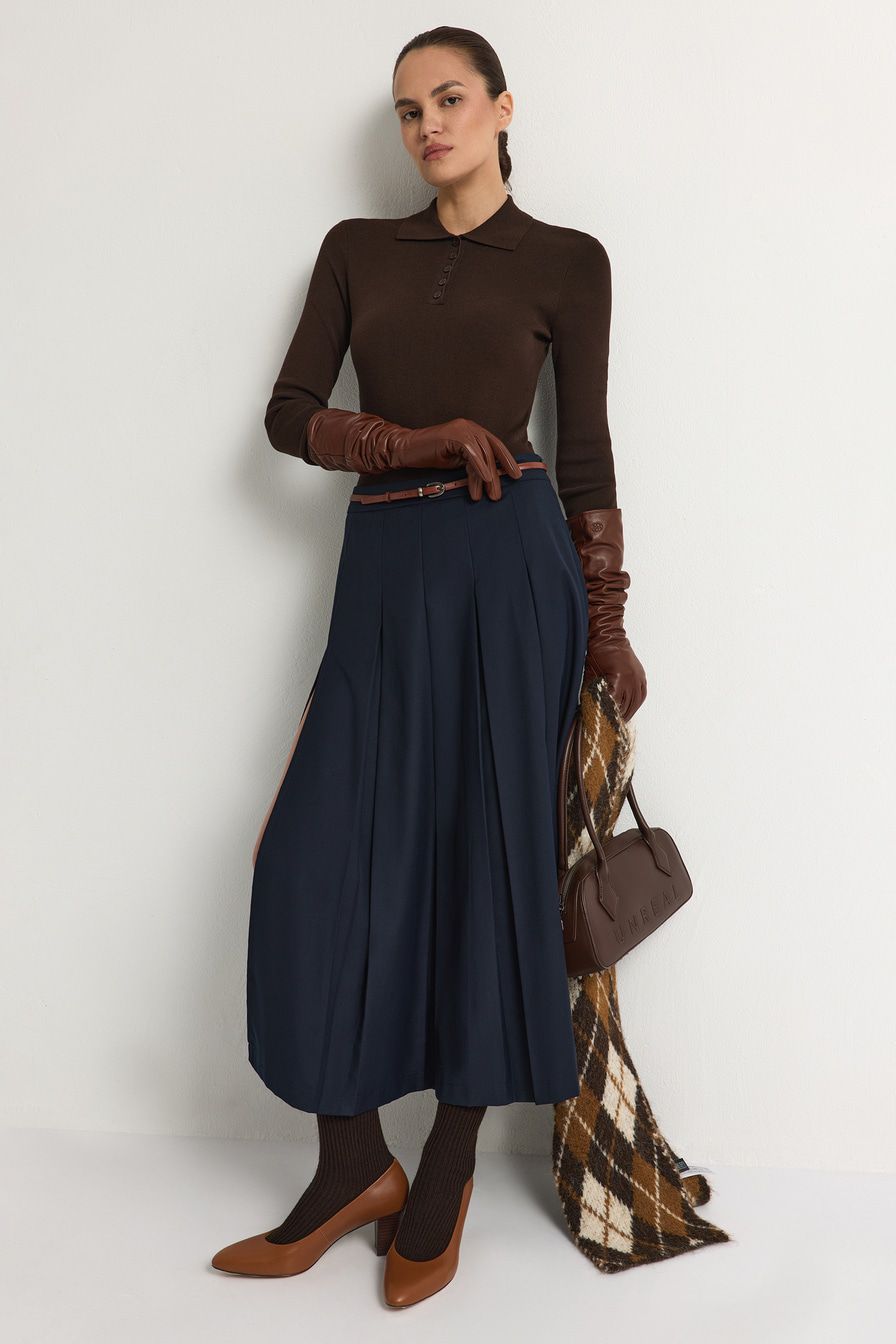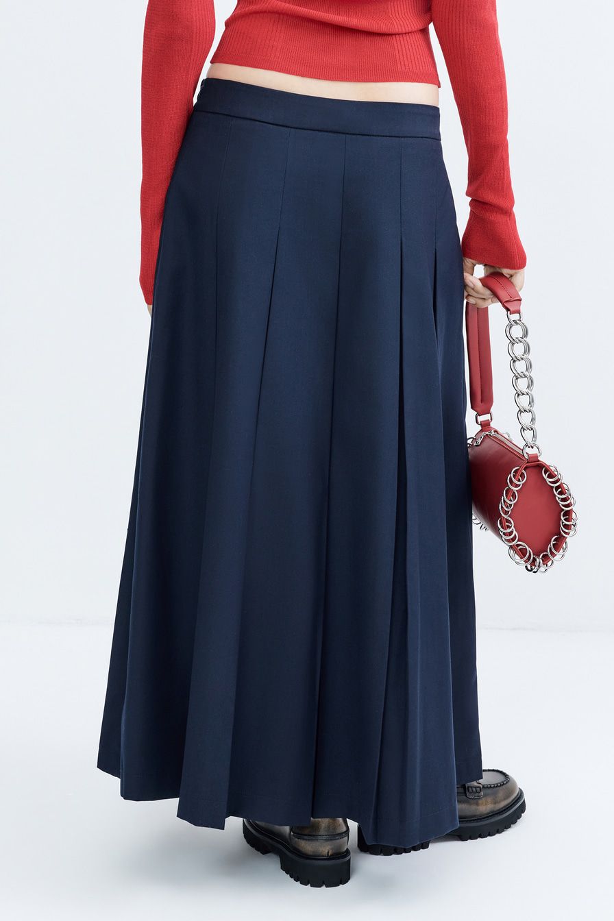 Юбка-макси А-силуэта из смесовой вискозы – модель темно-синего цвета. Юбка декорирована складками и высоким разрезом.