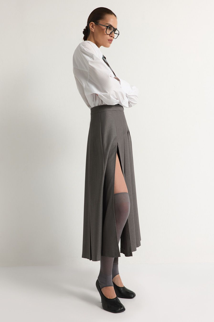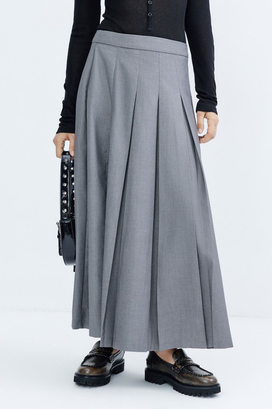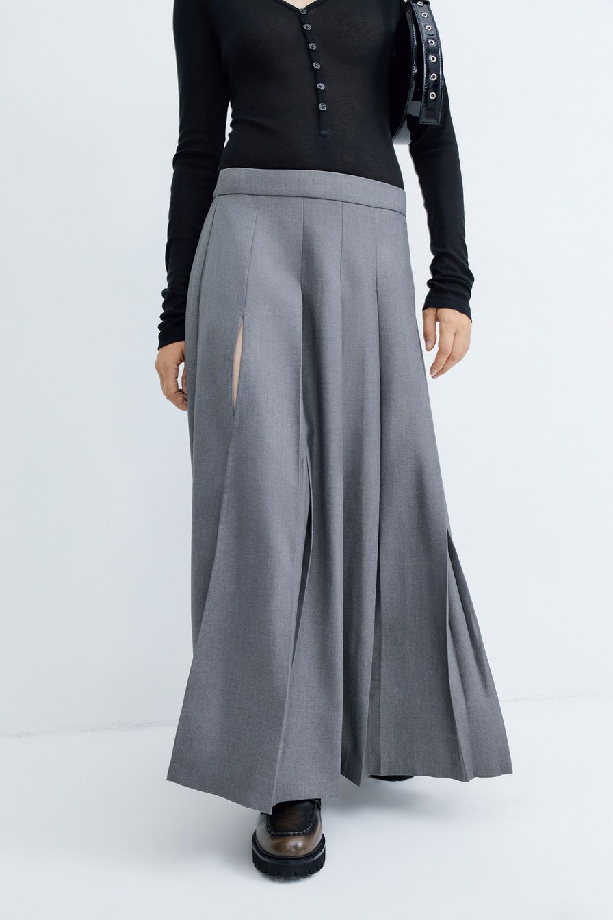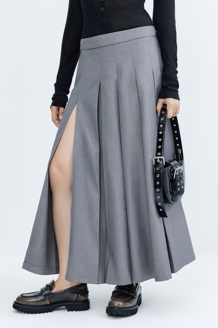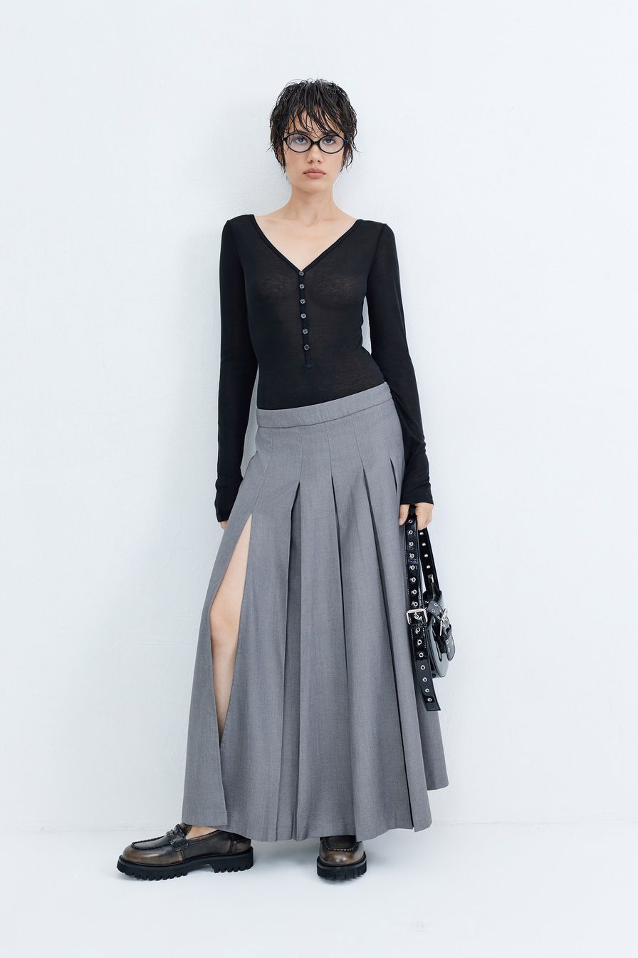 Юбка-макси А-силуэта из смесовой вискозы – модель серого цвета. Юбка декорирована складками и высоким разрезом.