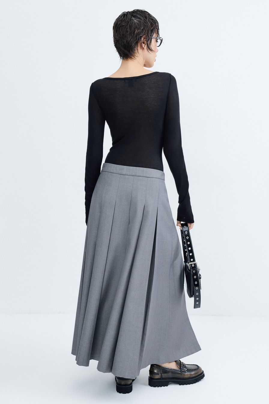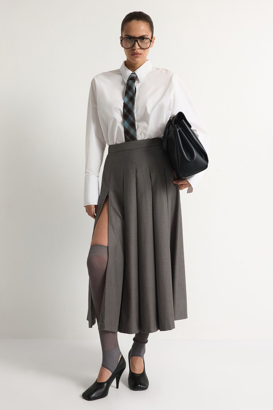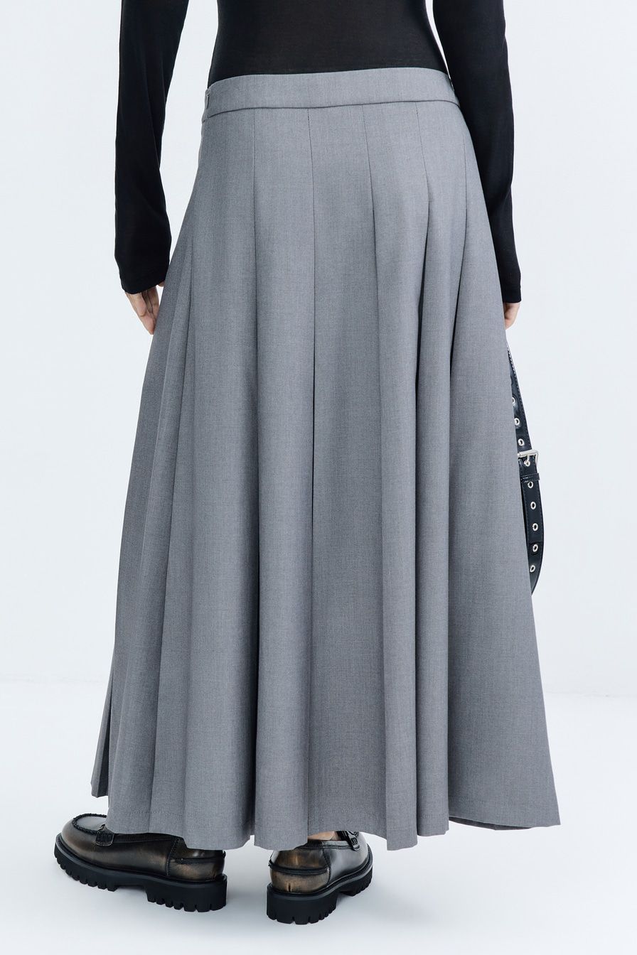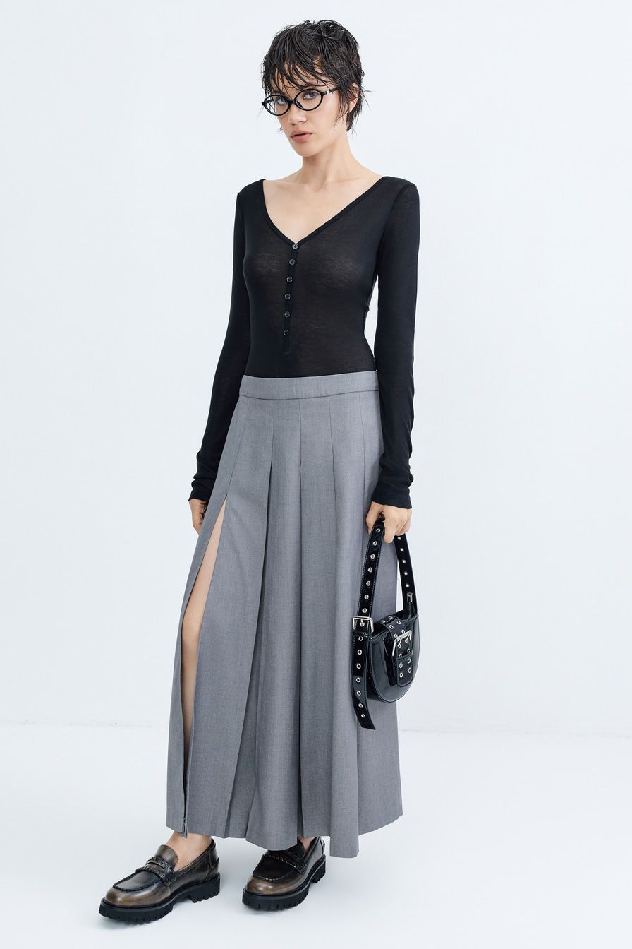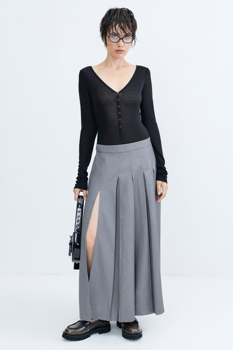 Юбка-макси А-силуэта из смесовой вискозы – модель серого цвета. Юбка декорирована складками и высоким разрезом.