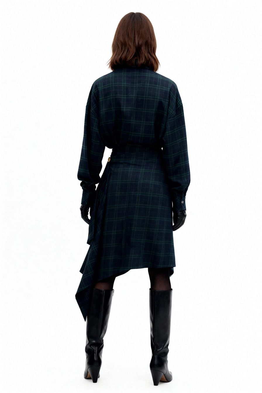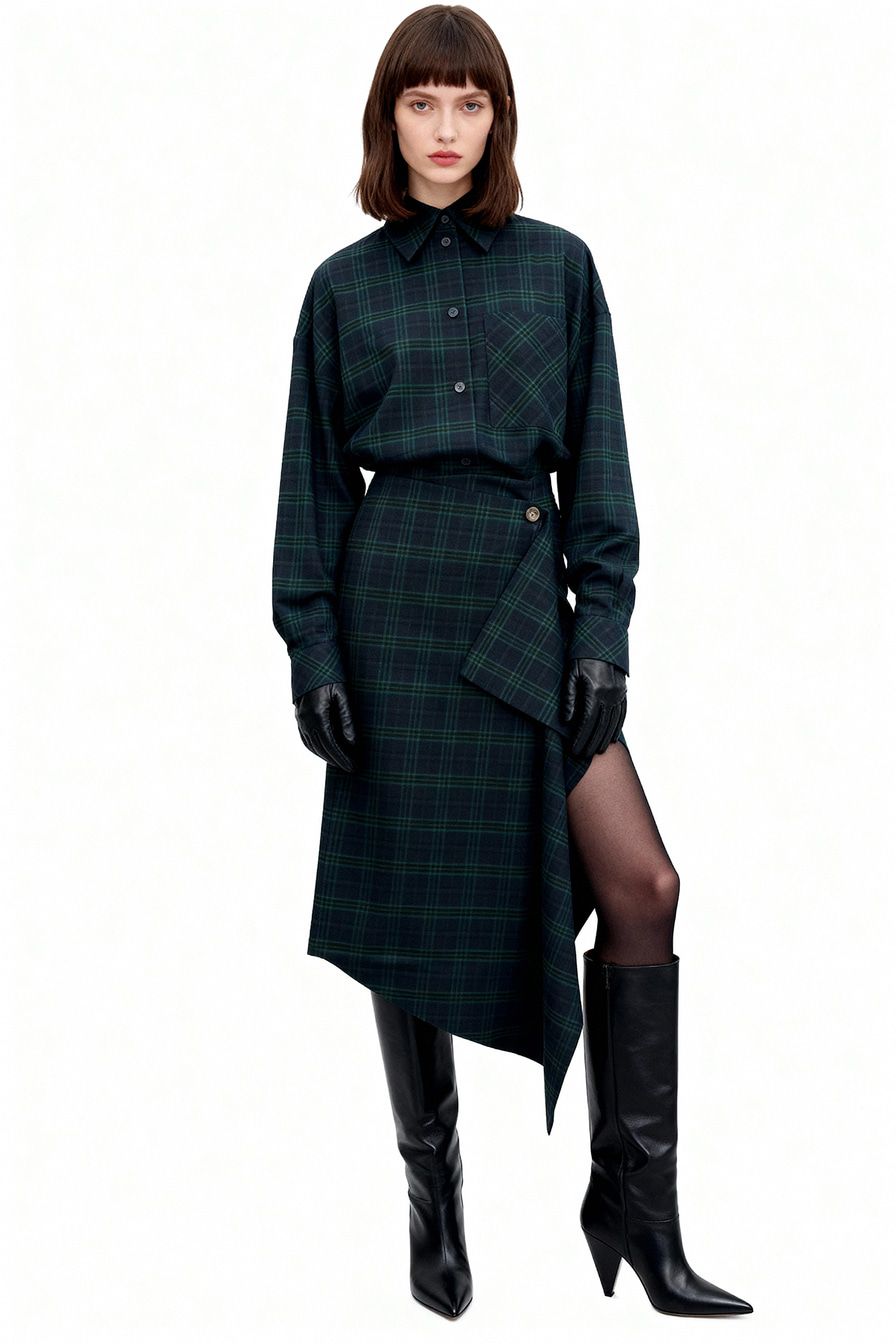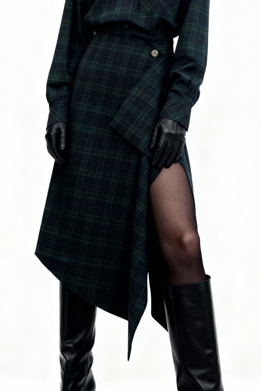 Юбка-миди из смесовой вискозы – модель асимметричного кроя с запа́хом и застежкой на пуговицу. Юбка декорирована клетчатым принтом «тартан».