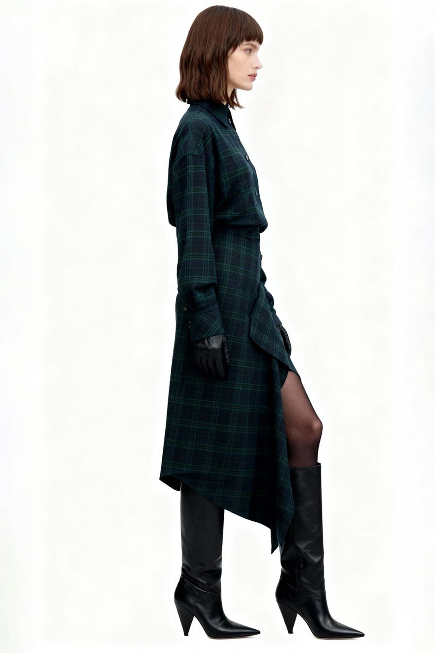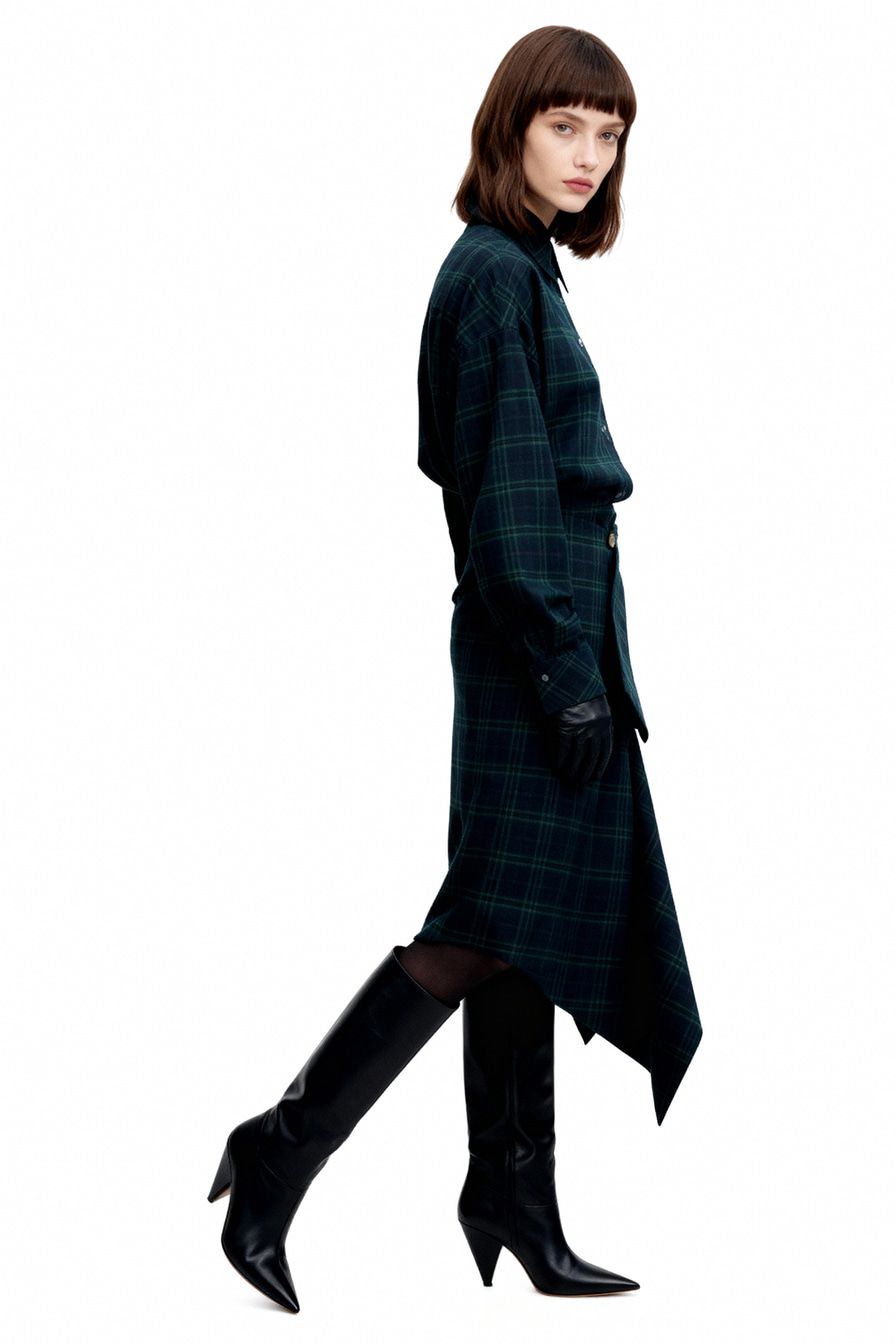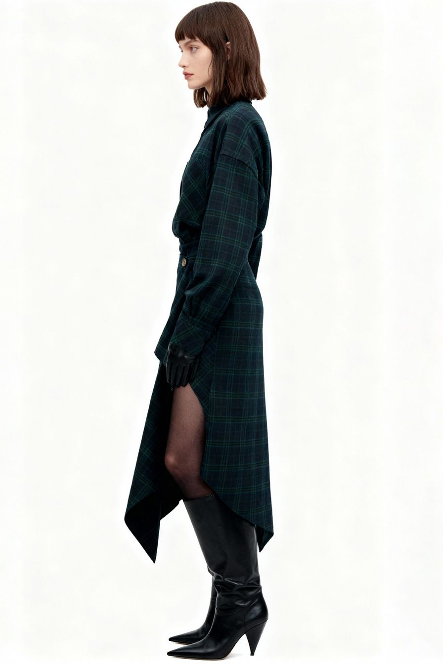 Юбка-миди из смесовой вискозы – модель асимметричного кроя с запа́хом и застежкой на пуговицу. Юбка декорирована клетчатым принтом «тартан».