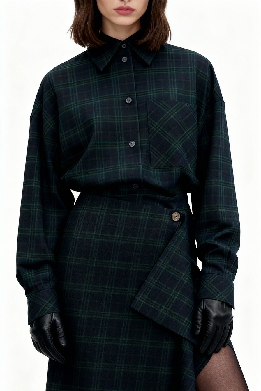 «Для бранча с подругами сочетайте юбку с оверсайз-рубашкой из комплекта, высокими облегающими сапогами с острым мысом и небольшой сумкой-багетом».