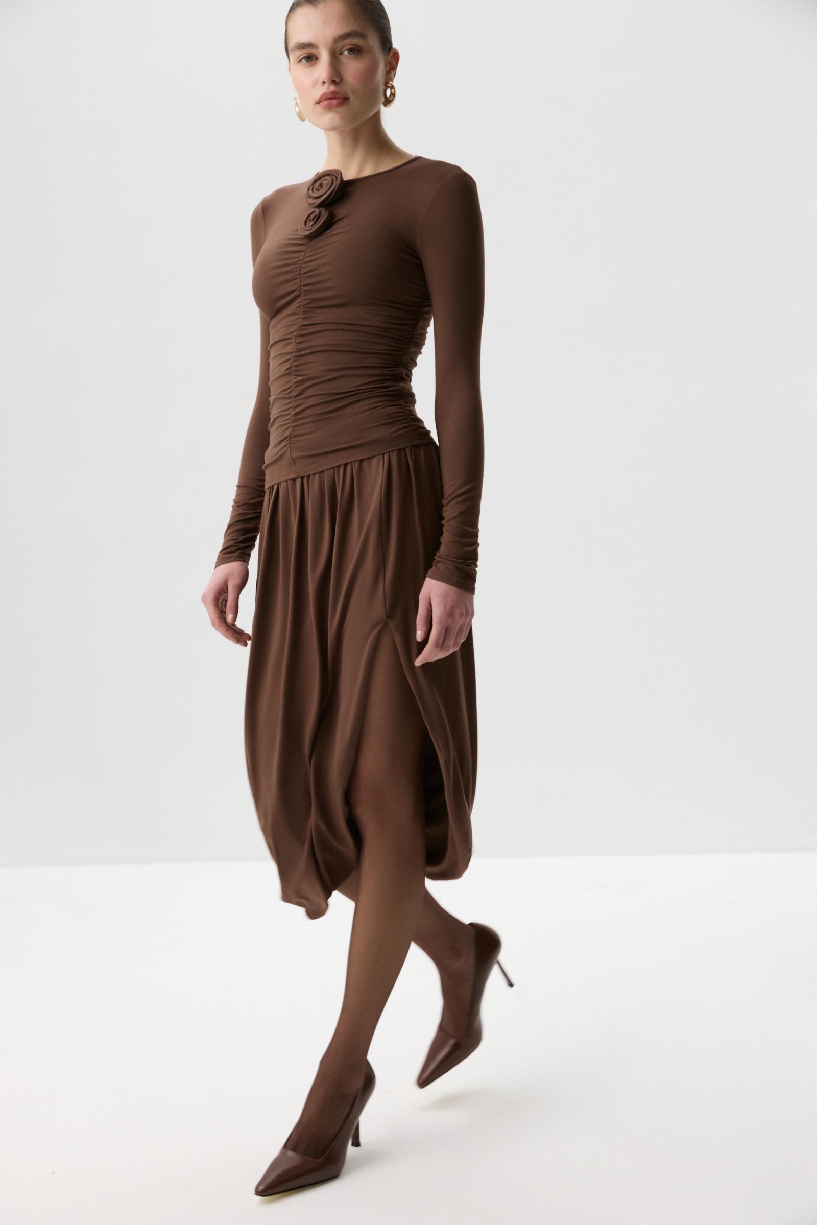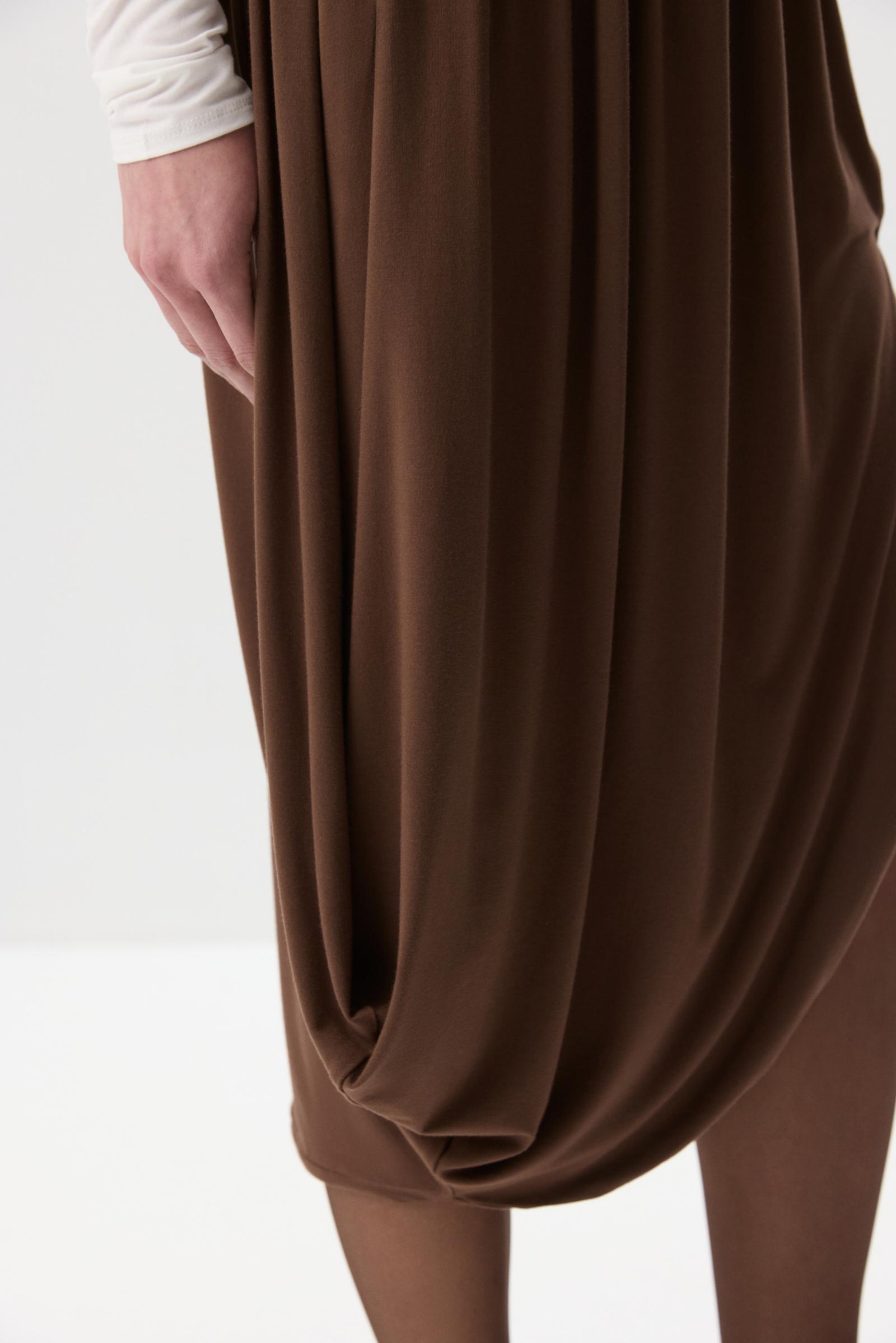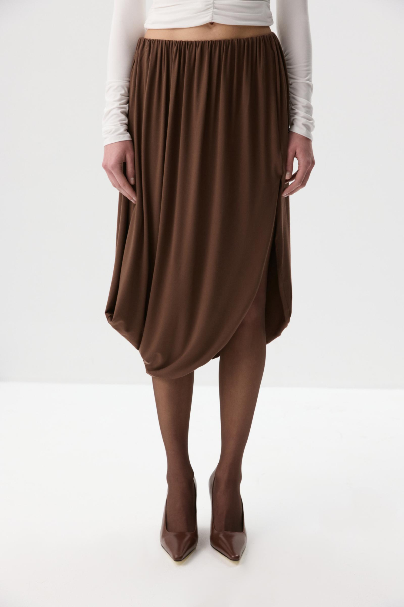 Юбка баллон из мягкого плотного трикотажа. Длина миди, собрана на резинку по талии. За счет ритмичной драпировки изделие добавляет динамичности любому образу. Юбка на трикотажной подкладке.