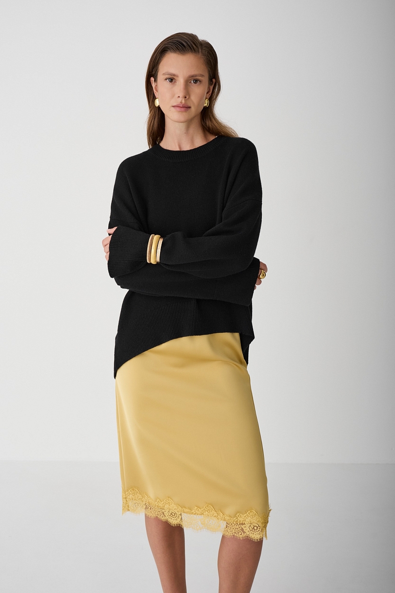 Юбка миди с кружевом — элегантная модель средней длины. Изделие выполнено из полупрозрачного кружева с выразительным ажурным узором по низу. Такая юбка подходит для романтических и вечерних образов, легко сочетается с однотонными топами и блузами.