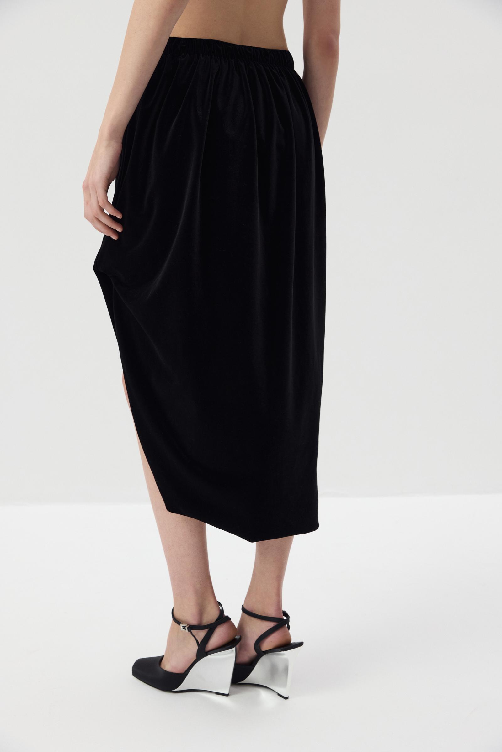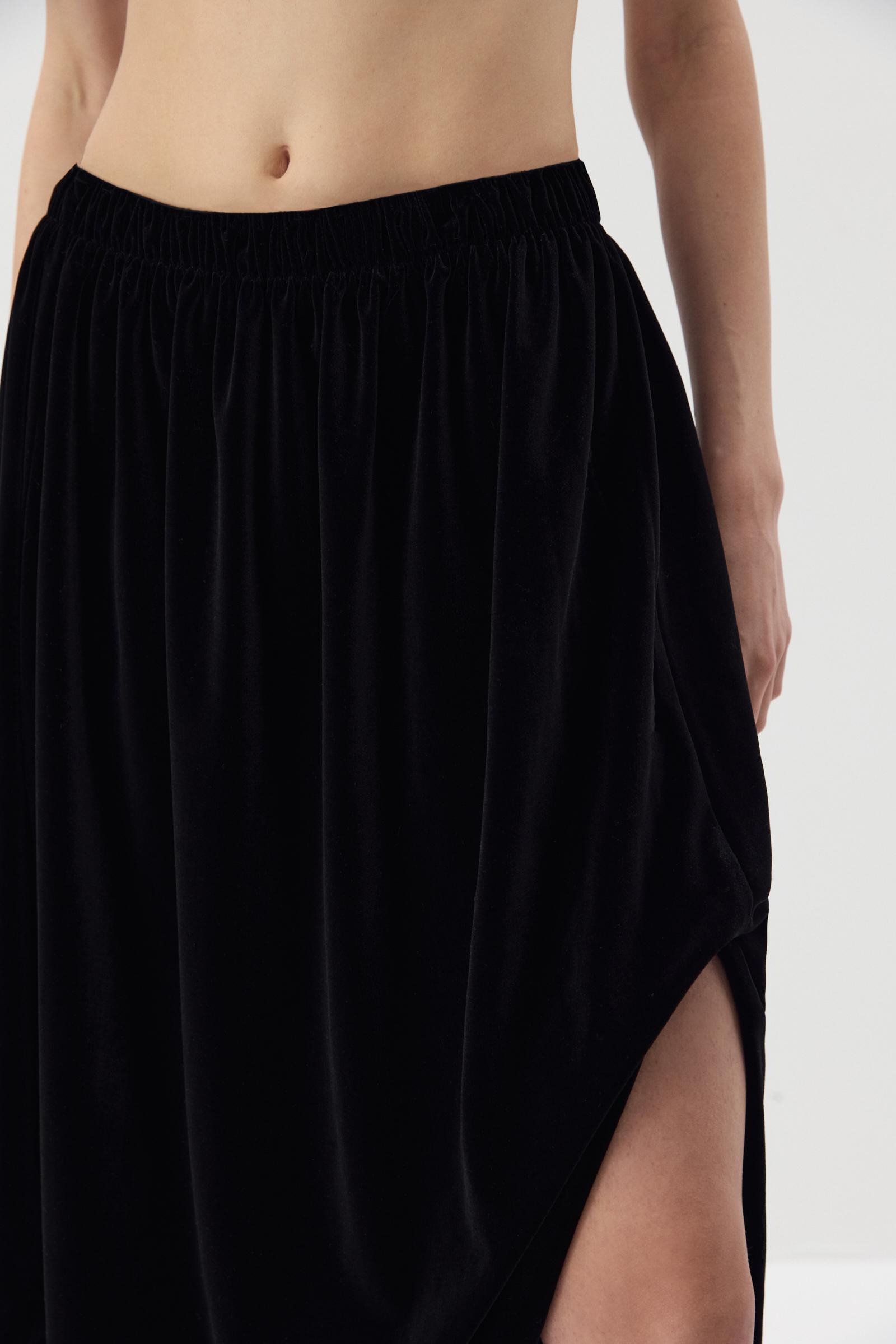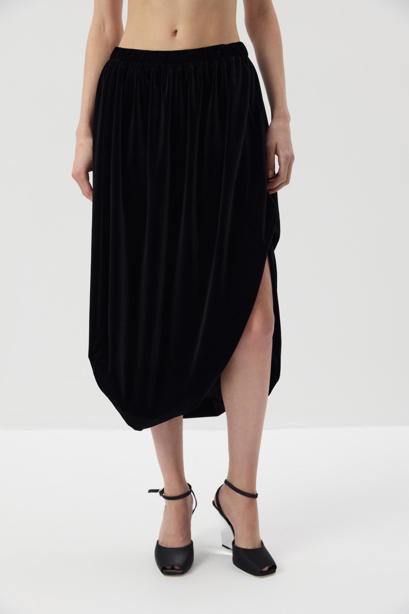Юбка баллон из плотного бархата с густым ровным ворсом. Длина миди, собрана на резинку по талии. За счет ритмичной драпировки изделие добавляет динамичности любому образу. Юбка на трикотажной подкладке.