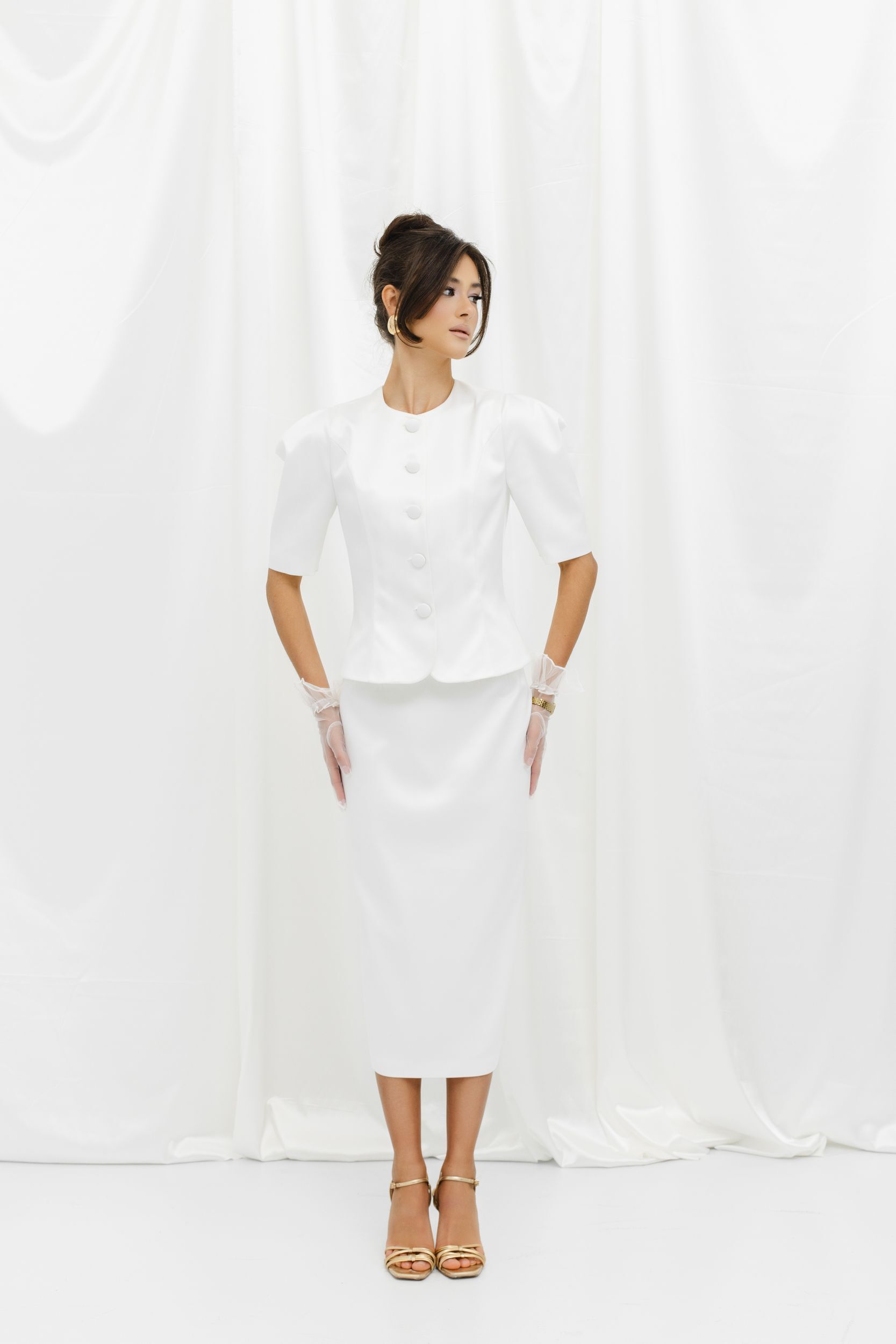 Рекомендуем сочетать с блузой из атласа аналогичного оттенка из нашей коллекции.
