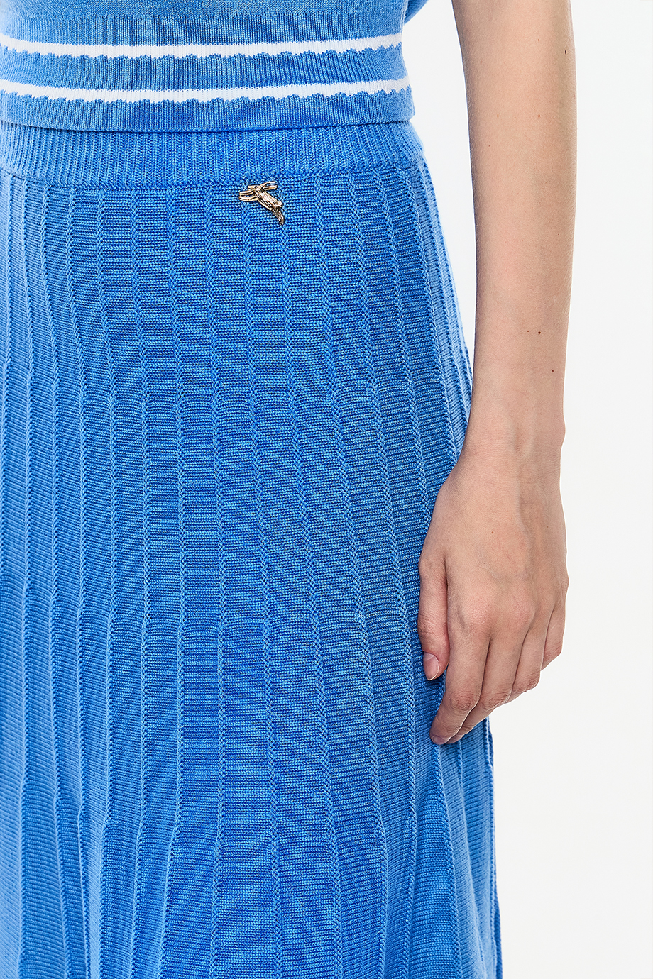 Вязаная юбка-миди голубого оттенка в складку. Модель А-силуэта, выполненная из тонкого трикотажа с добавлением кашемира, дополнена тонким эластичным поясом.