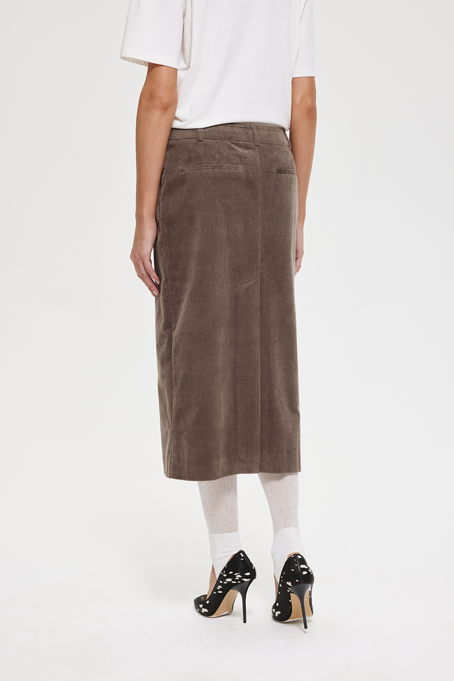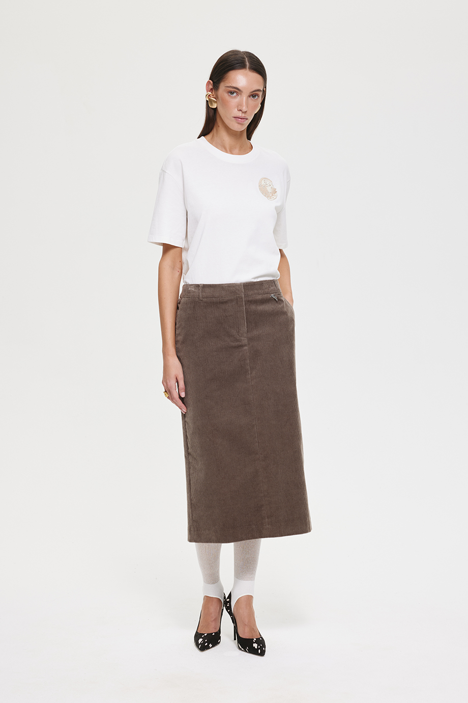 Вельветовая юбка-миди прямого кроя в коричневом цвете — идеальный выбор для создания стильного и комфортного образа. Универсальная модель подойдёт для различных повседневных ситуаций.