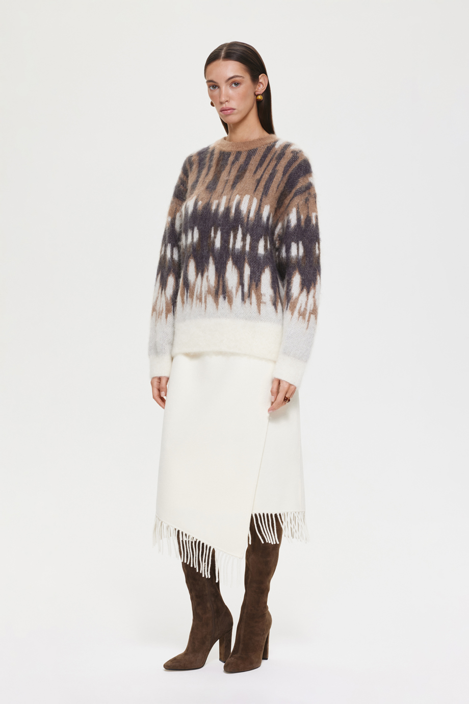 Женская шерстяная юбка, словно сотканная из мягкого шарфа молочного цвета, представляет собой воплощение нежности и тепла. Этот уникальный фасон создаёт изящный и воздушный образ, подчёркивая женственность.