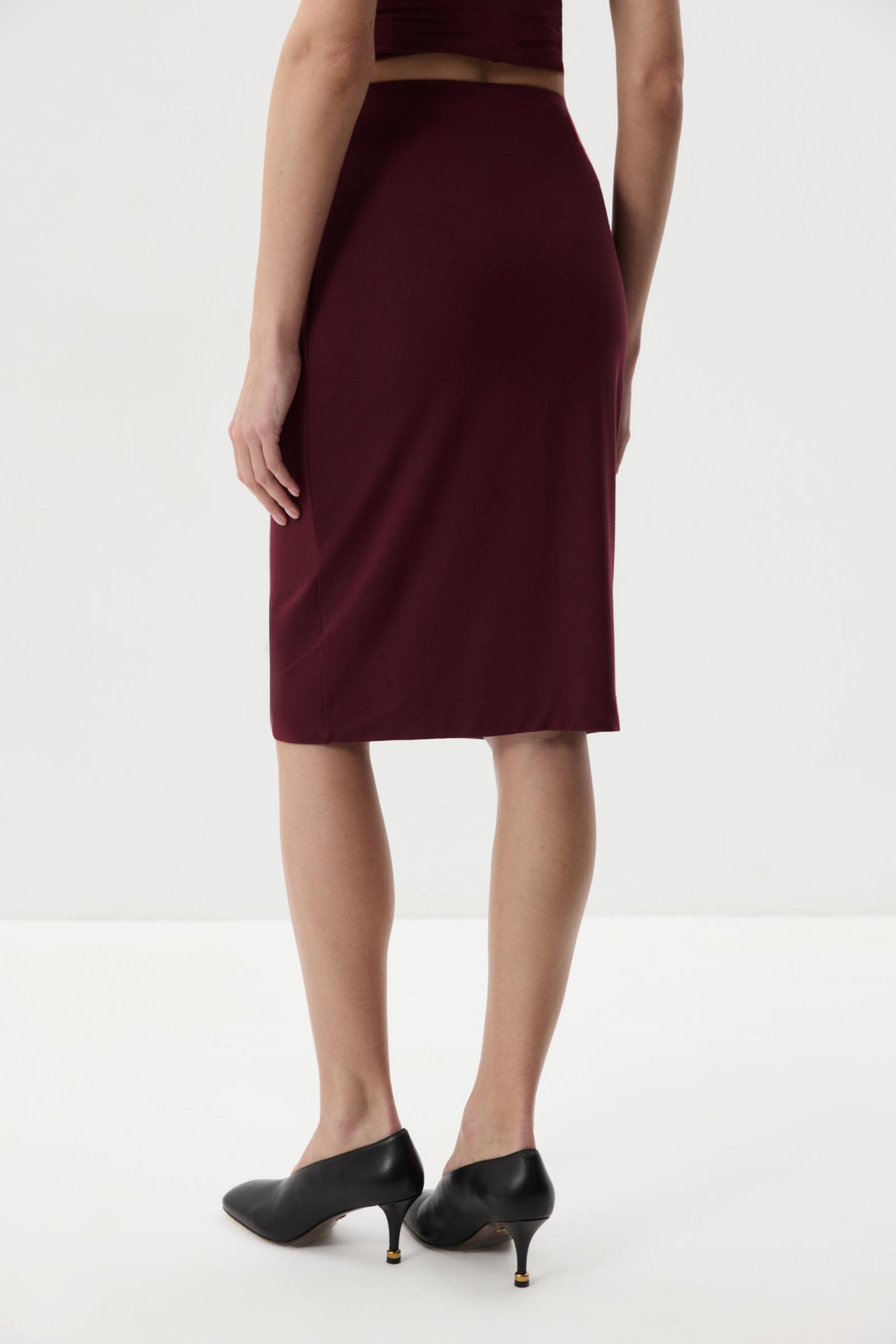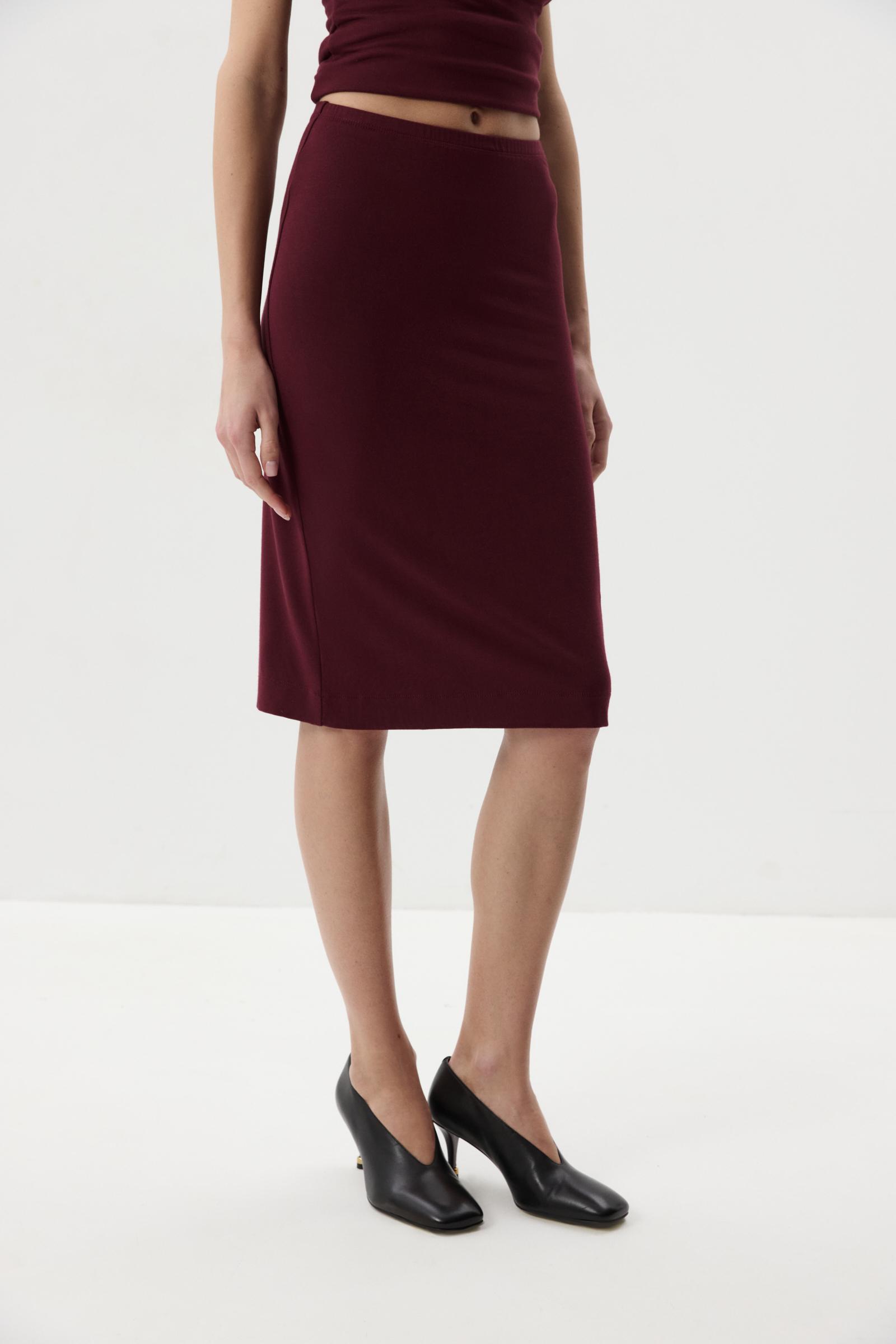 Юбка из мягкого вискозного триктажа в длине до линии колен. Прямой силуэт, идеальная длина, деликатная тонкая резинка по линии талии. По линии низа широкая подгибка.