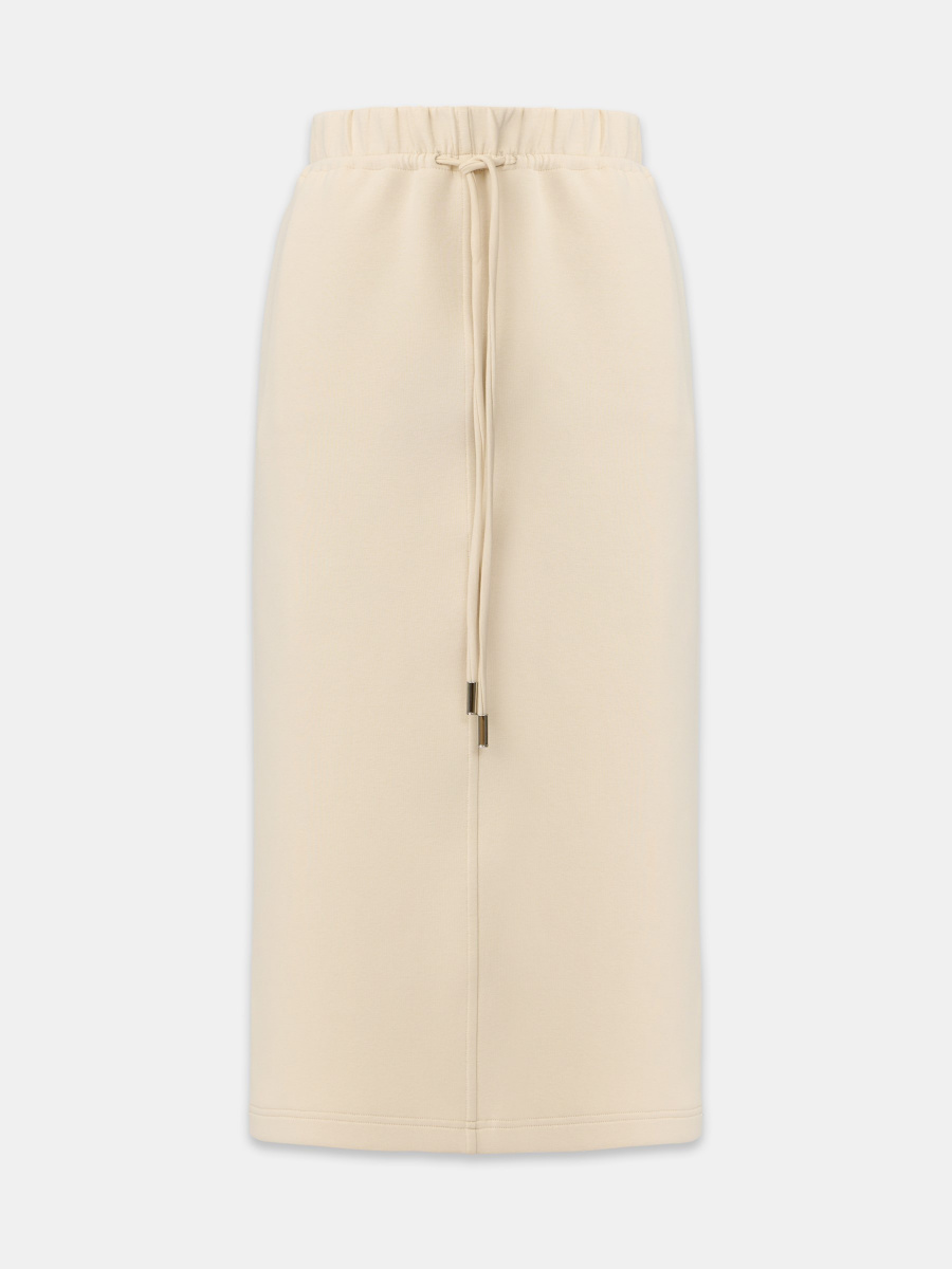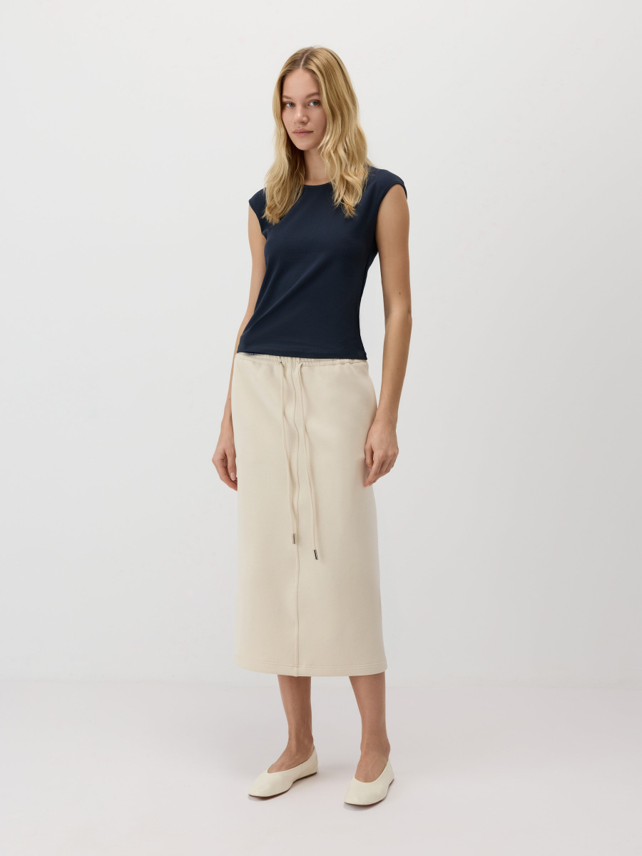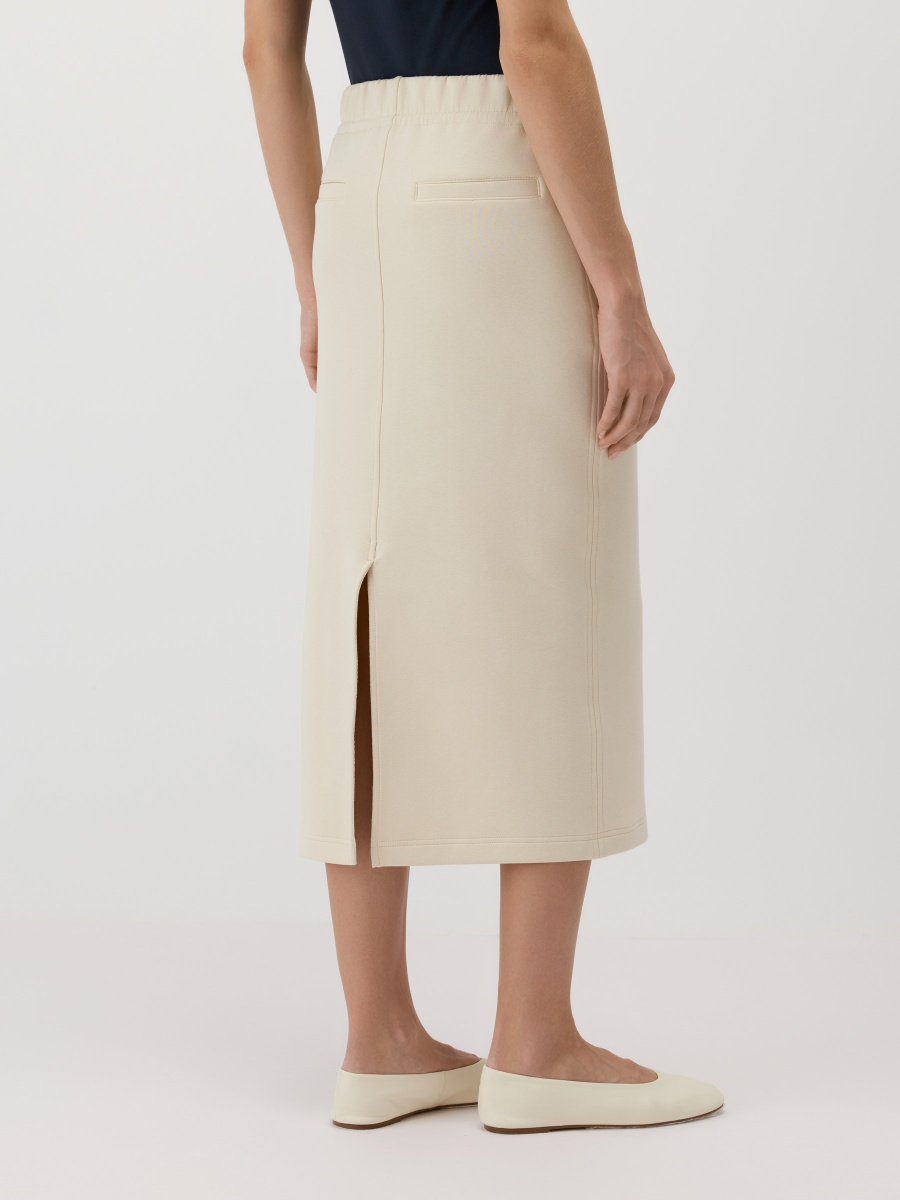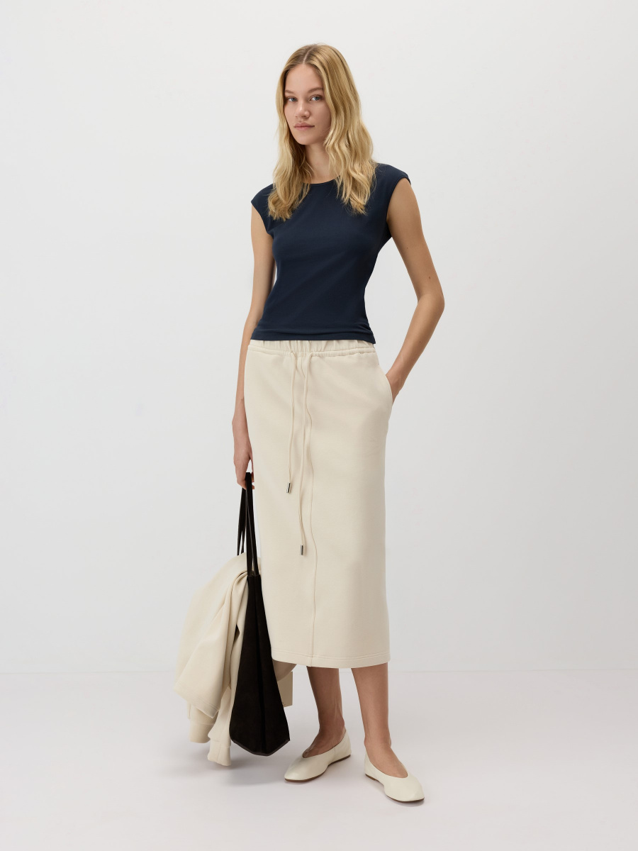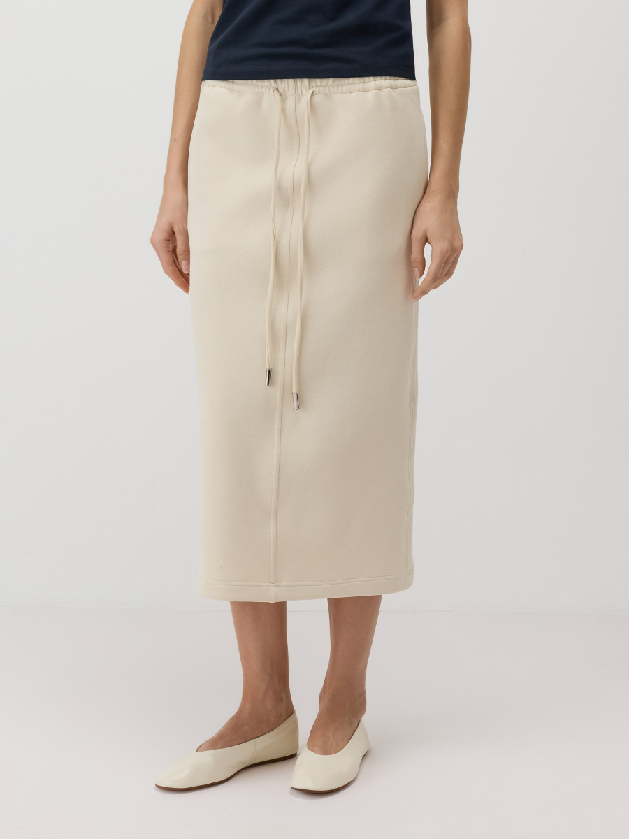 Юбка миди из мягкого неофутера на основе хлопка. Выполнена с отсылкой к классической модели-карандаш: с прямым вертикальным швом по переду, имитацией прорезных карманов на спинке и шлицей. Пояс собран на мягкую резинку и дополнен шнуром, а боковые карманы в швах добавляют изделию практичности.