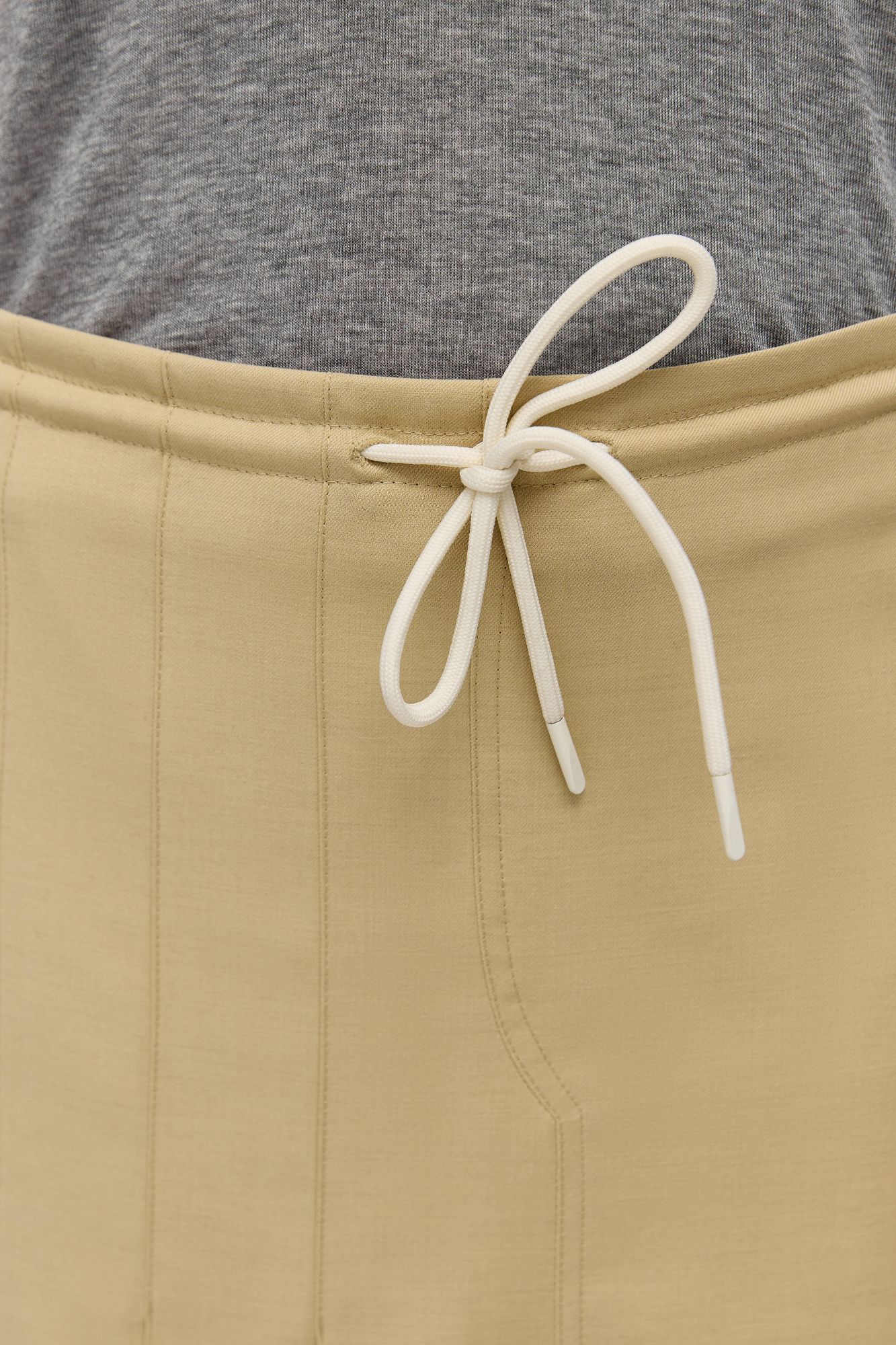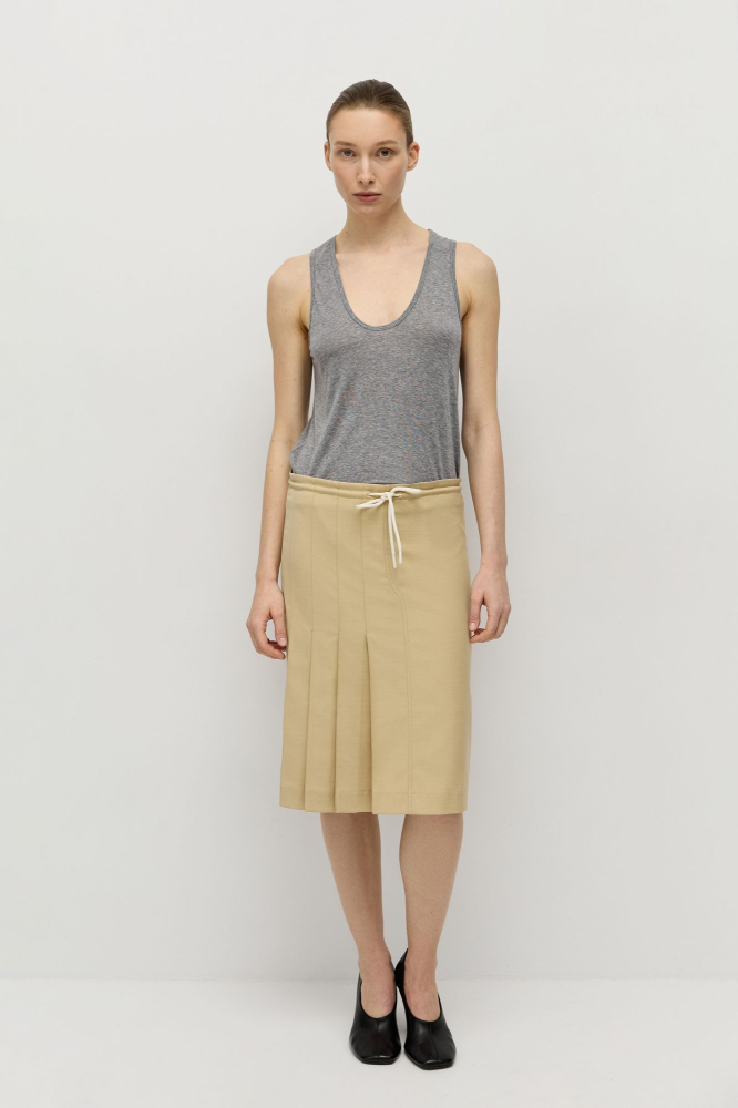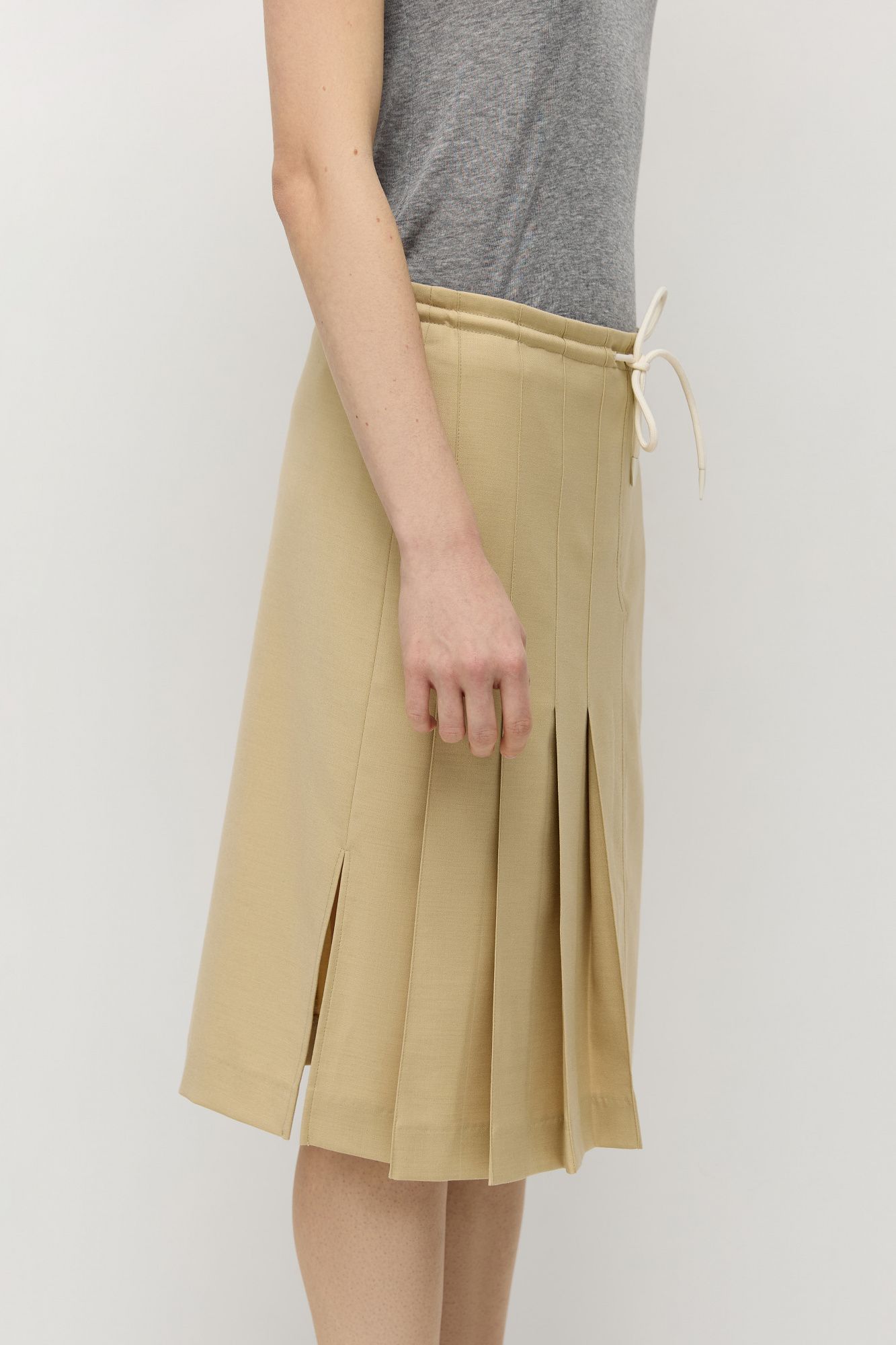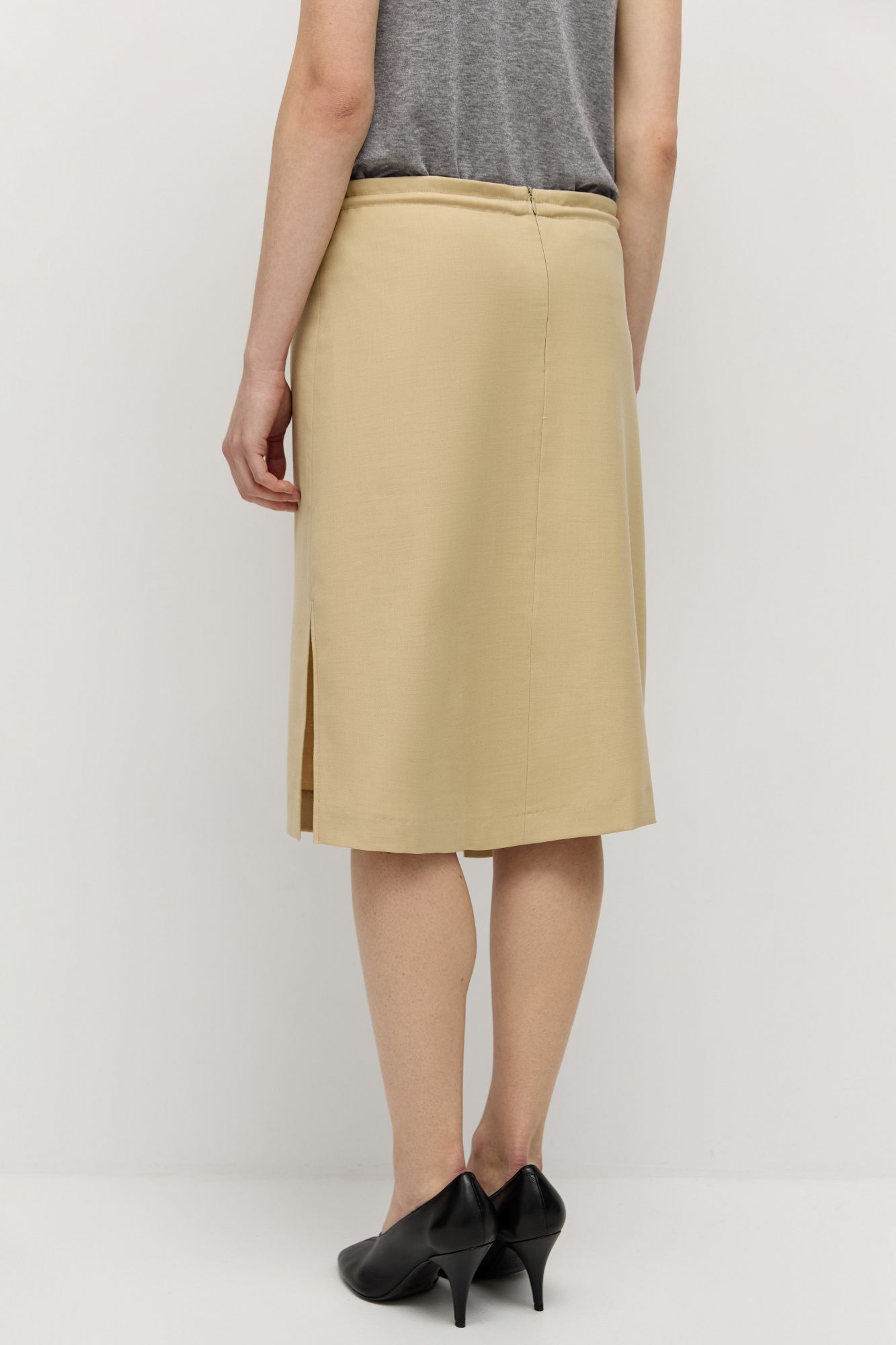 У юбки слегка трапецевидная форма, средняя посадка, внутри кулиски есть шнур для регулировки посадки. Передняя часть юбки состоит из двух частей: правая половина в фактурную складку, левая половина гладкая.