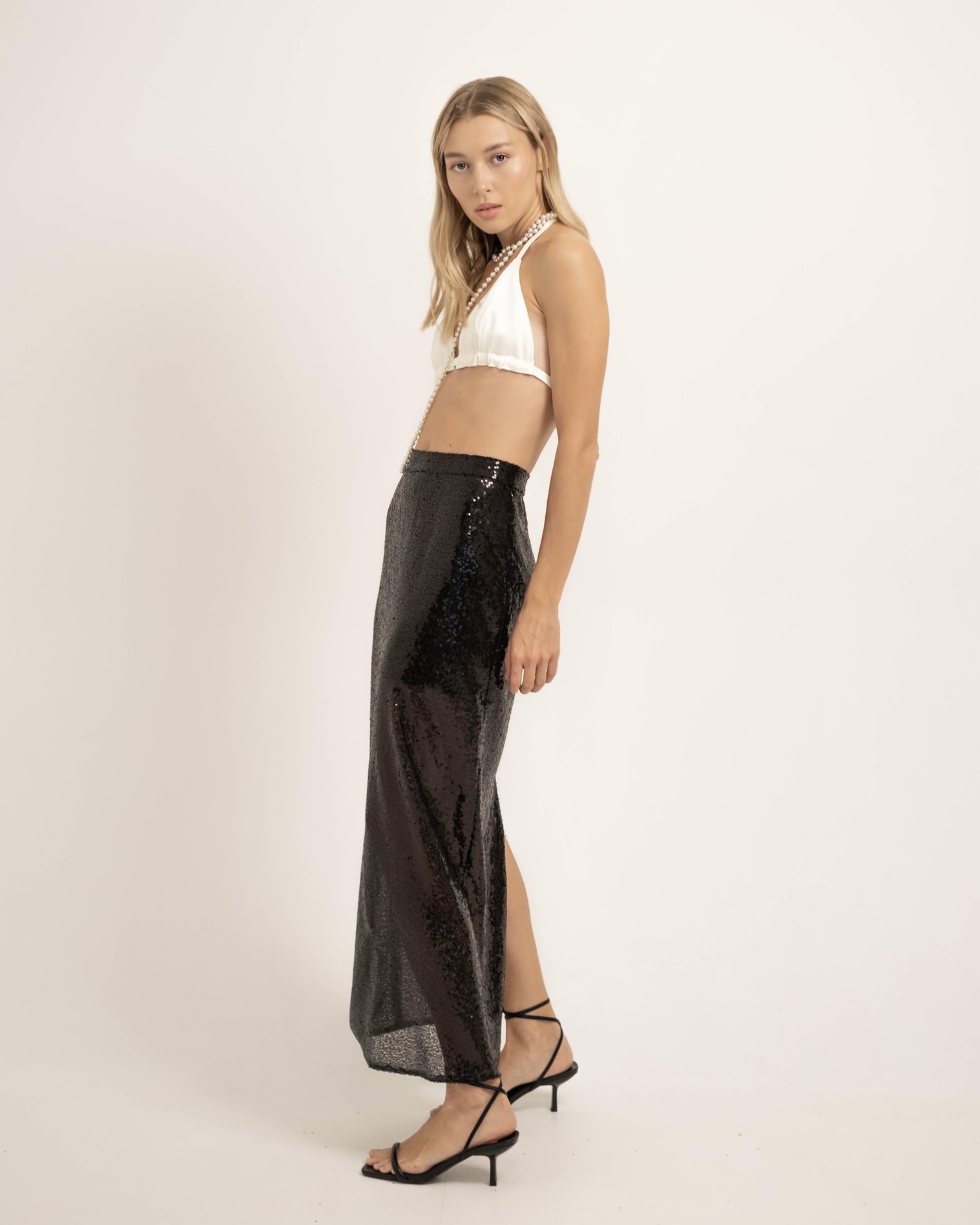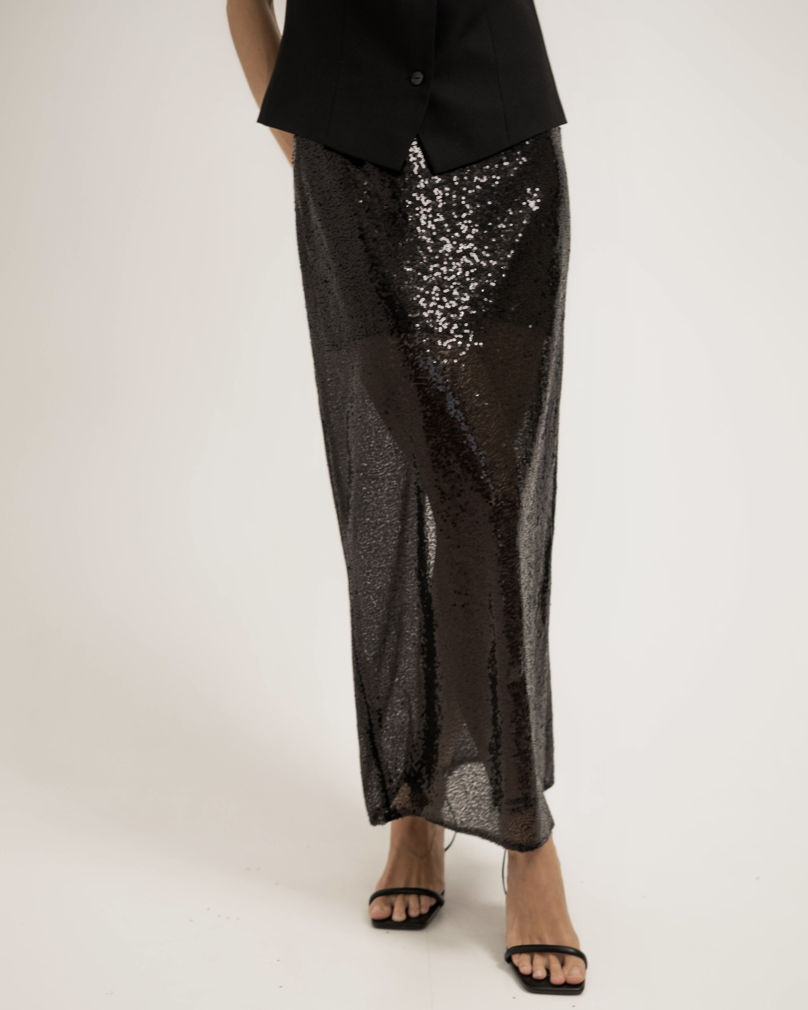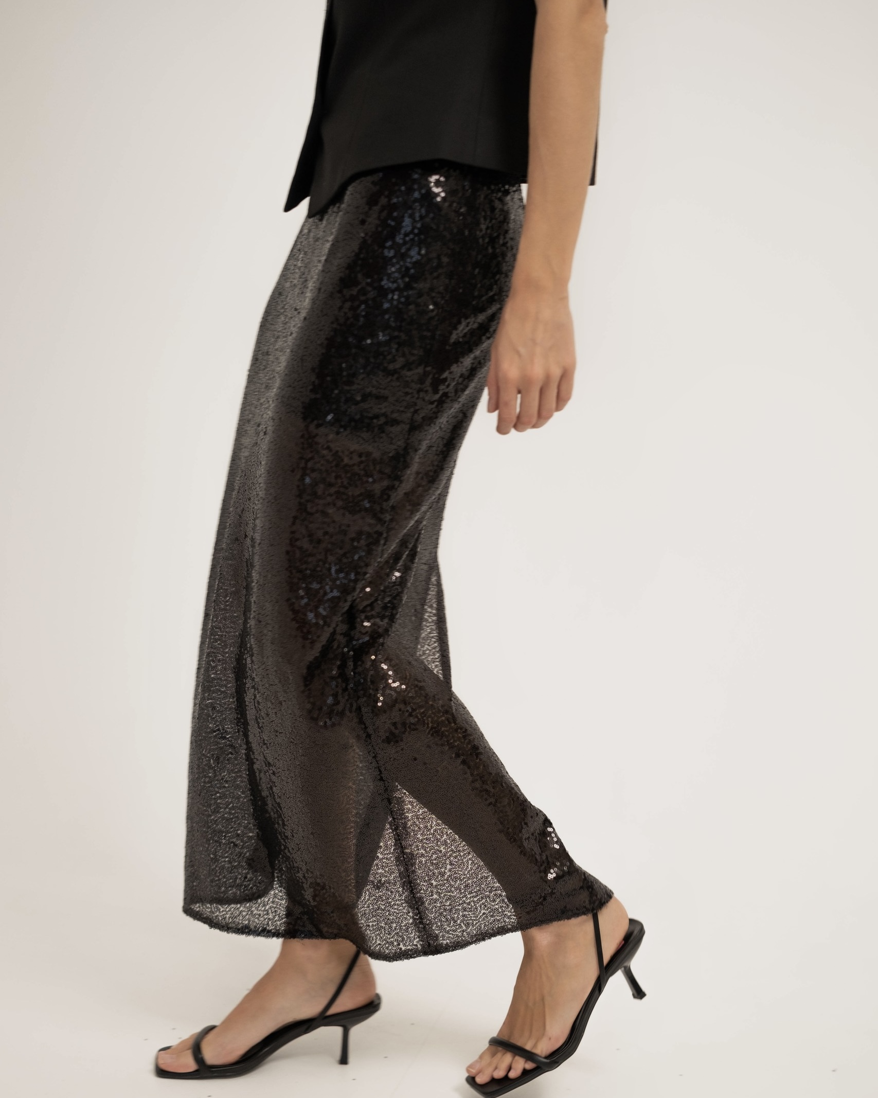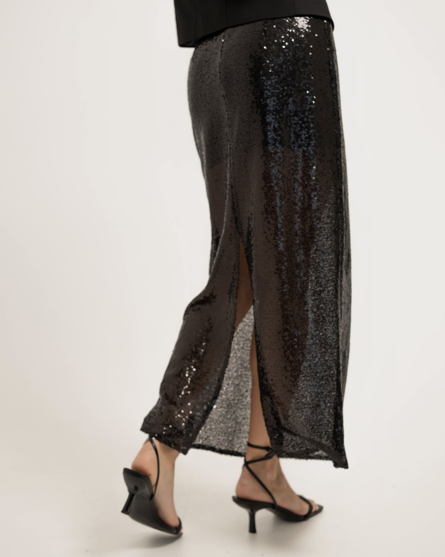 Юбка миди из пайеток — воплощение роскоши и праздника для новогодней вечеринки. Ее блестящая поверхность деликатно мерцает, создавая эффектный и незабываемый образ. Средняя длина подчеркивает элегантность, а сверкающие пайетки придают наряду особую магию