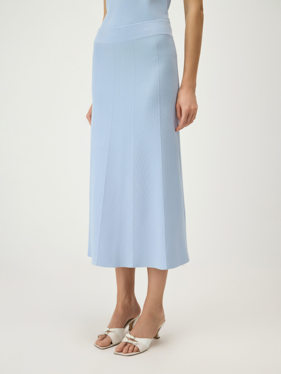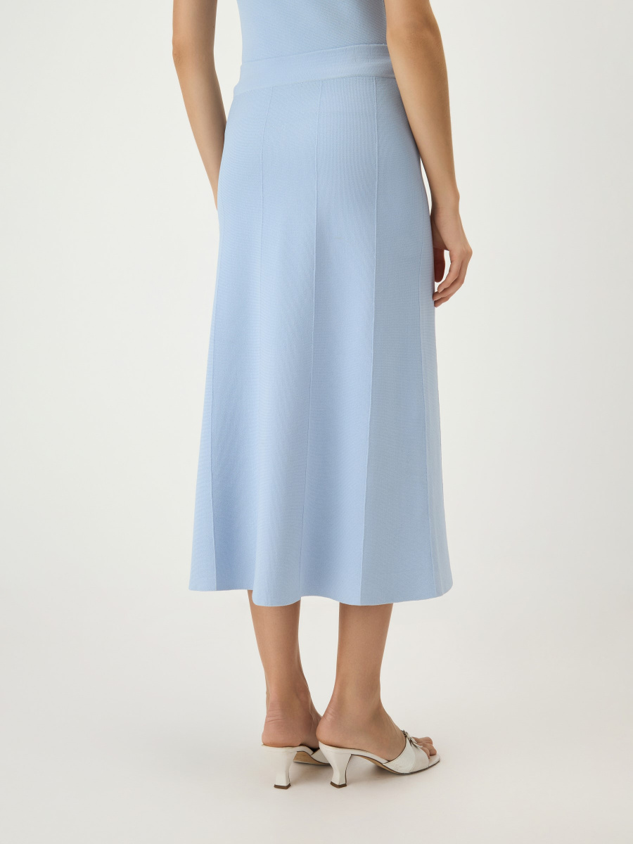 Юбка миди А-силуэта из плотного трикотажа на основе вискозы с добавлением нейлона хорошо держит форму и формирует графичный силуэт. Горизонтальная вязка создает мягкие драпировки, а вывязанные вертикальные стрелки визуально вытягивают фигуру. Двухслойный эластичный пояс мягко фиксирует изделие и позволяет варьировать посадку с учетом роста и высоты обуви.