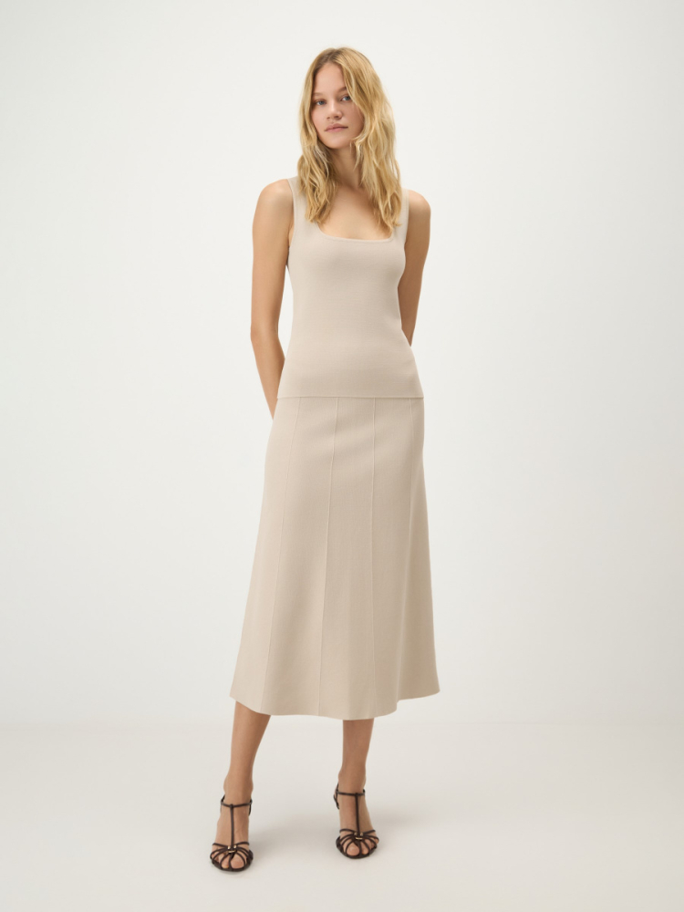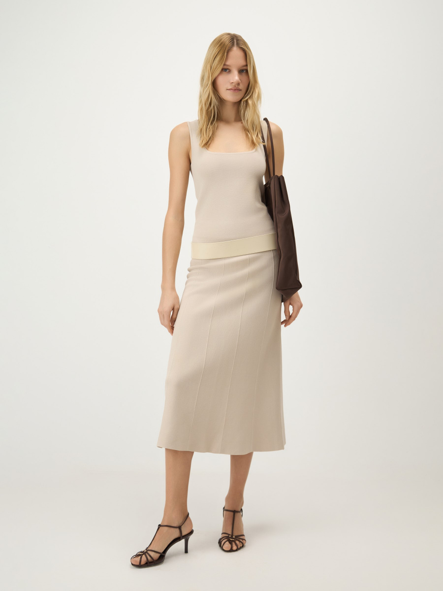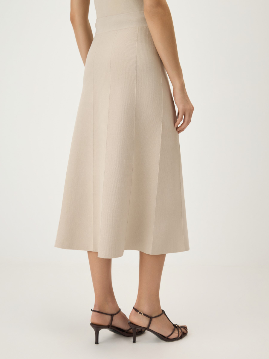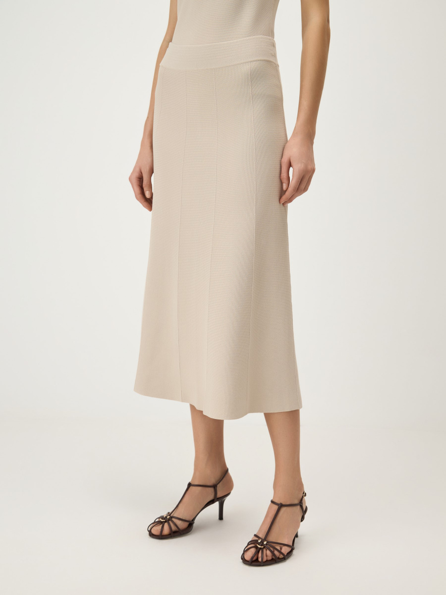 Юбка миди А-силуэта из плотного трикотажа на основе вискозы с добавлением нейлона хорошо держит форму и формирует графичный силуэт. Горизонтальная вязка создает мягкие драпировки, а вывязанные вертикальные стрелки визуально вытягивают фигуру. Двухслойный эластичный пояс мягко фиксирует изделие и позволяет варьировать посадку с учетом роста и высоты обуви.