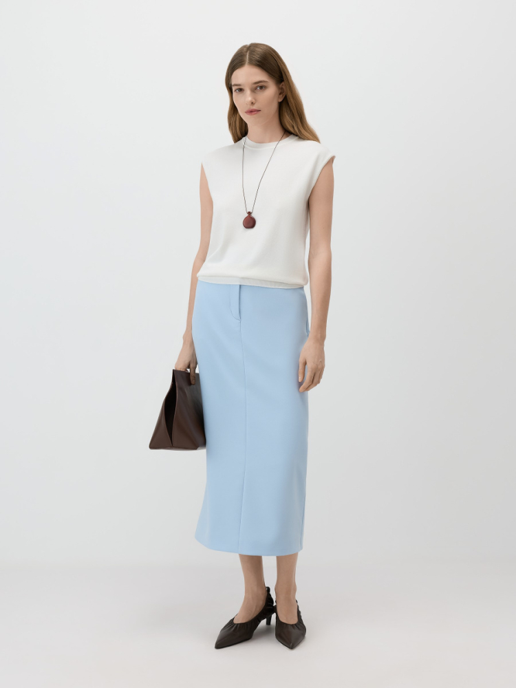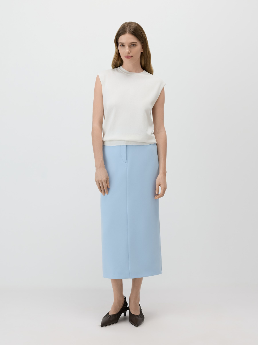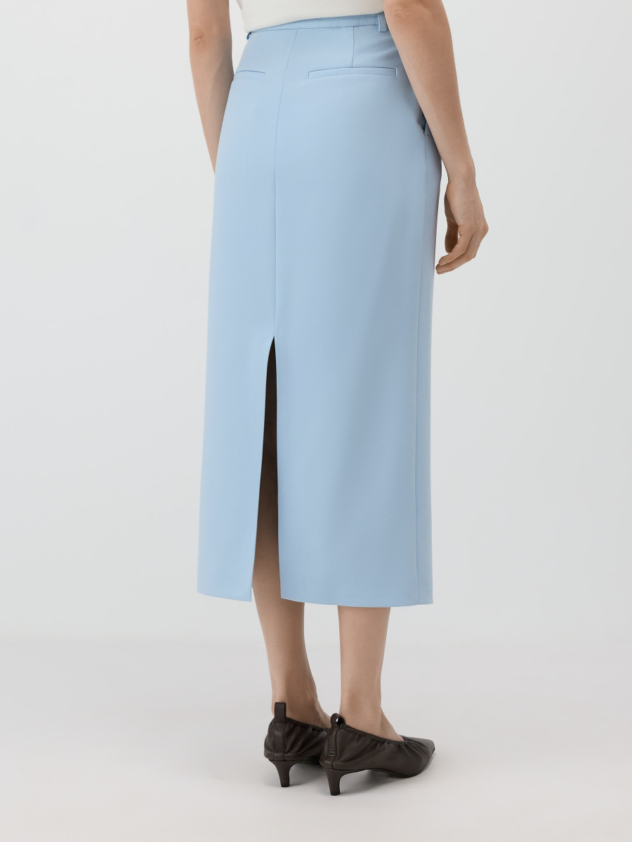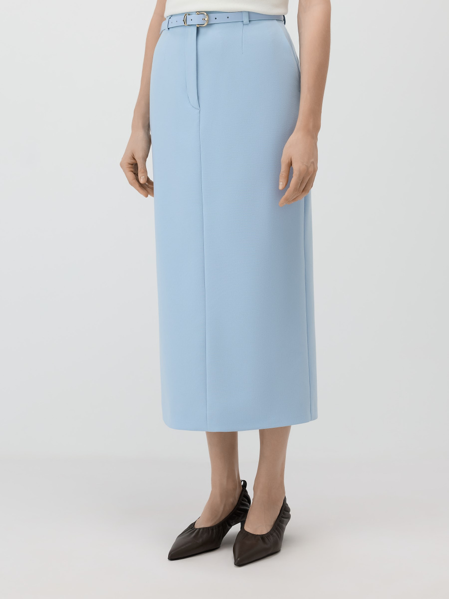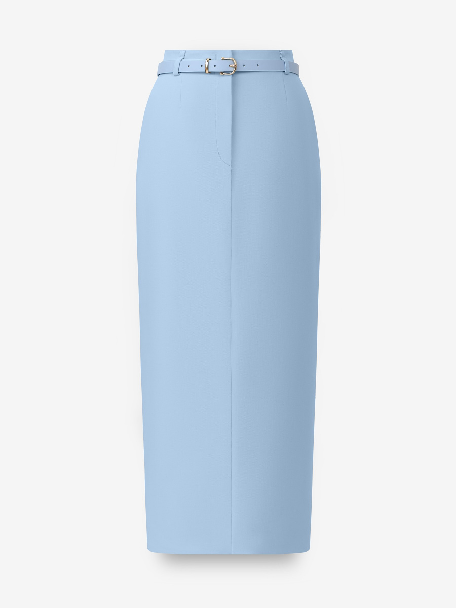 Прямая юбка миди из немнущейся костюмной поливискозы, ориентированная на теплый сезон. Сложного кроя, с эластичной вставкой на поясе для моделирования посадки и раскрытой шлицей, обеспечивающей свободный шаг. Шлевки, функциональные боковые и задние карманы-имитации, скользящая подкладка по всей длине, застежка на молнию, крючок и пуговицу. В комплекте ремень из экокожи в тон.