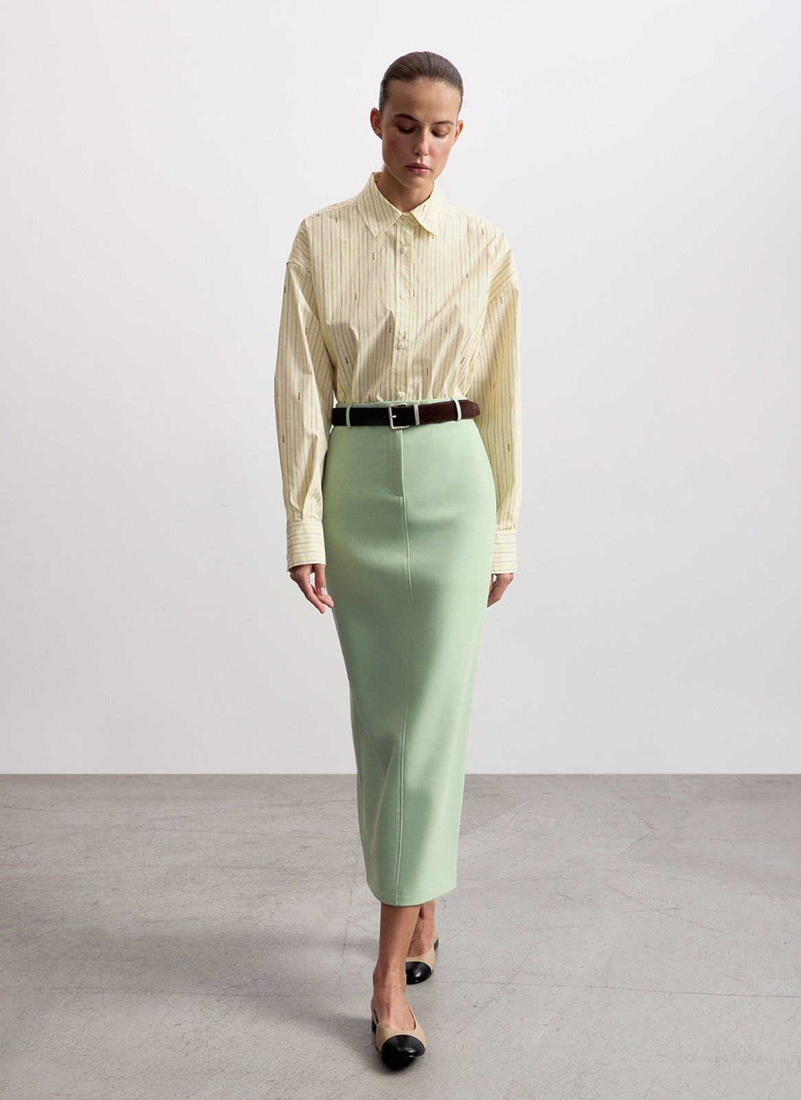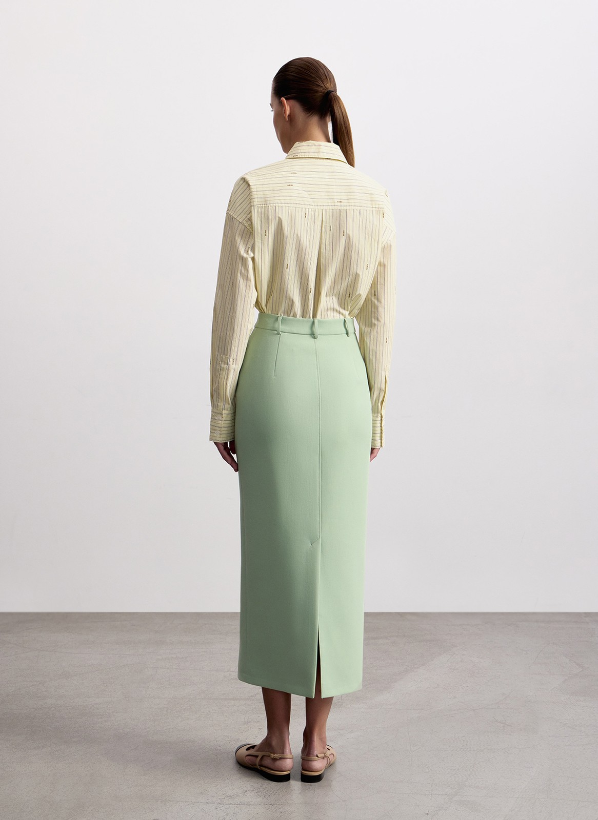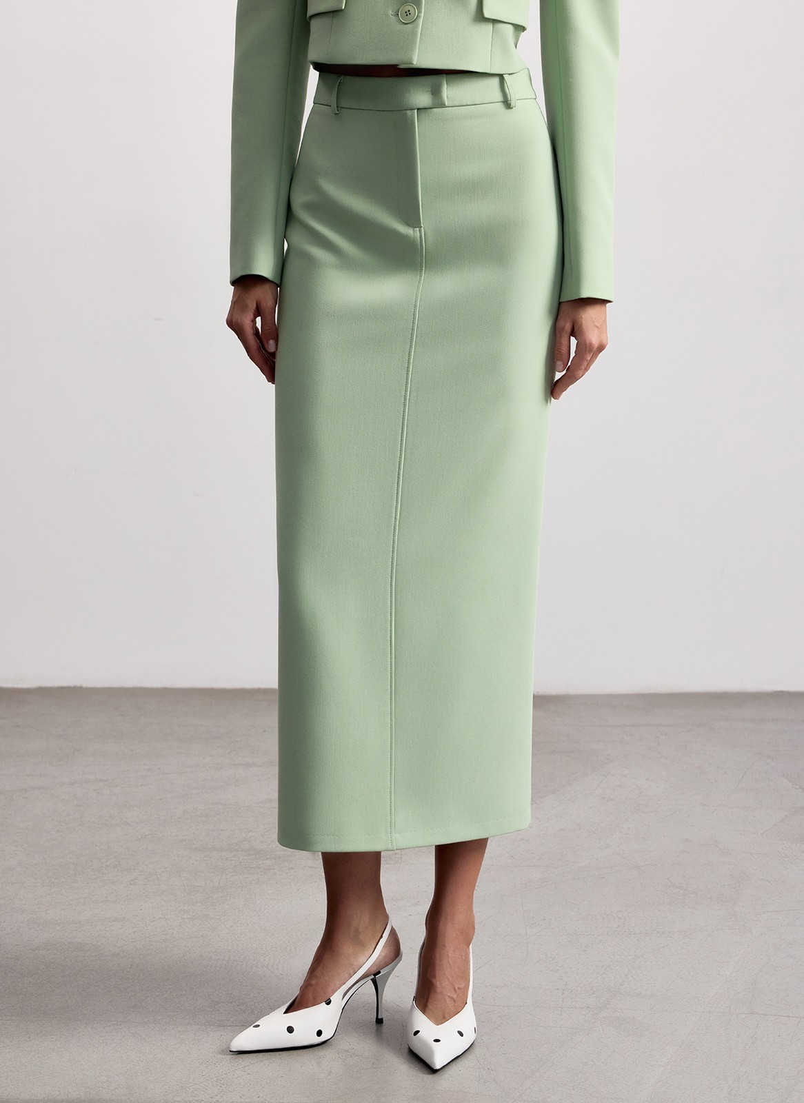 Прямой, чуть облегающий крой подчёркивает фигуру, а шлица обеспечивает комфорт при ходьбе.